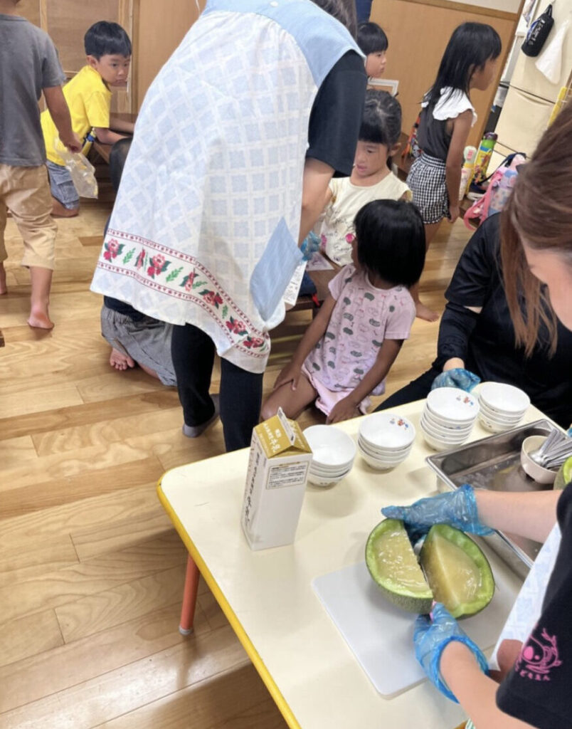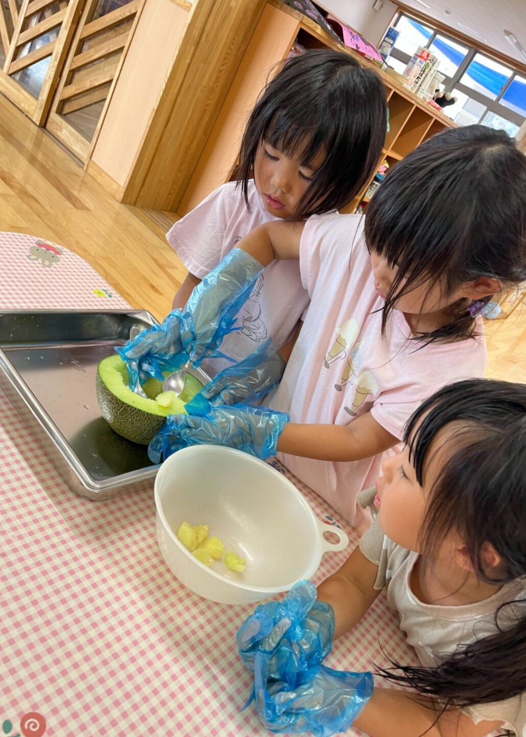 前日にこども達が作った、メロンゼリーを切って食べました。