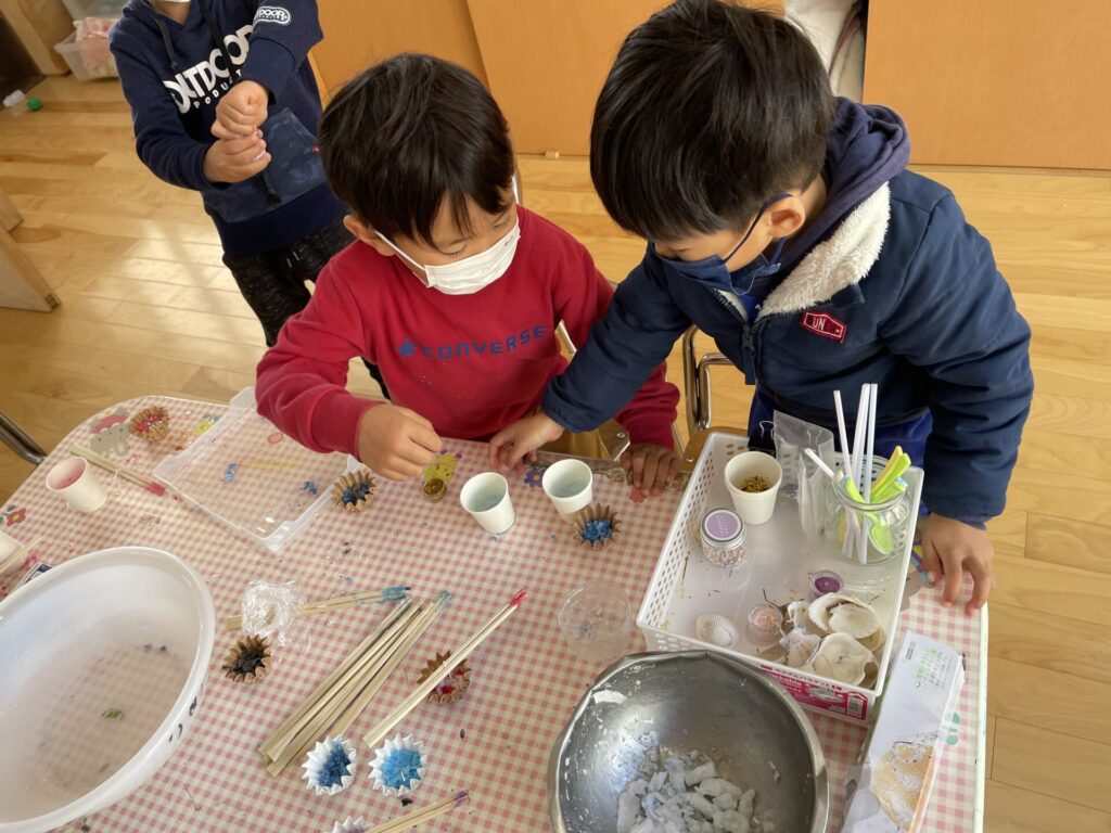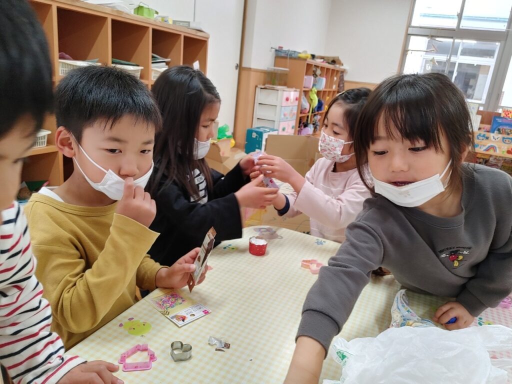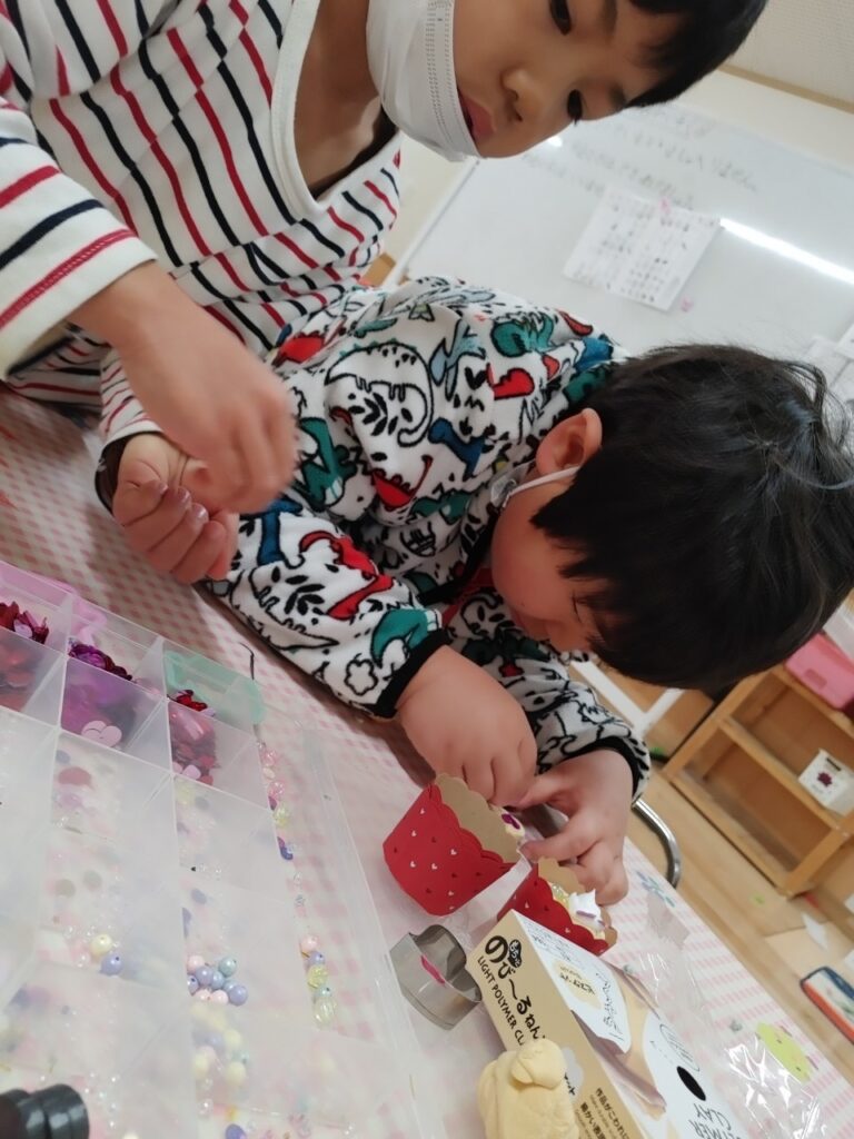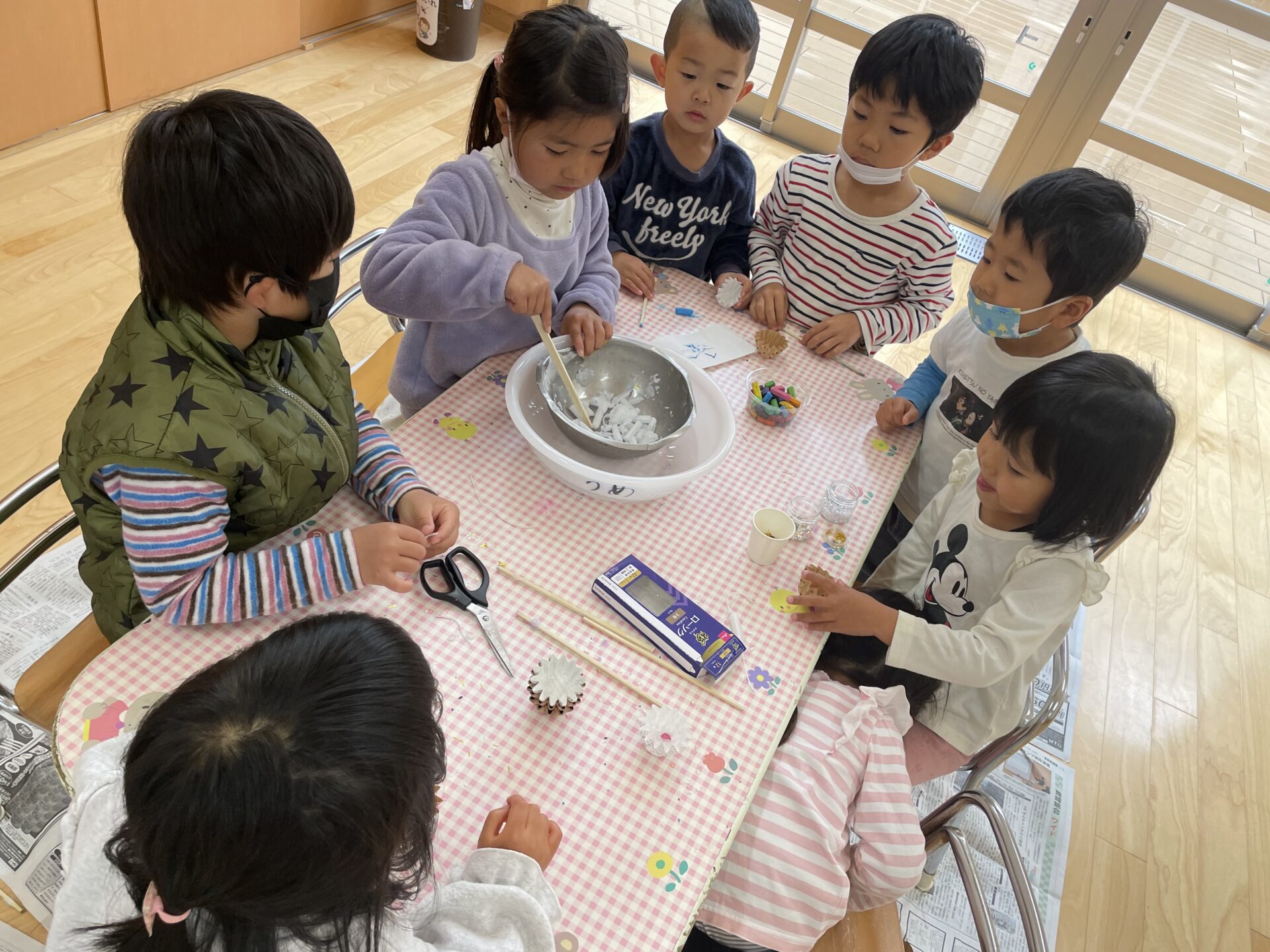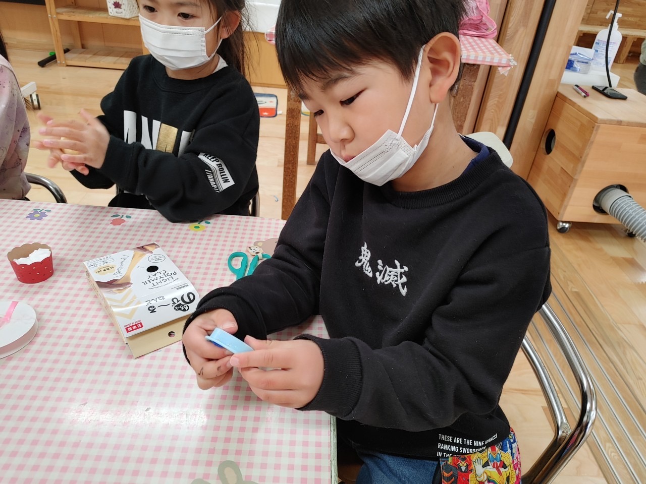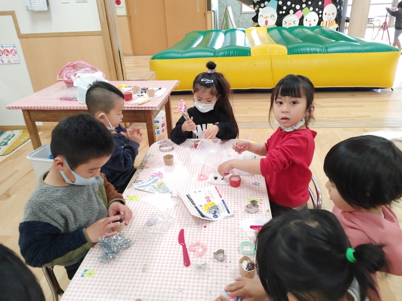 以上児さんでは、紙粘土でカップケーキマグネットや、ロウソクと短くなったクレヨンでキャンドル作りをしました。手先を使う細かい作業でしたが、集中して作っていたり、こだわりを持ちながら進めている姿もありました。完成したとっても可愛い作品は、おうちの方にプレゼントで持って帰りました♥
