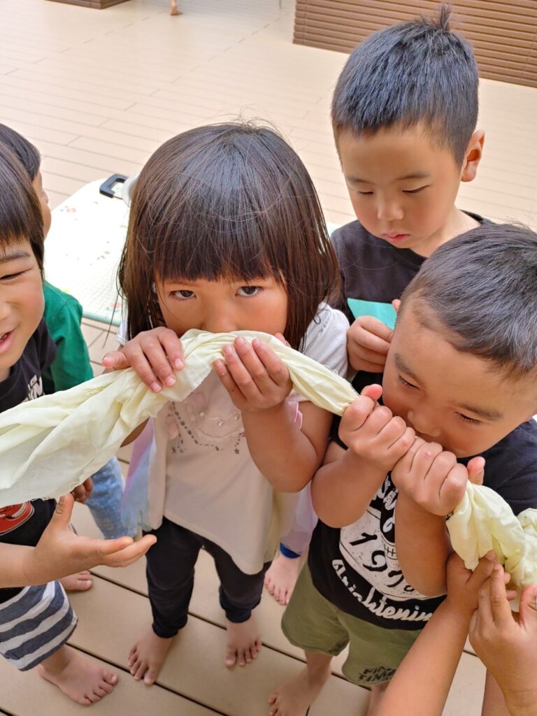 前回、玉ねぎの皮を使って染め布遊びをした子ども達。他にも色々な野菜を使ってどんな色が出るのかやってみたい!との声が上がり、第二回染め布遊びを行いました。