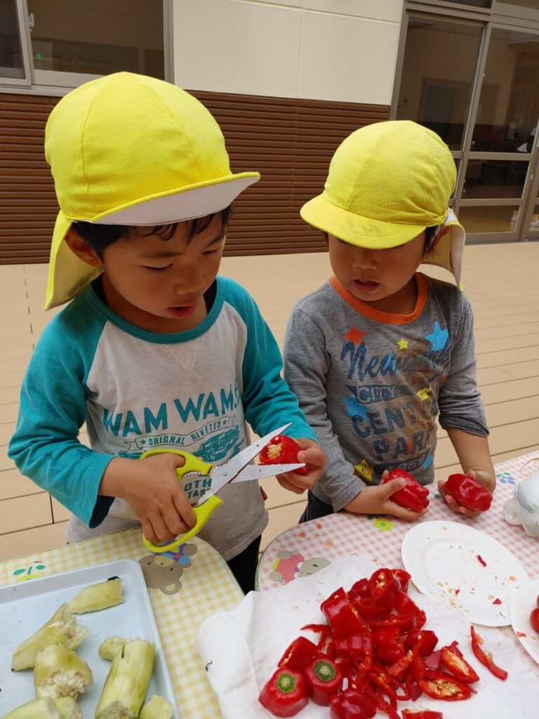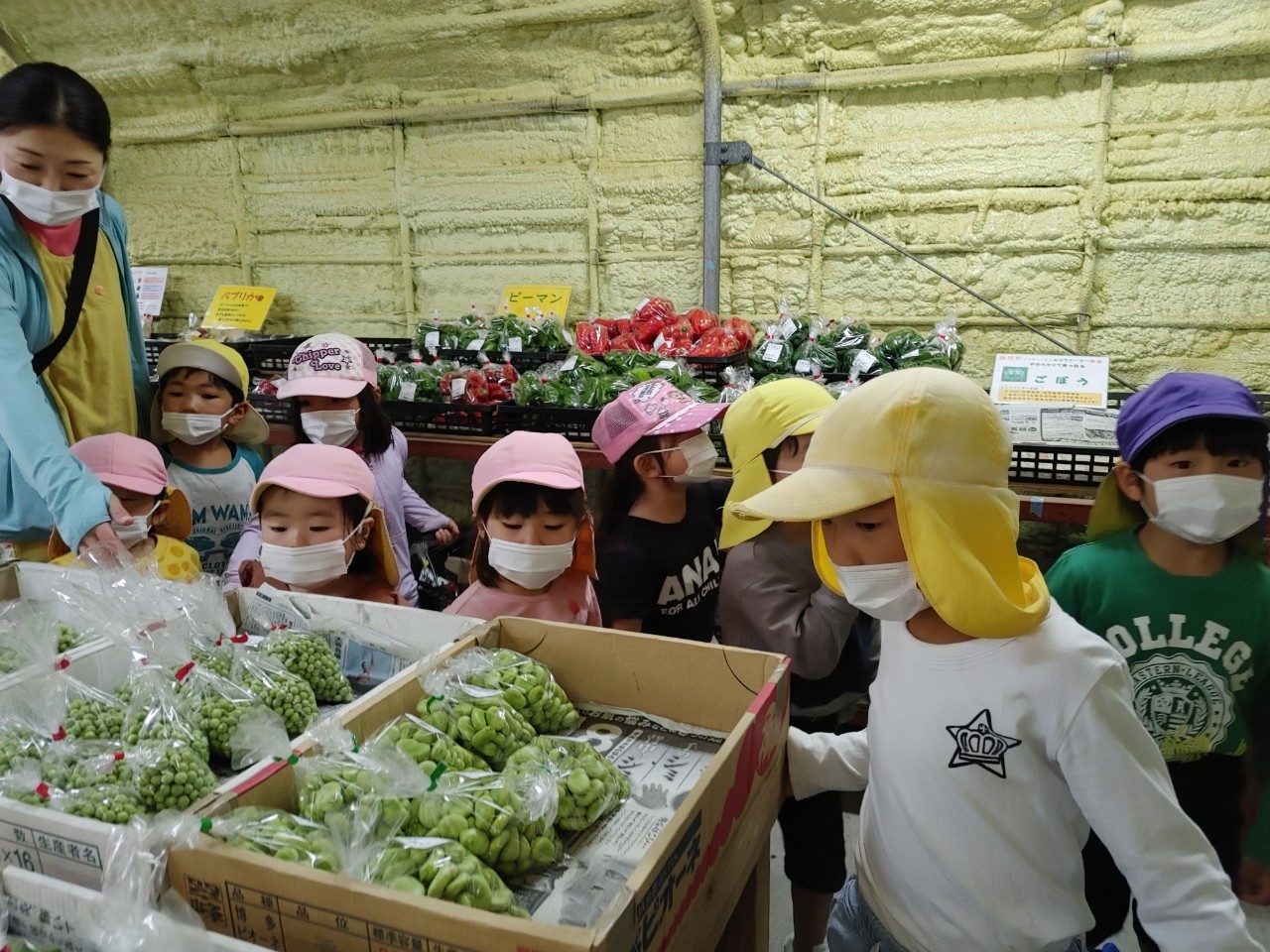 今回は、子ども達と実際に直売所に行き、どの野菜がいいかな?と話し合いをしながら選びました。人参、ほうれん草、パプリカ…お買い物を済ませ、わくわくしながら園へ持って帰りました♪