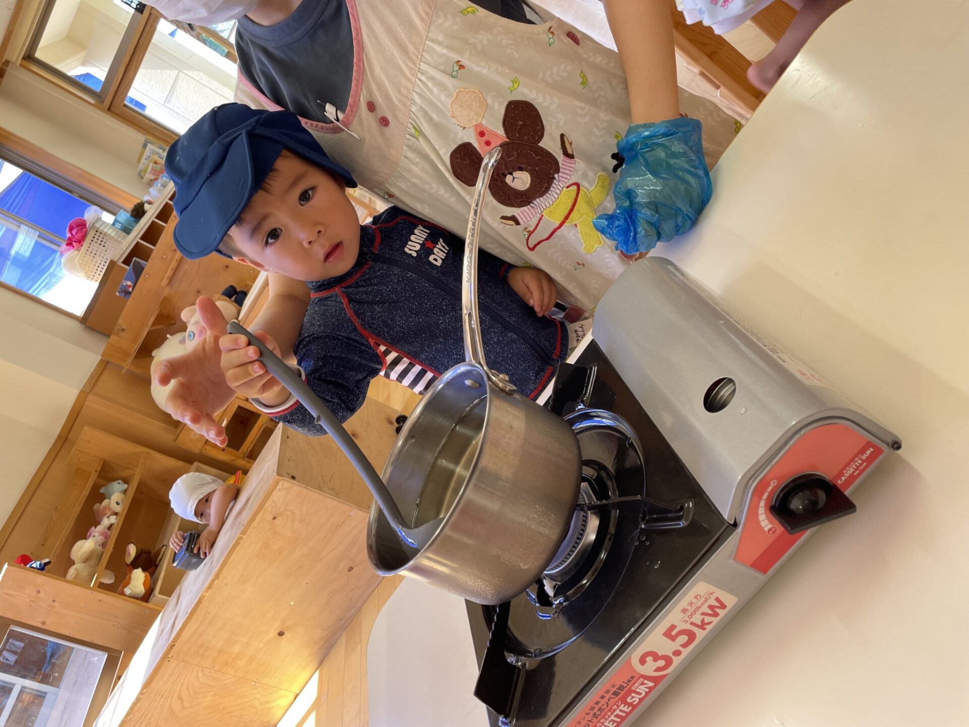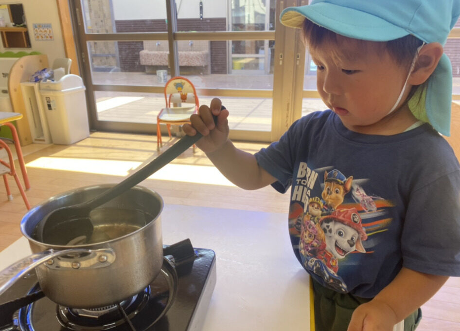 もも組さんは、シロップを煮た後に、お水で割ってうめジュースにしました。「給食の時に飲もうね!」とお約束をして、ワクワクが止まりません♩