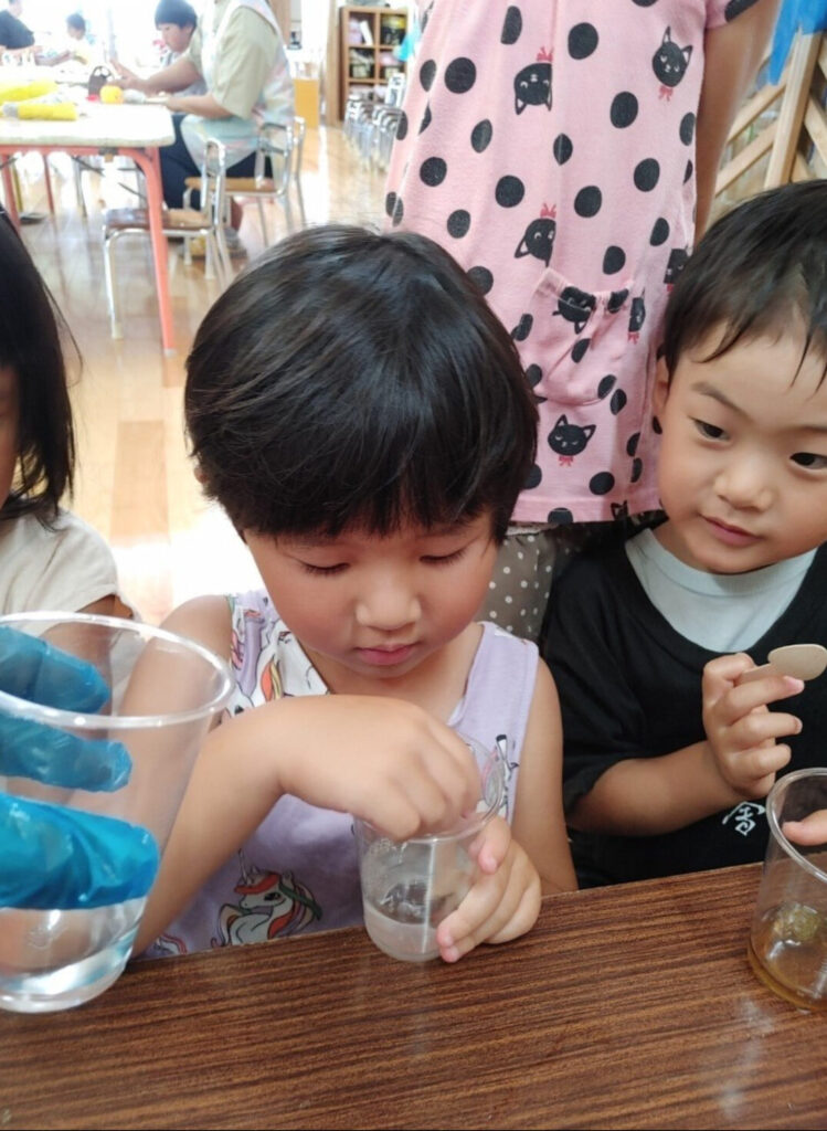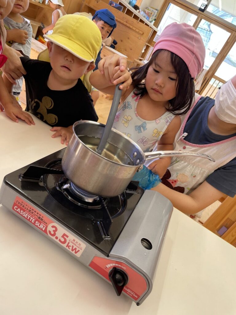 うめ組さんや、興味を持った以上児さん達は、アイスキャンディー作りに挑戦です。