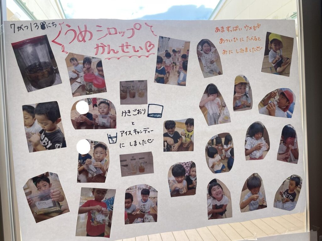 うめ組ともも組で作っていた、梅シロップがいい具合になってきたので、うめジュース、かき氷、アイスキャンディー作りをしました。