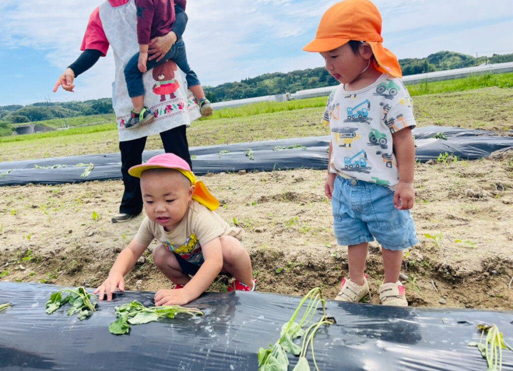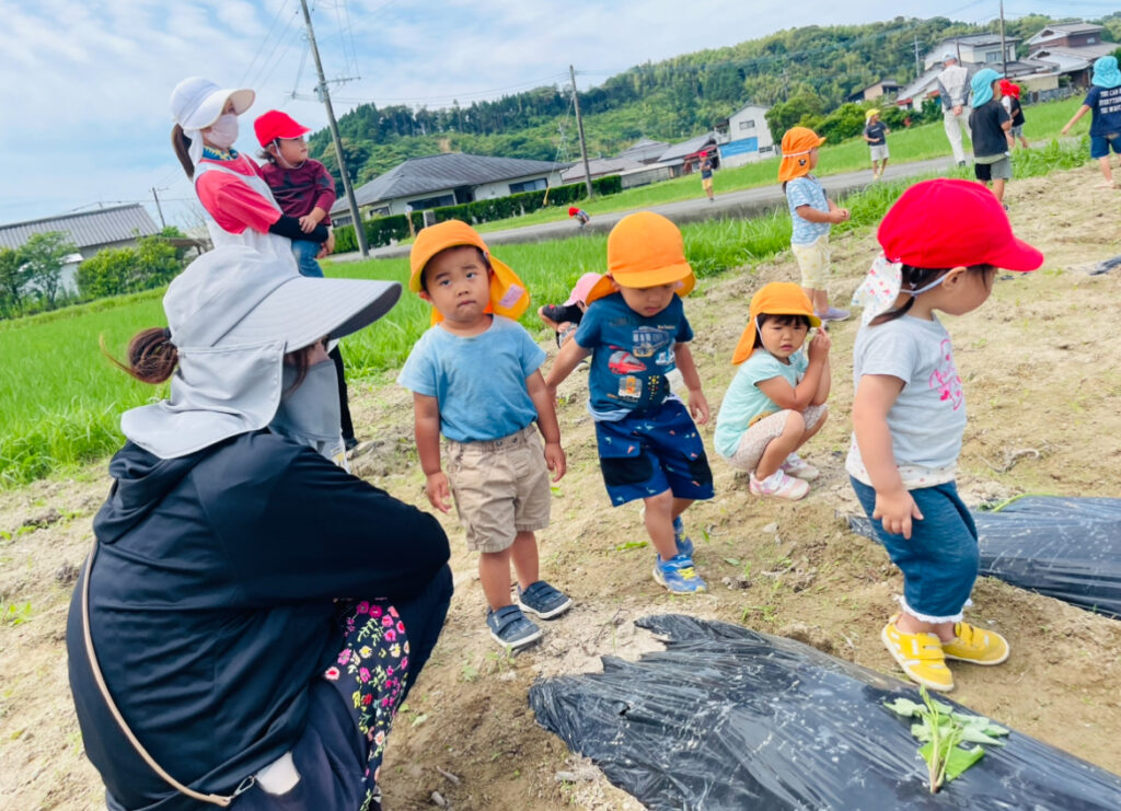 未満児さんも芋の苗を観察したり、畑の土に触ってみたりと一緒に楽しんでいました。