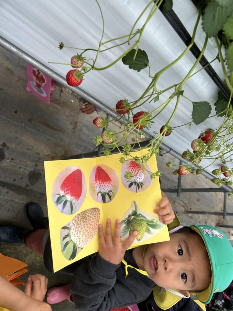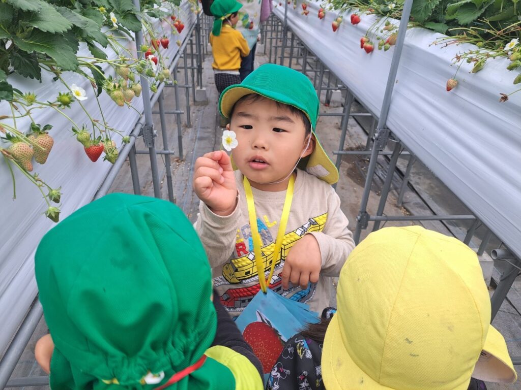 沢山の質問をしていましたよ。いちごがある場所へ行くと、真っ赤ないちごや、まだ緑色、白いお花などが見え、観察したり、赤いいちごを自分で選んでパクッと味見してみました。