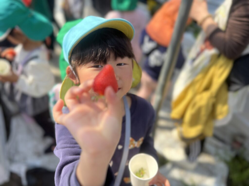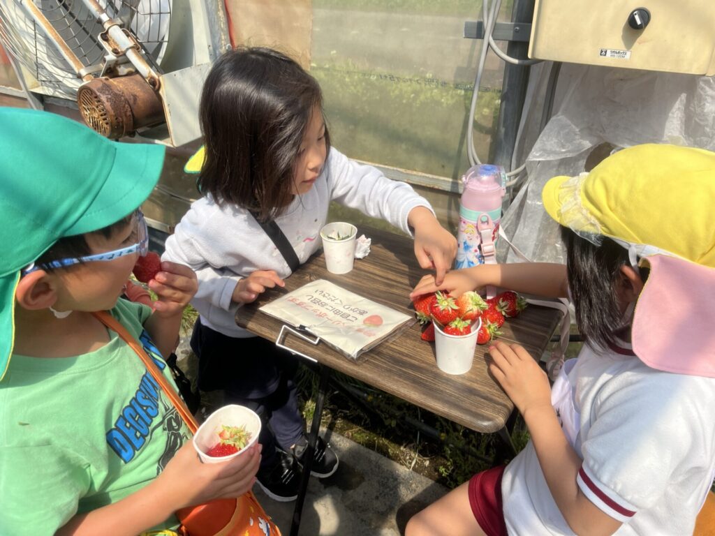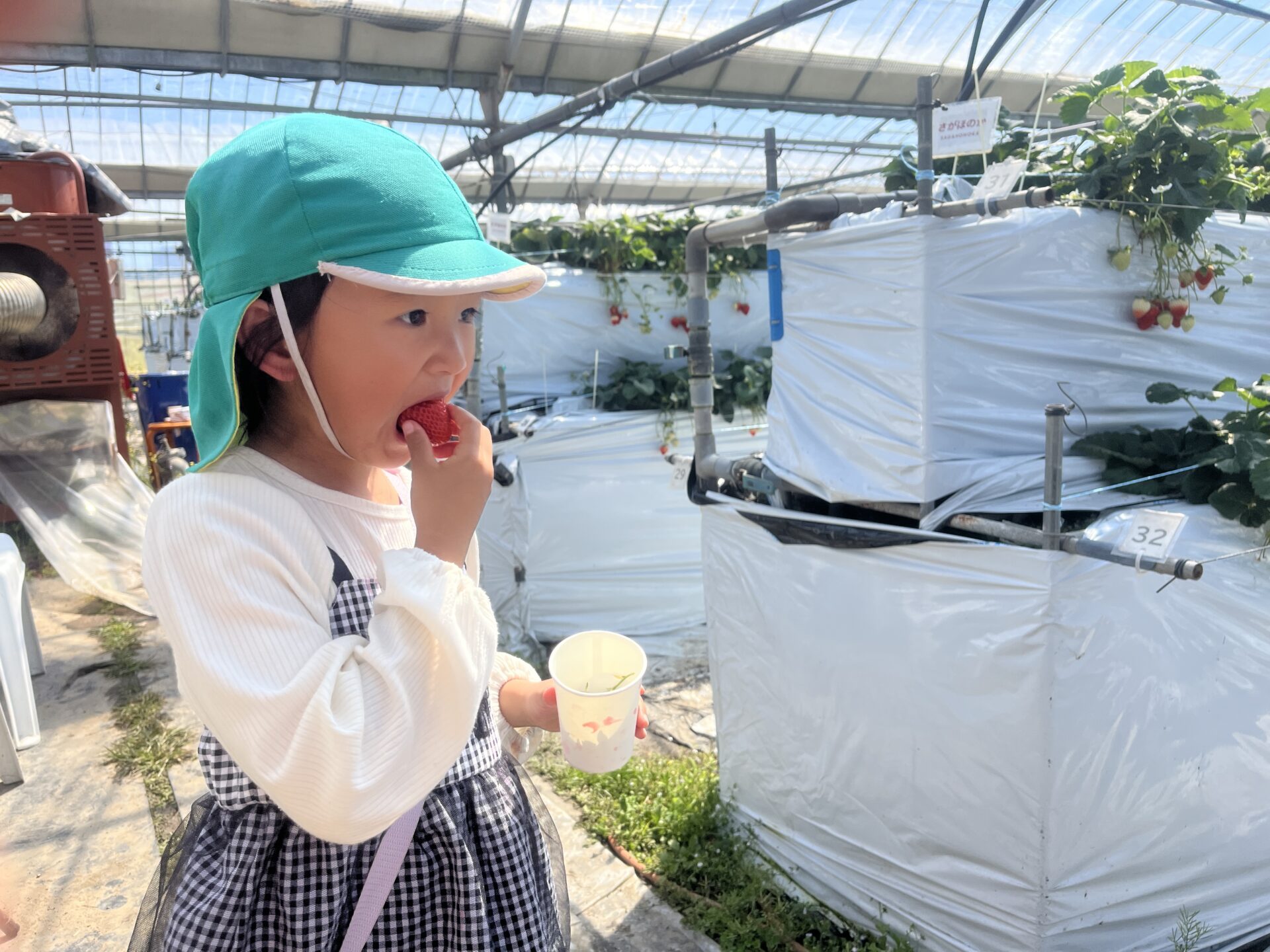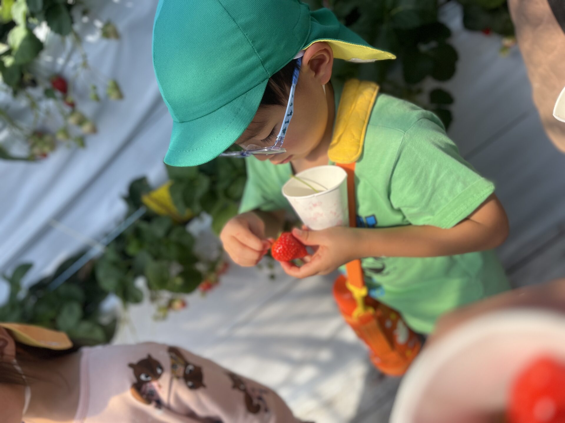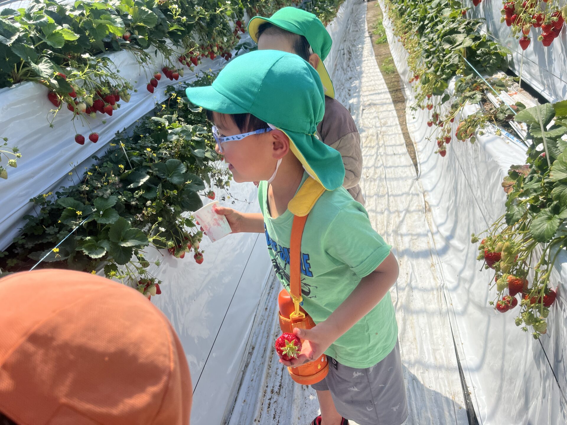 「たくさんたべるぞー!!」「大きいのたくさん見つける!」と甘くて真っ赤ないちごをパクパク食べていました😁最後には「もうたべれないー」「○○個食べた!」「大きいのたくさん見つけれたよ!」と大満足の子どもたちでした!!