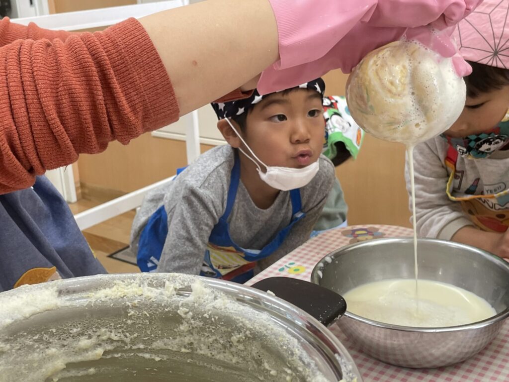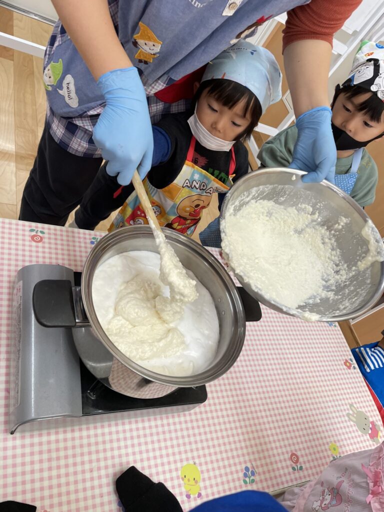 調理の工程で出来るおからや豆乳を味見すると、子どもから色んな感想が出てきてとても面白かったです★