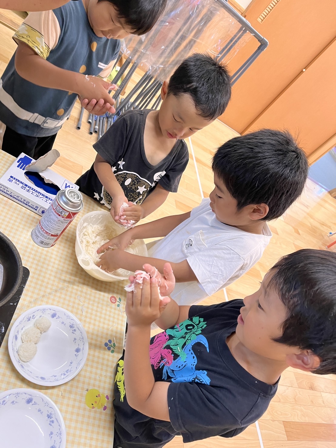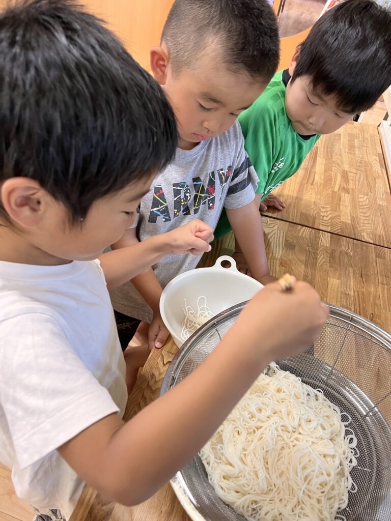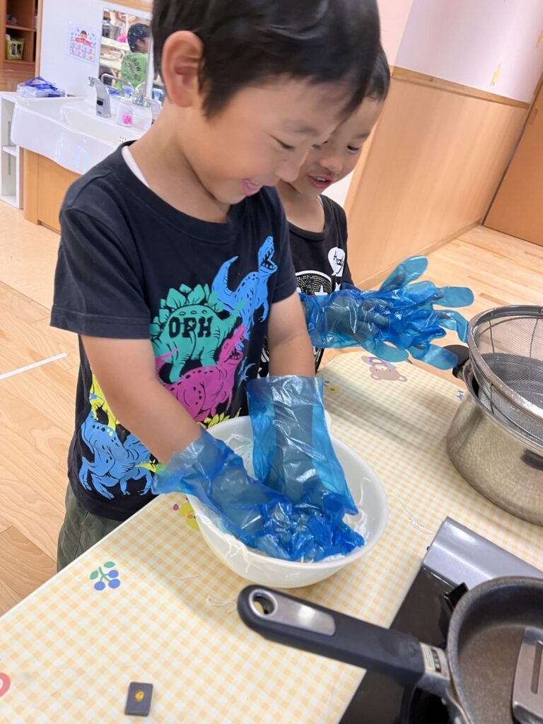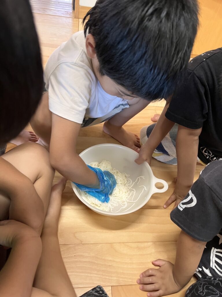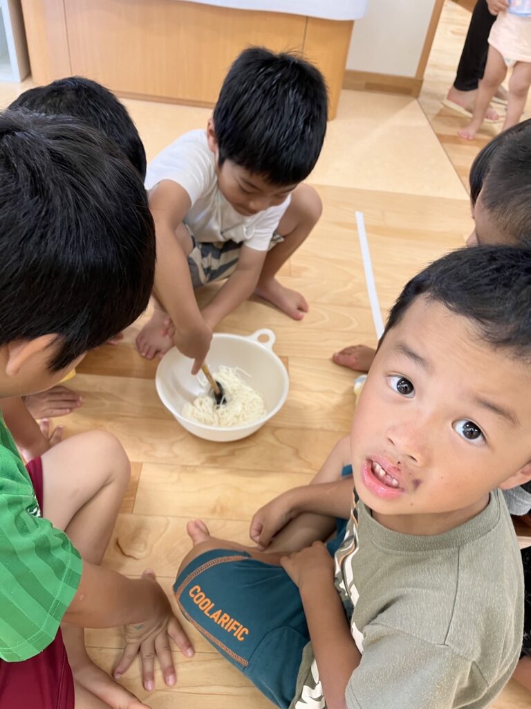 作業中の子ども達のひらめきから、そうめんお団子を実際に作ってみよう!と発展しました。
