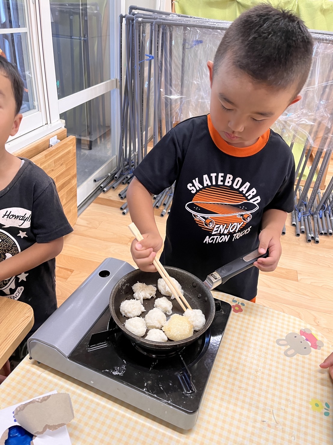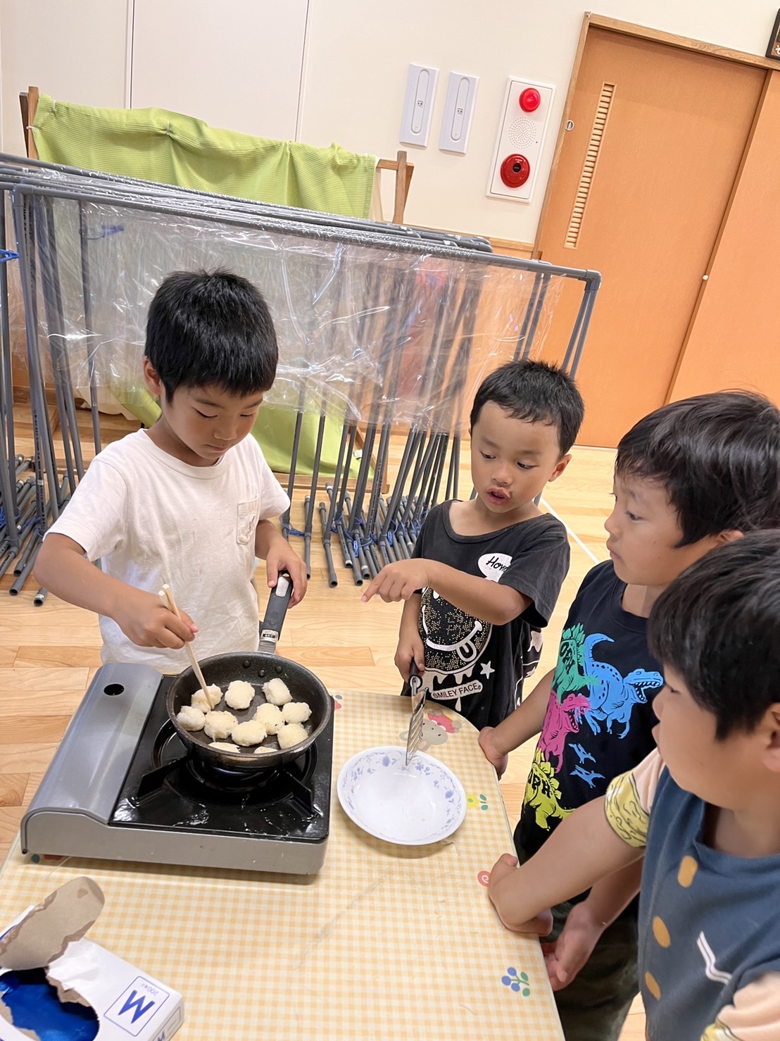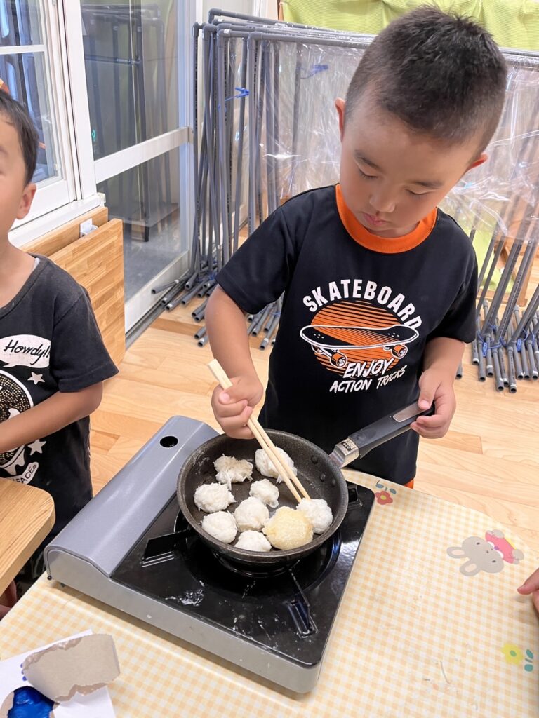 出来たお団子は、子ども達からの提案で焼いて食べることに。味見をすると『味がしない、、』考えた子ども達は『おしょうゆくださーい』と味付けまで自分たちの力で進めていました。