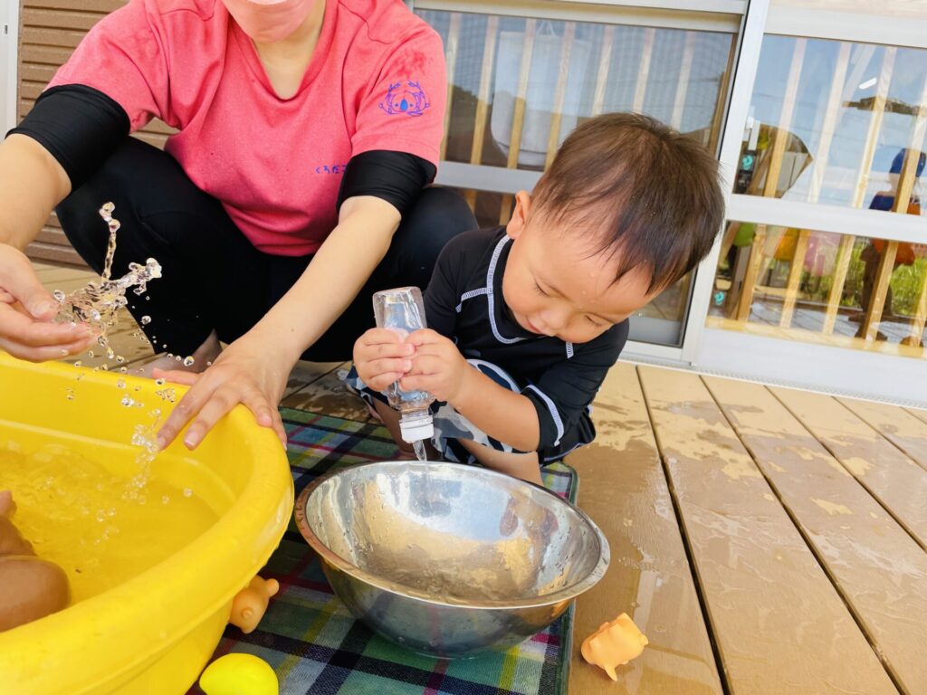 したり、水遊びの楽しさや気持ちよさを、子ども達それぞれ味わっている