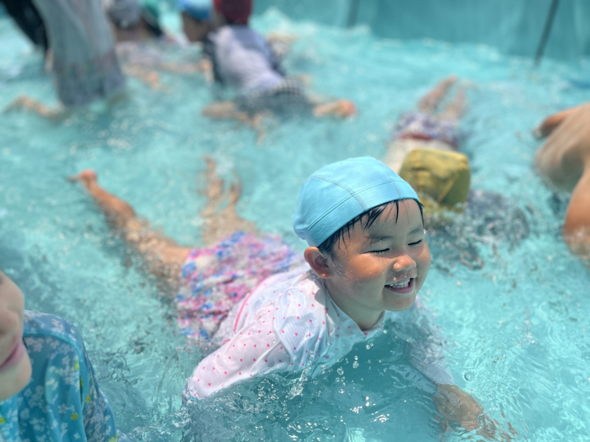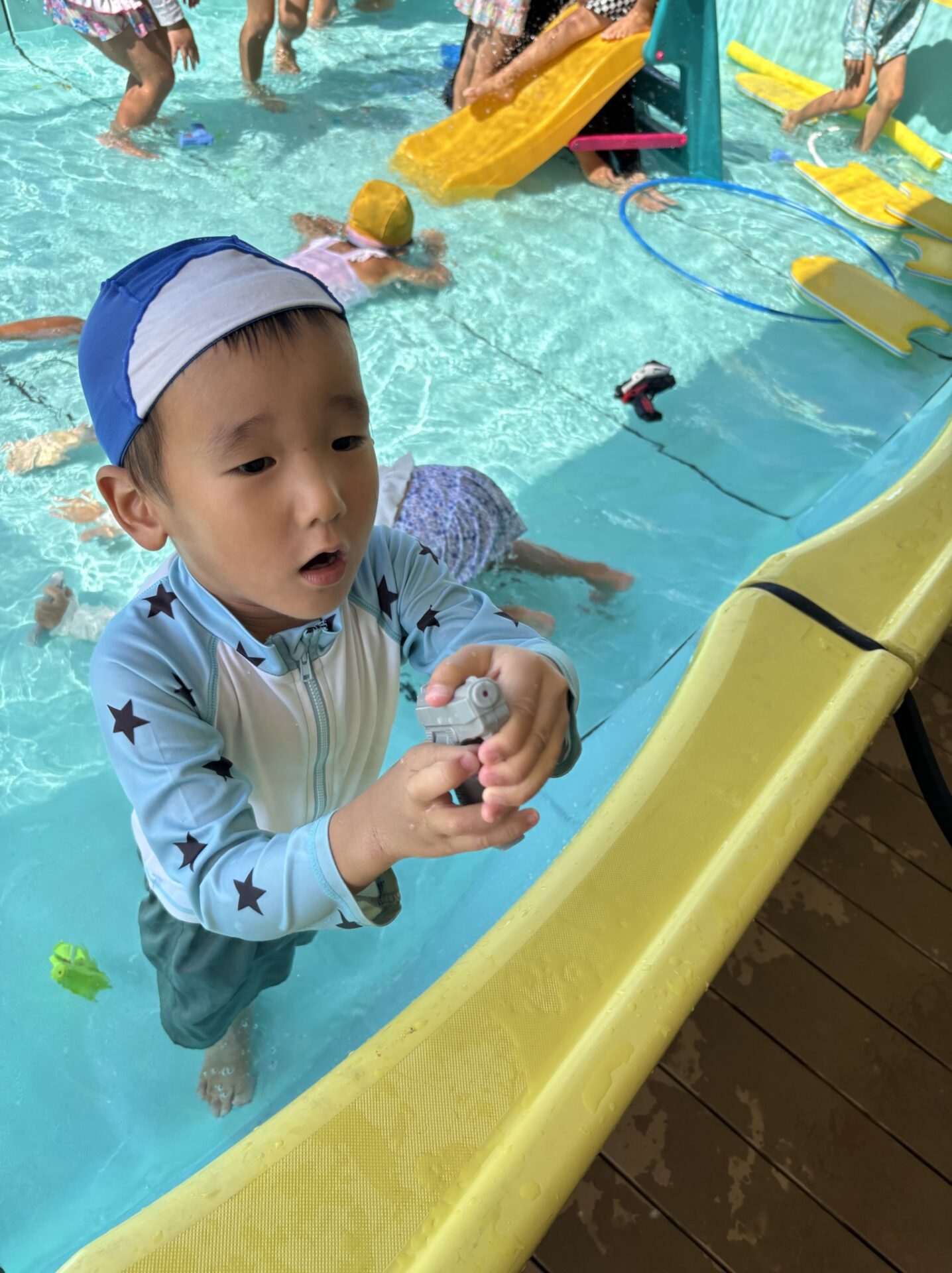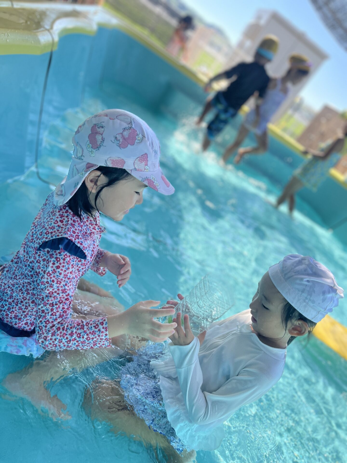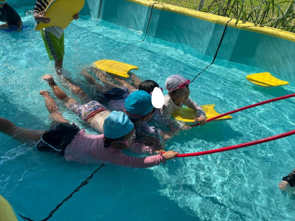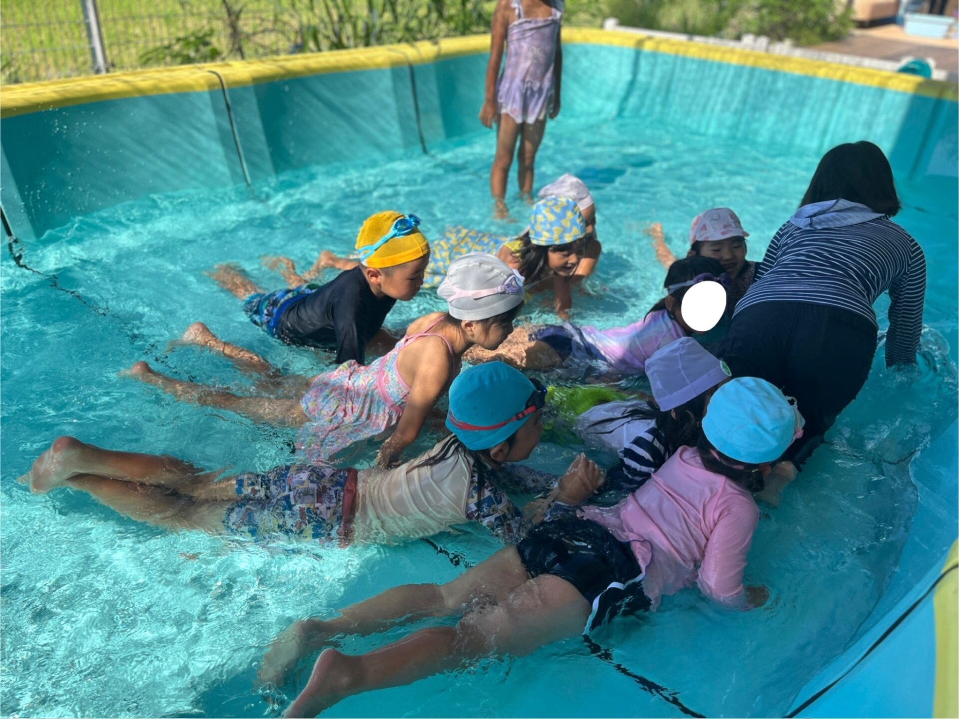 子どもたちはいつもプールを楽しみにしており、「きょうなんばん?」「はやくはいりたい!!」とワクワク☺プールに入ると、フープを使って「せんせい、ひっぱって」と引っ張ってもらったり、宝石遊び、「せんせーまってー!」と先生にみんなでつかまったりといつも楽しそうな声がたくさん聞こえてきます♪