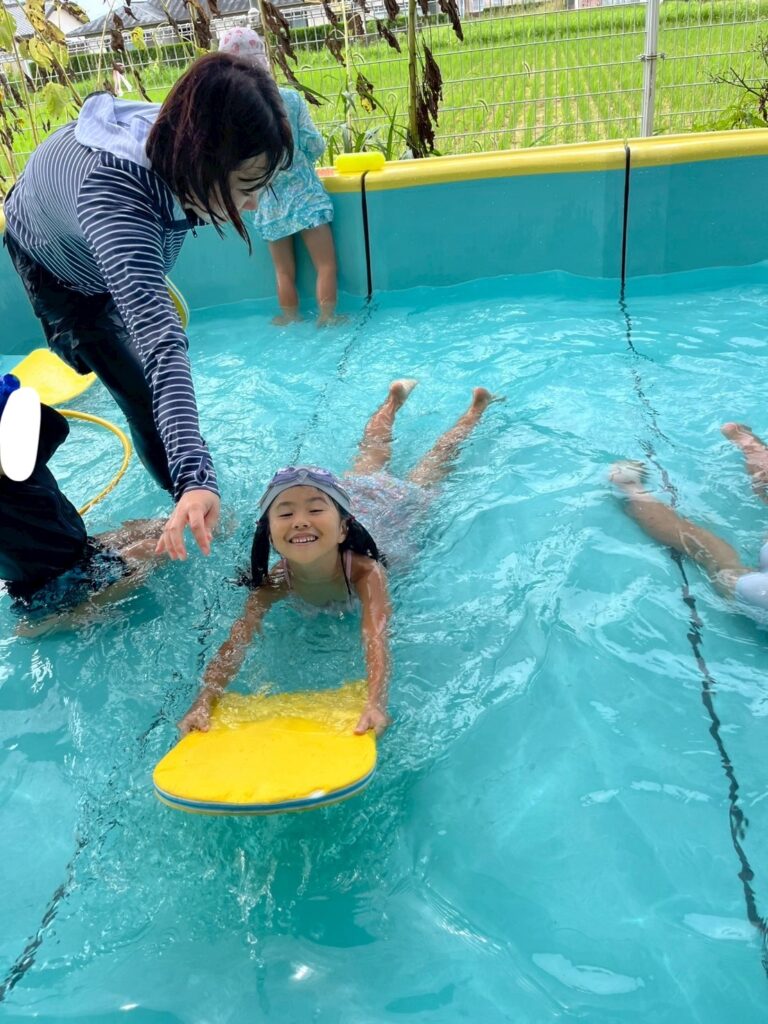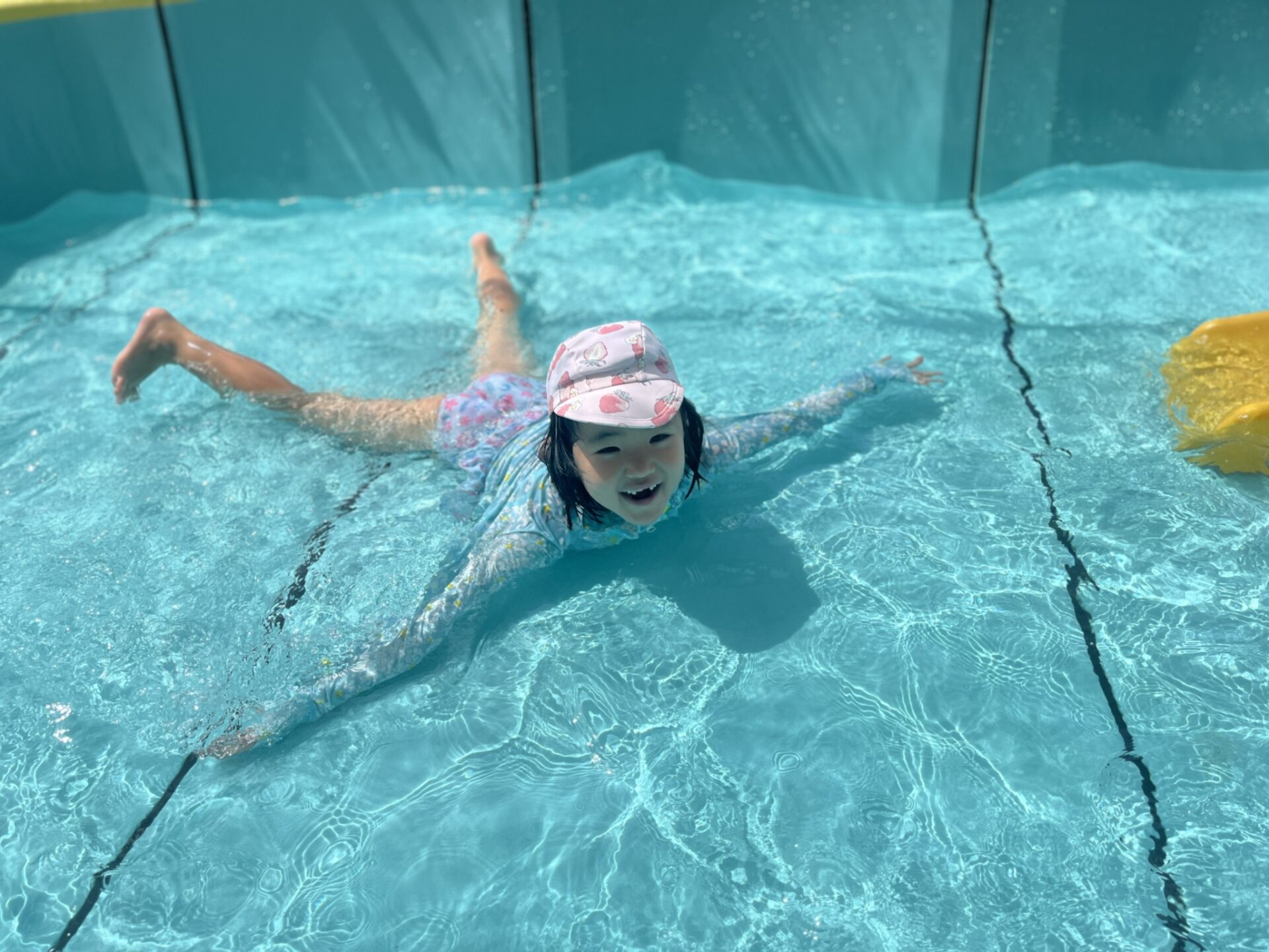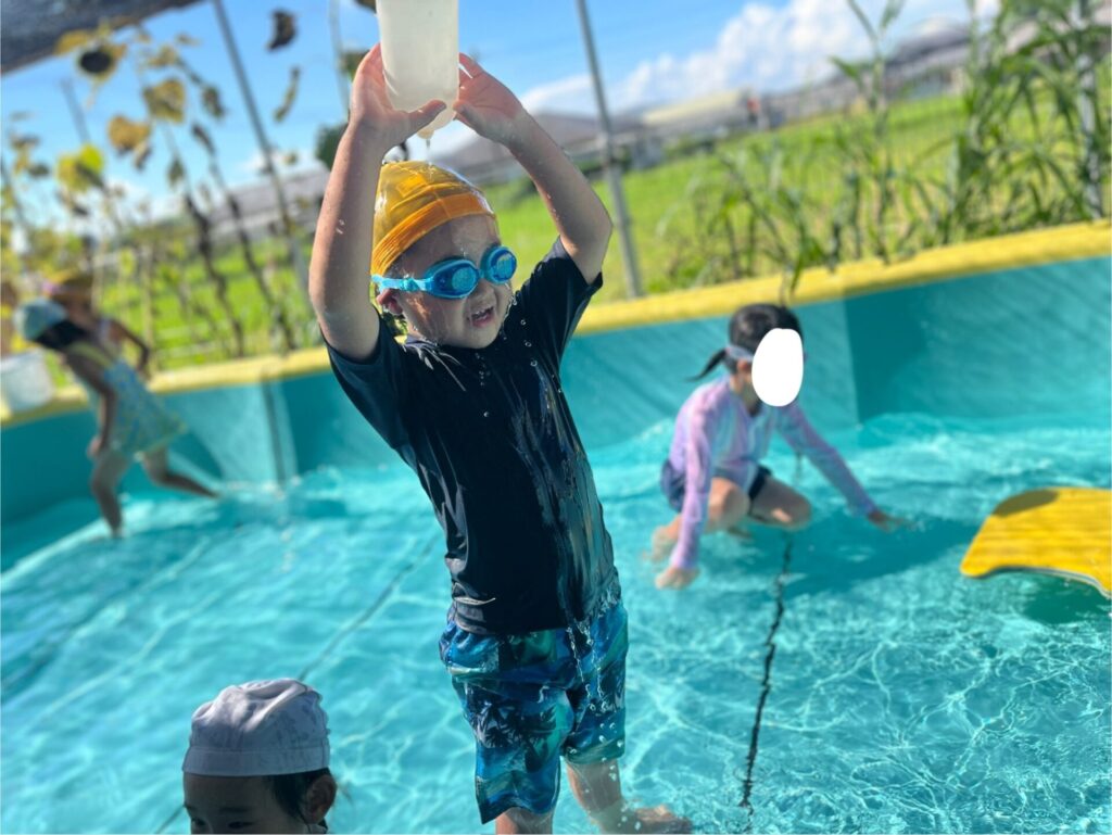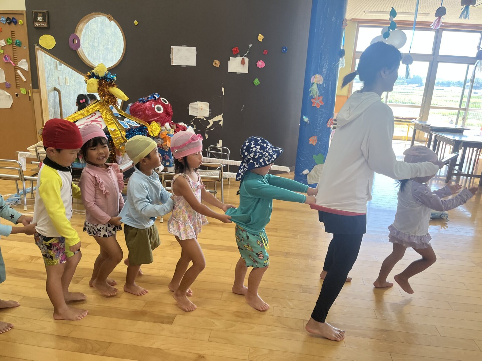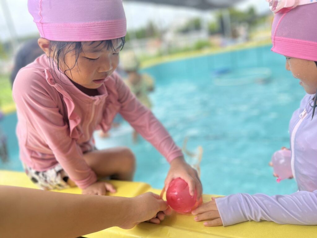 子どもたちはいつもプールを楽しみにしており、「きょうなんばん?」「はやくはいりたい!!」とワクワク☺プールに入ると、フープを使って「せんせい、ひっぱって」と引っ張ってもらったり、宝石遊び、「せんせーまってー!」と先生にみんなでつかまったりといつも楽しそうな声がたくさん聞こえてきます♪