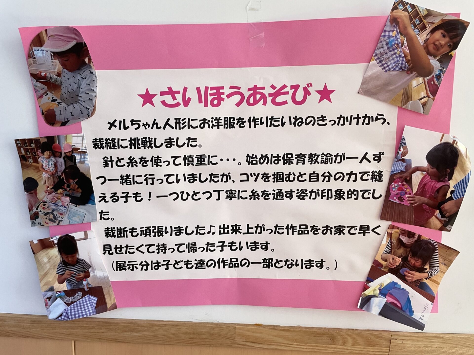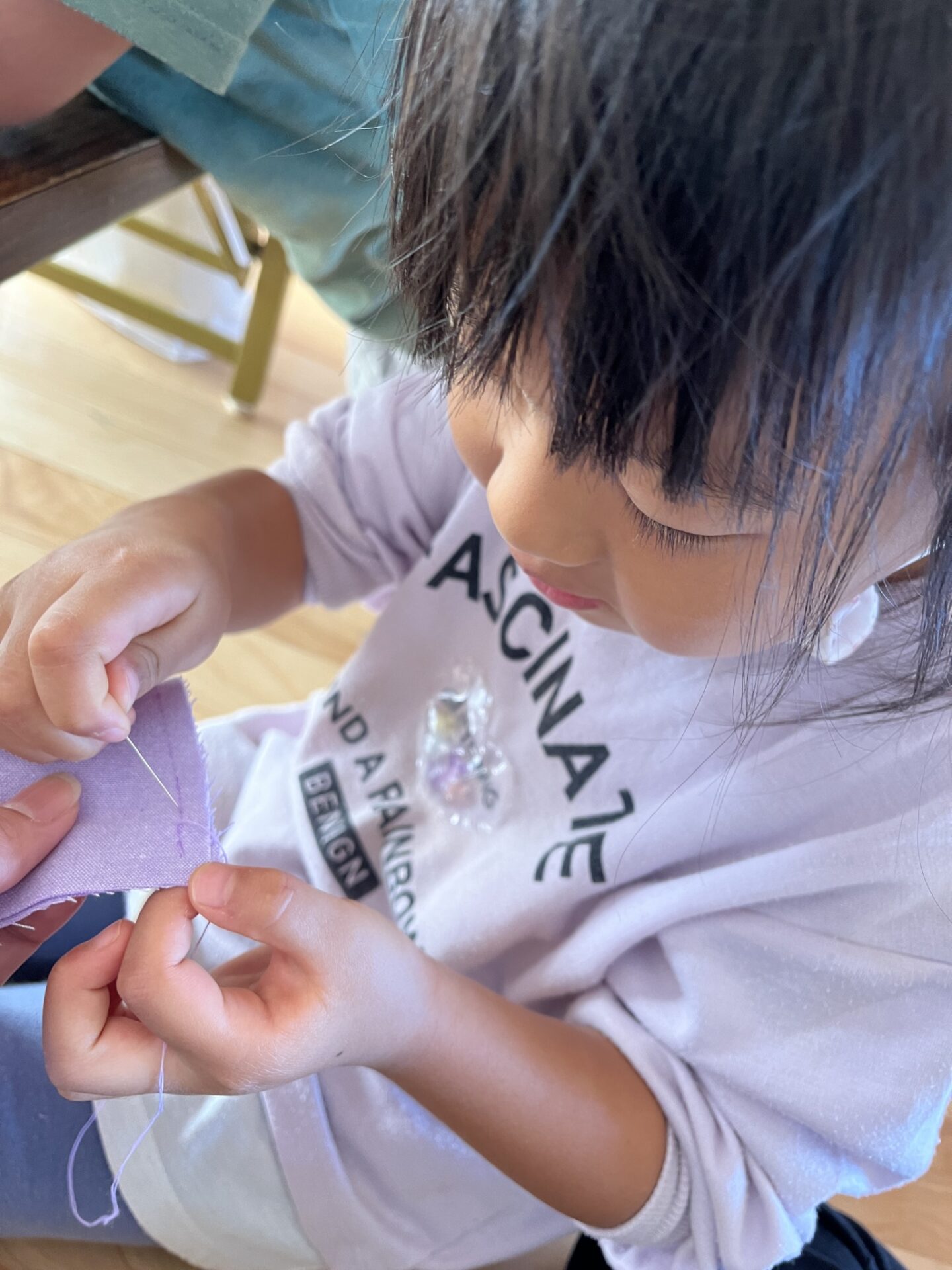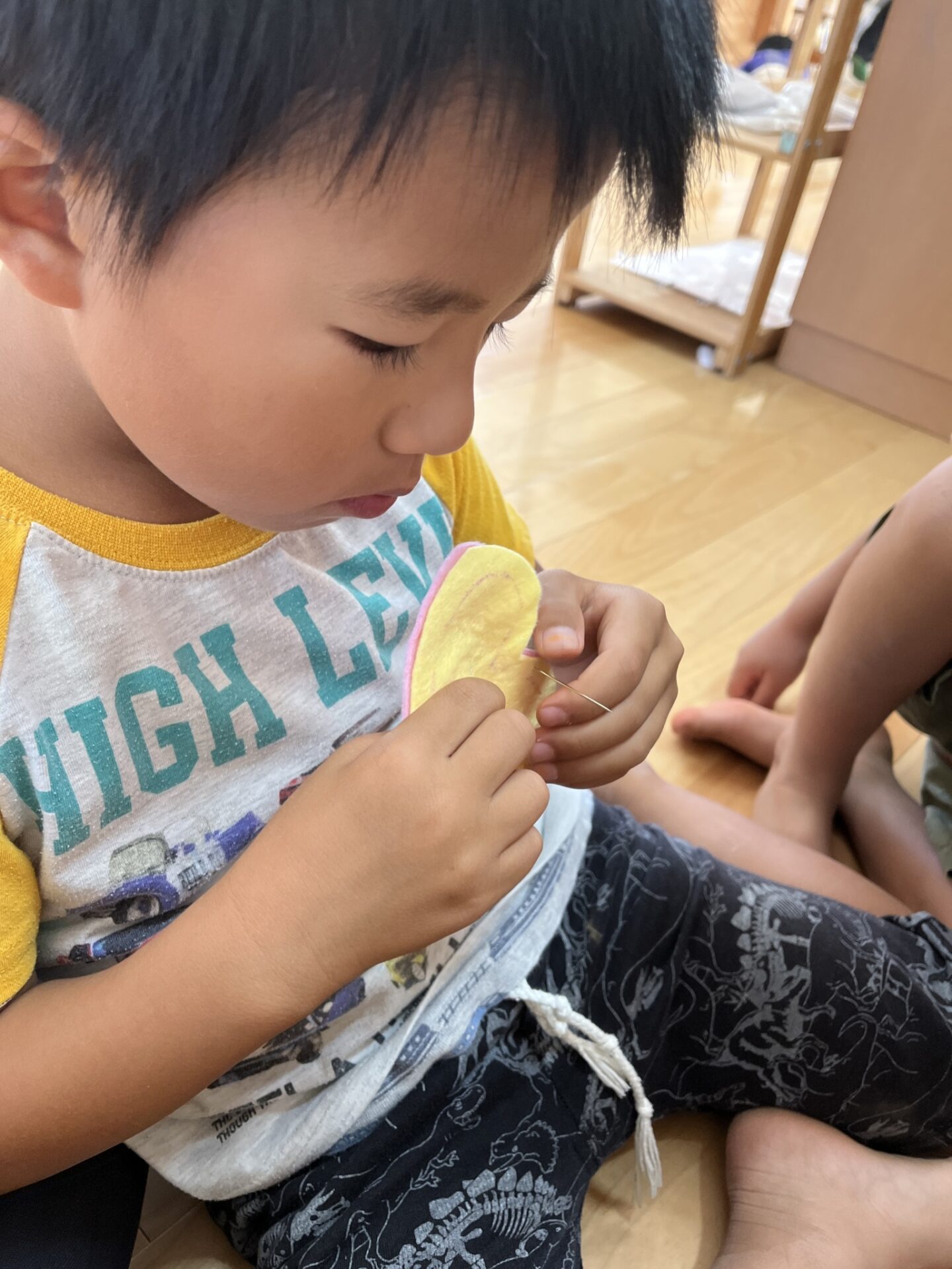 一緒に手を添えて始めましたが、コツやポイントを伝えると一つ一つの工程を丁寧にこなす子ども達。さすがです☺年長さん・年長さんは一人で針を使って縫うことが出来るようになりました。
