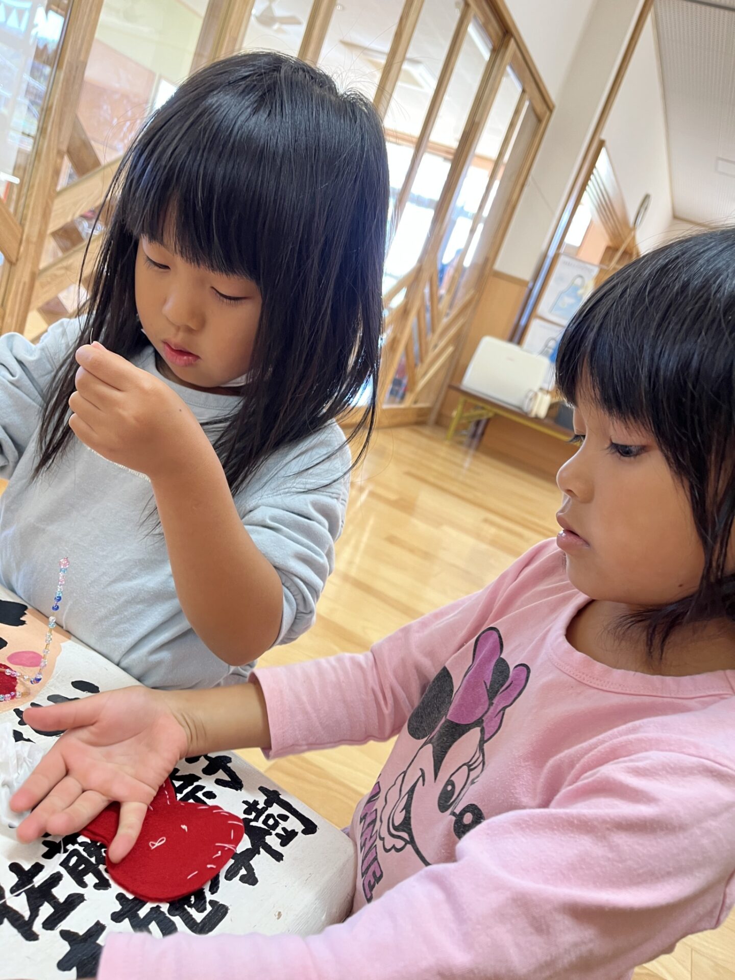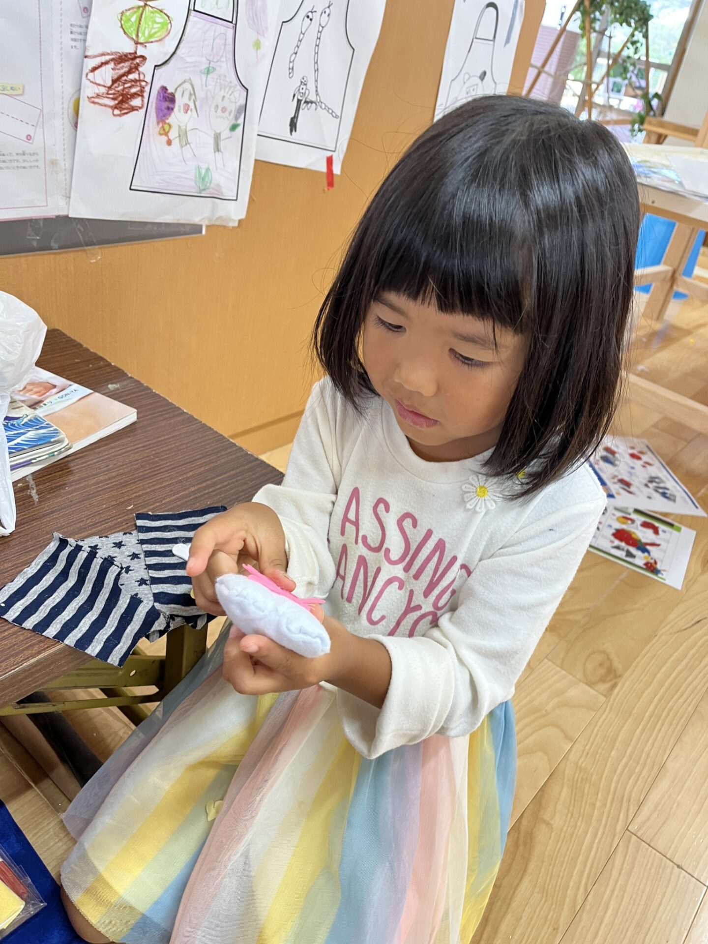 出来たお洋服を先生が縫ってくれると、「やってみたい!」とお裁縫にも興味をも持ってみていたので、針を使う練習としてハートのマスコットづくりをしました。