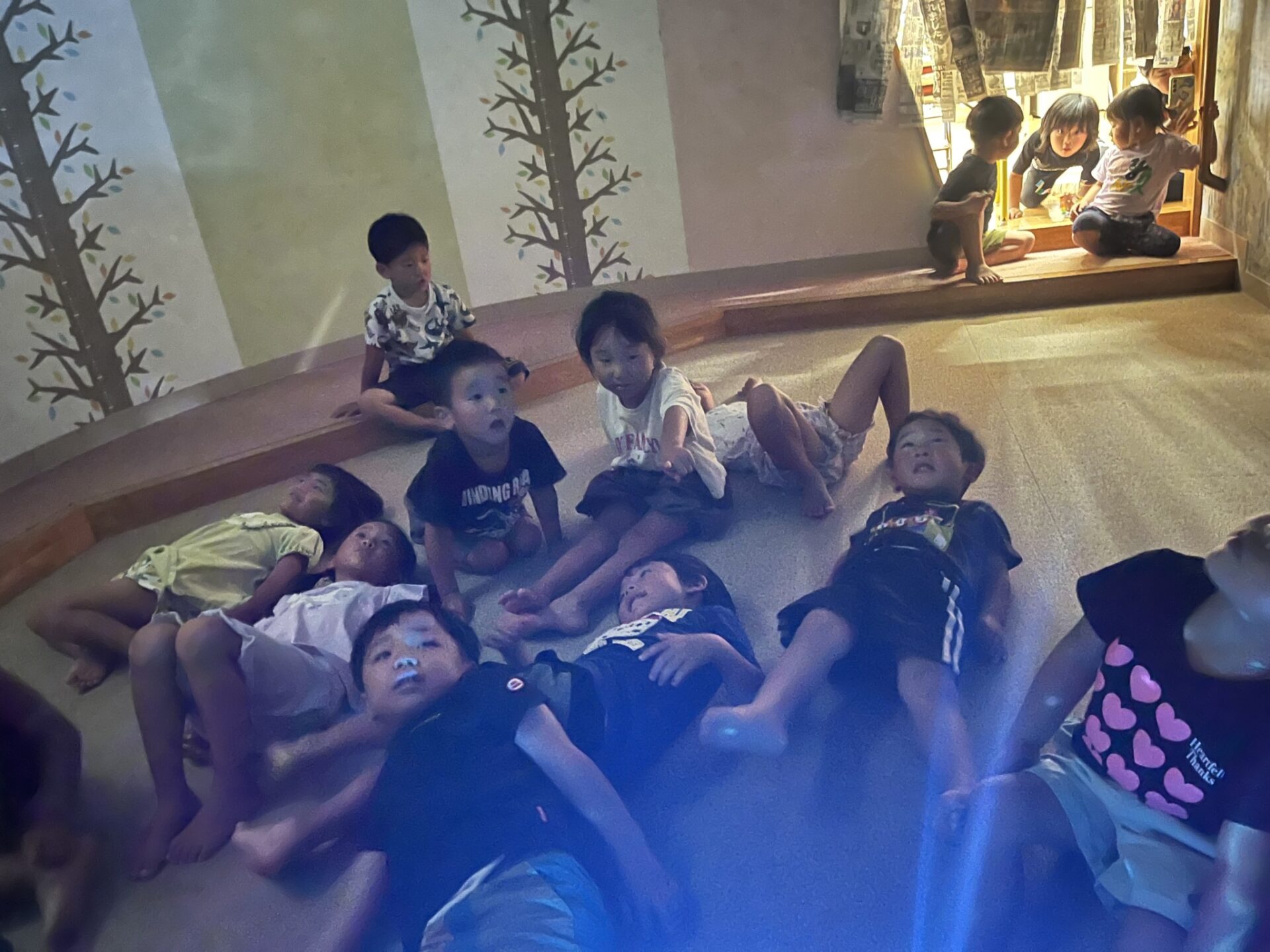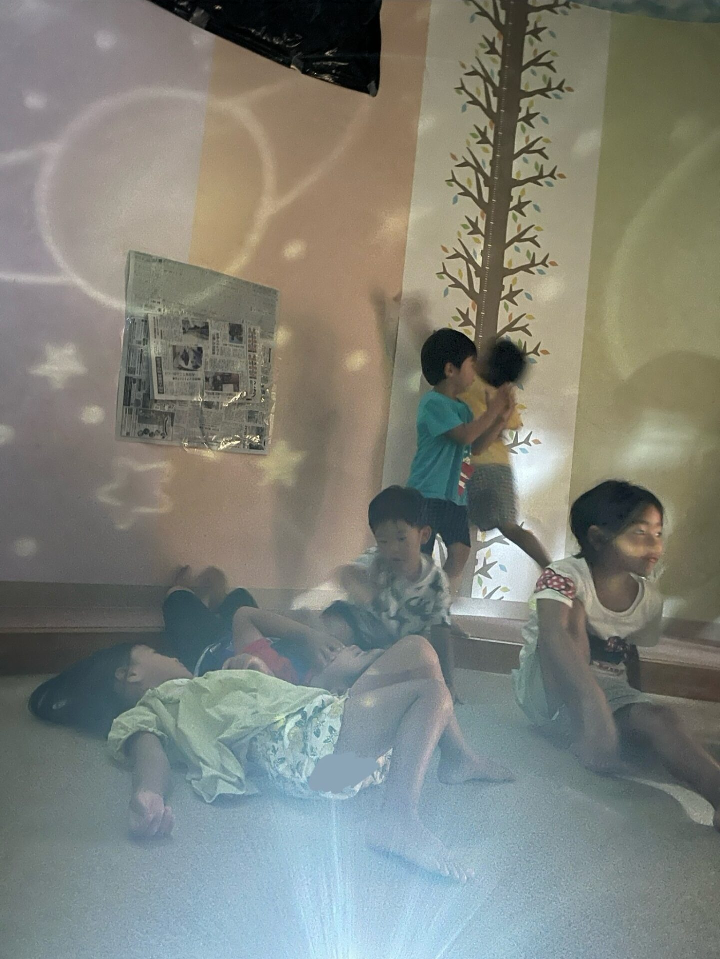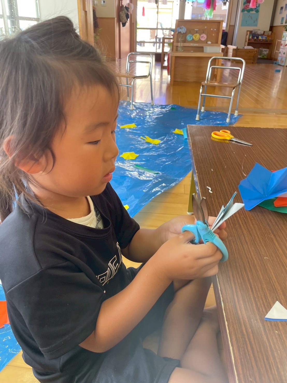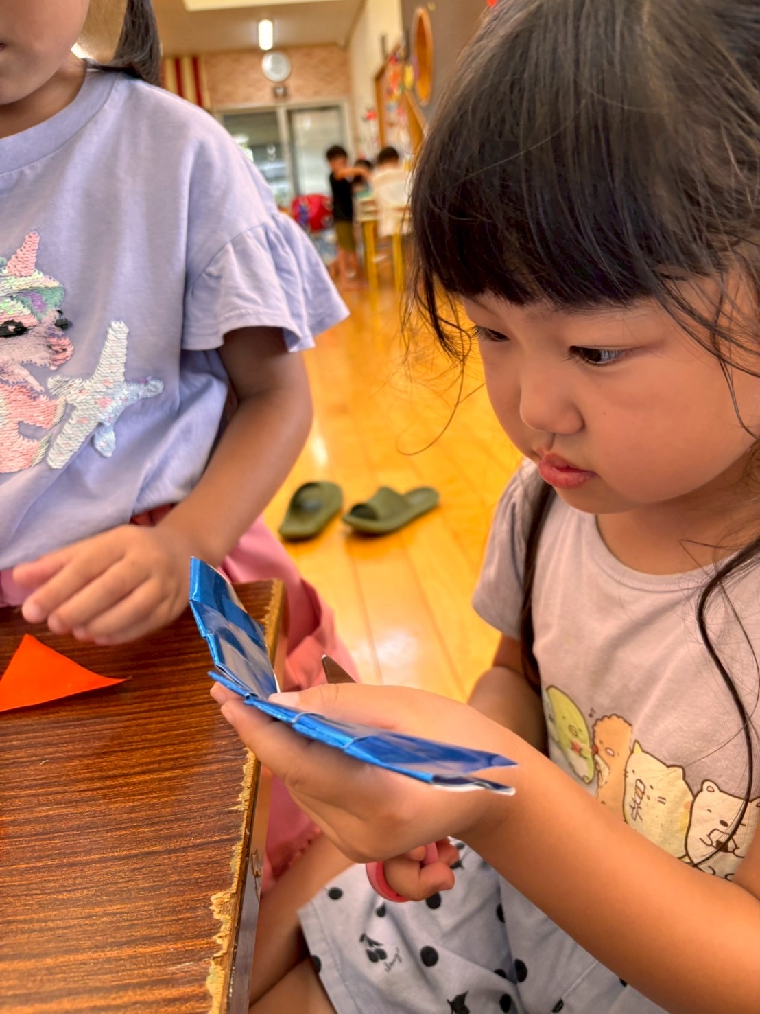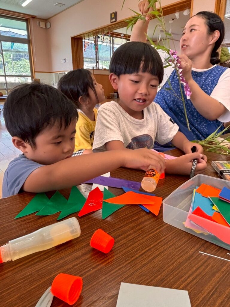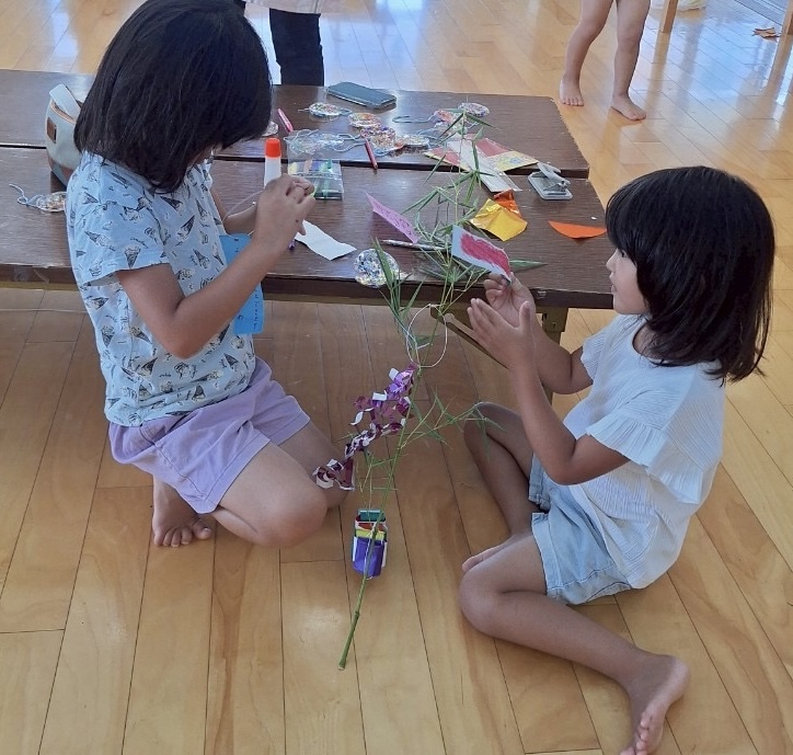 劇の後は、ミニmy笹作りや天の川作り、宝石取りやプラネタリウムを楽しみました✨ミニmy笹作りでは、自分よりも下の子が困っていると一緒に飾りを作ってあげたり、作り方を教えてあげたりと優しい姿も見られて成長を感じていた先生たちです!天の川作りは、みんなで大きな天の川を作り、完成して飾ると「できた!」「きれい!!」とみんな喜んでいました☺プラネタリウムも「きれい!」「すごーい!!」「みて!うえにもよこにもおほしさまがある!!」と興味津々でみんなでごろんと横になって楽しみました♡
