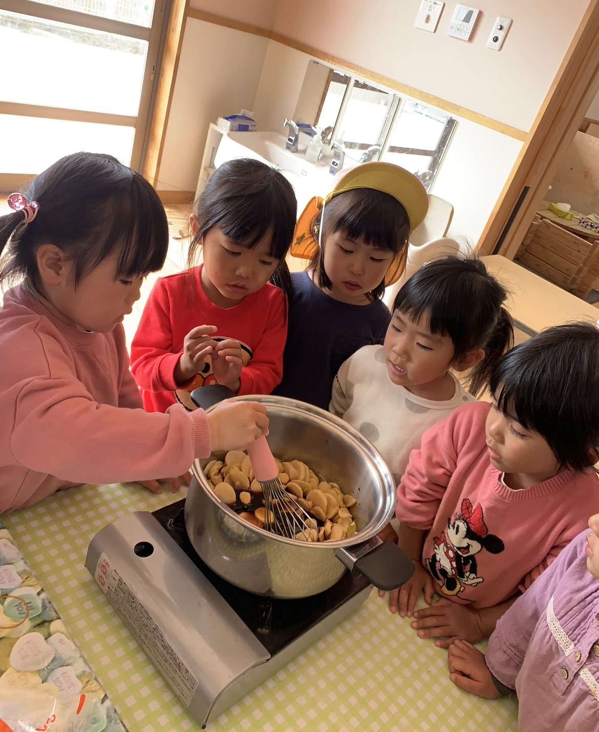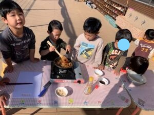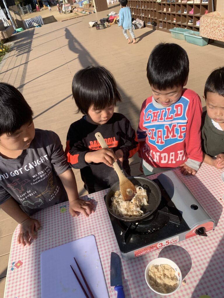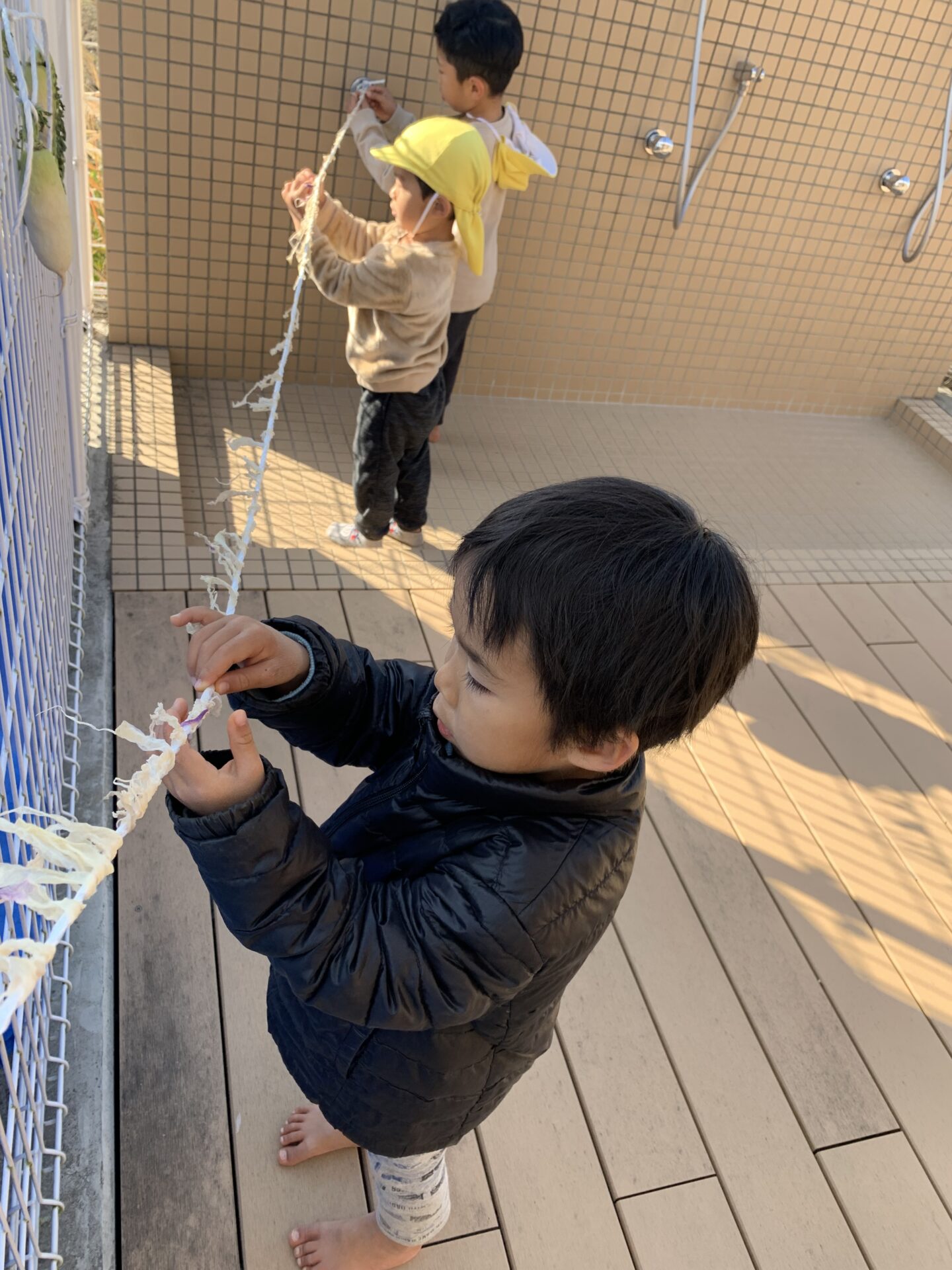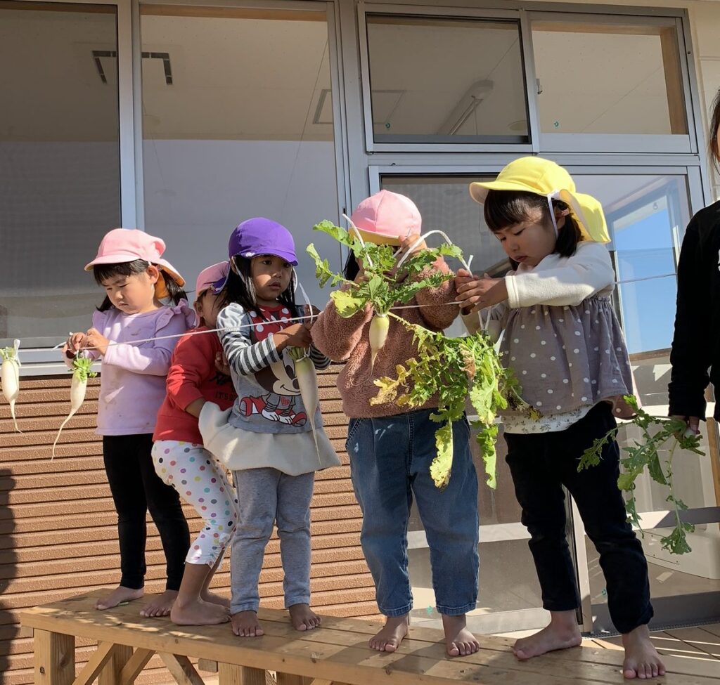 大根のシャキッとした音がくせになっていたり、どっちが長い大根が作れるか競いながらつくっているお友達もいました。