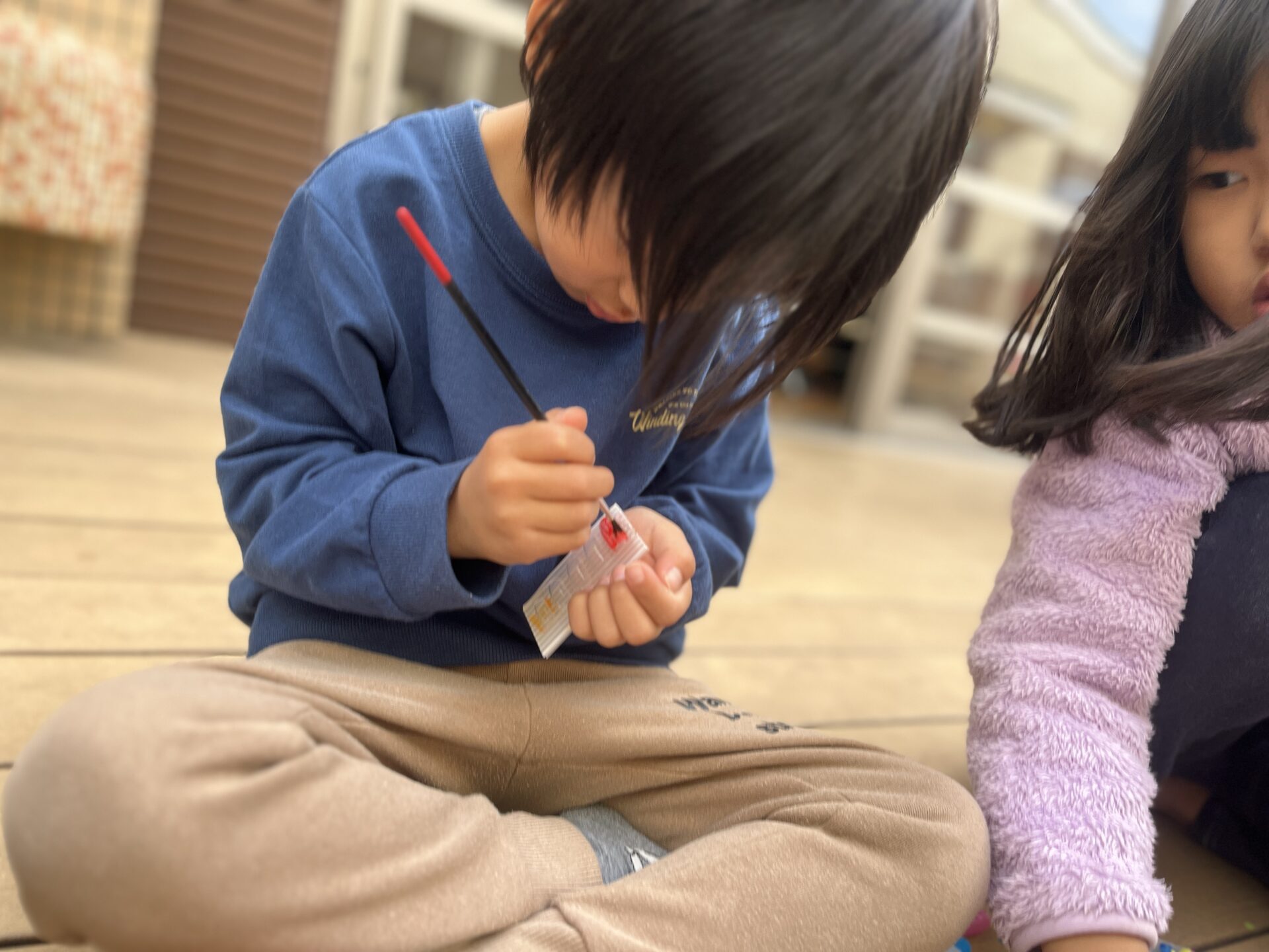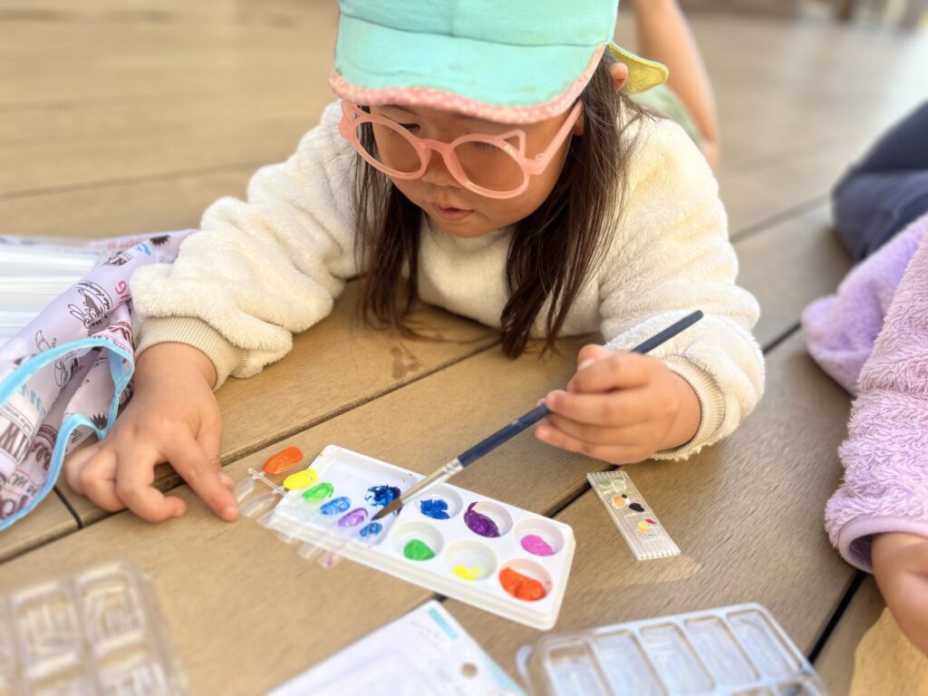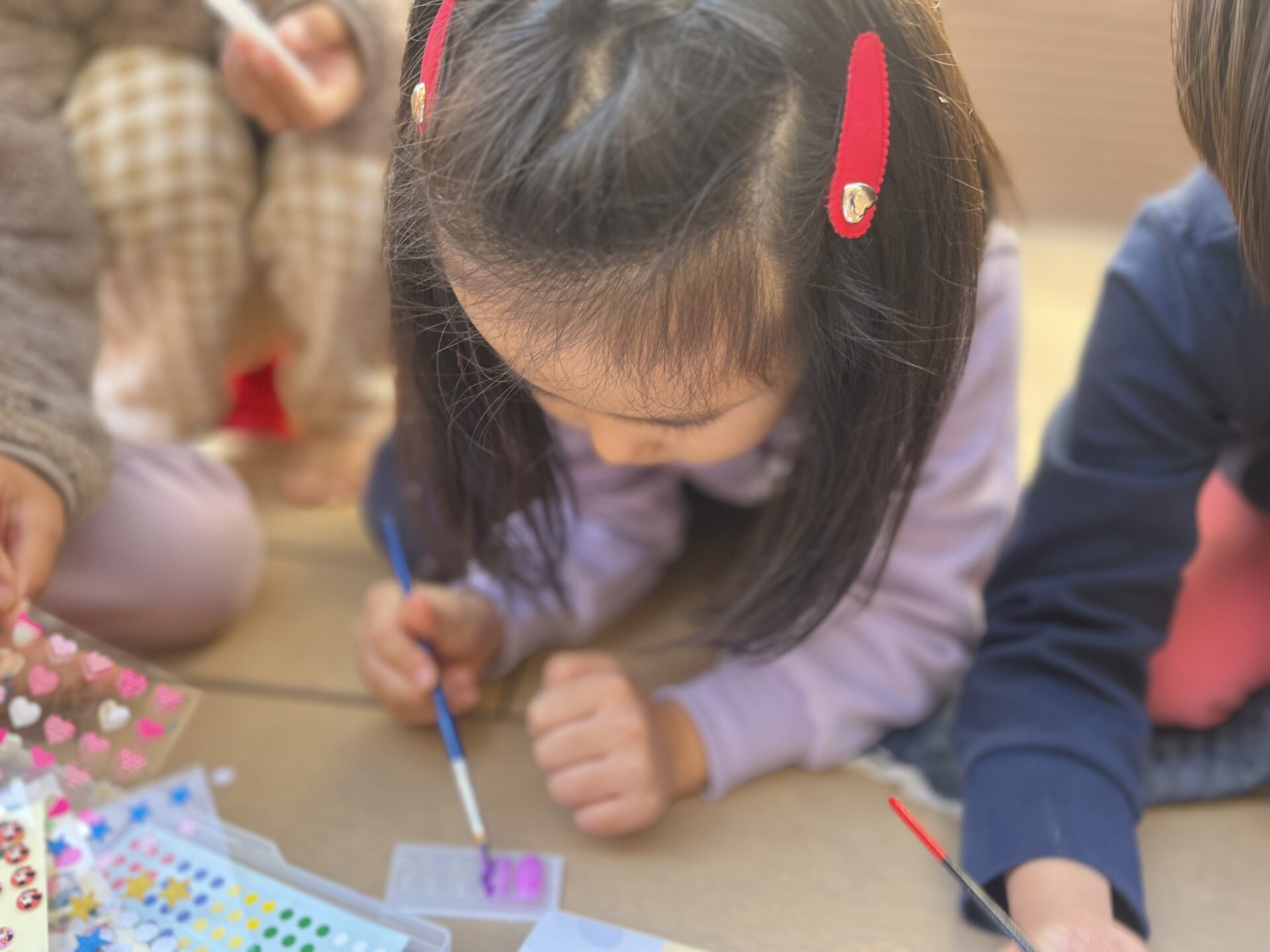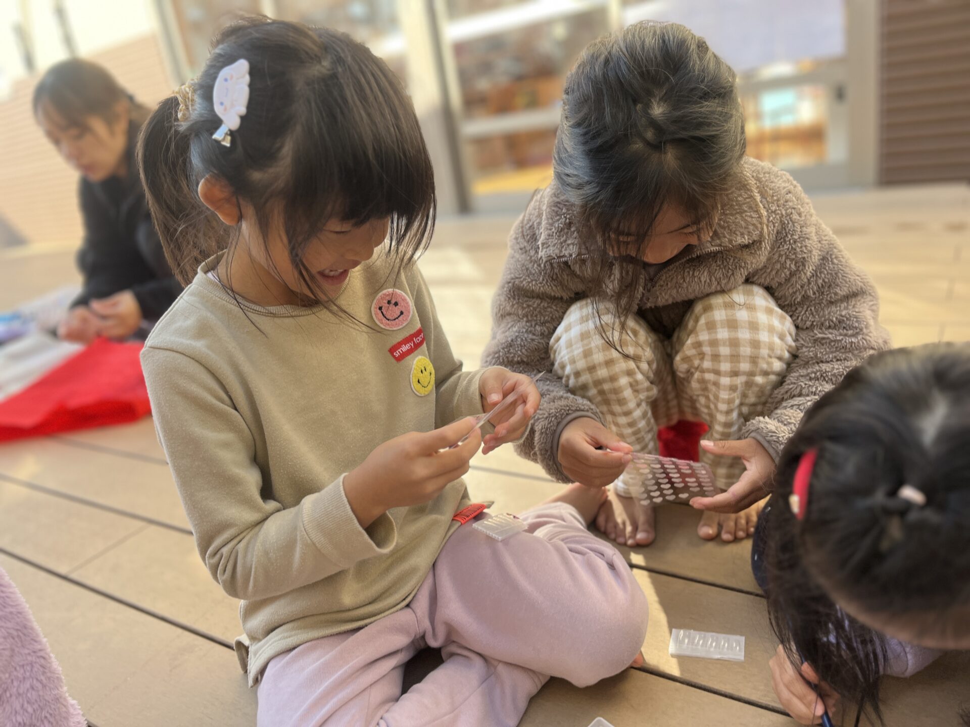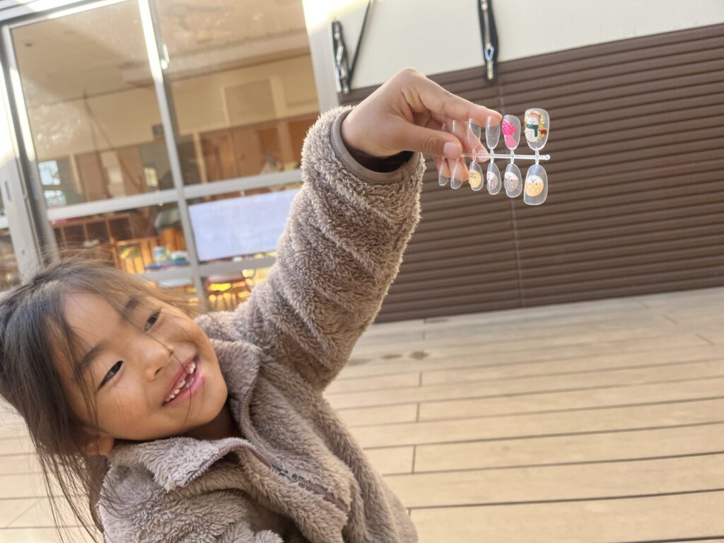 13日に行われるフェスティバル冬で見てきたお仕事について保護者の方に伝えます☺そこで「ネイル屋さんしたい!!」の声が!フェスティバル冬までにどうやってネイル屋さんをするか考えてみることに・・・🤔まずは、ネイルチップと絵の具、シールを使ってネイルチップ作りに挑戦!「このいろがいいかも!」「クロミちゃんとかポムポムプリンのネイルにする」「ギャルネイルはどうかな?」と自分たちで考えて作ってみました♪