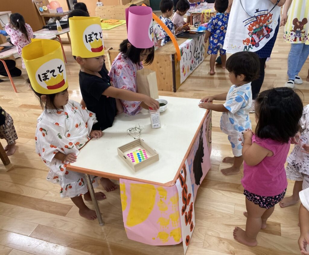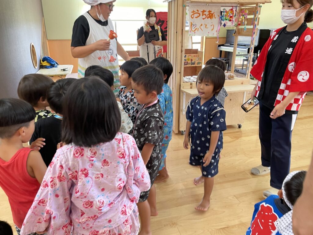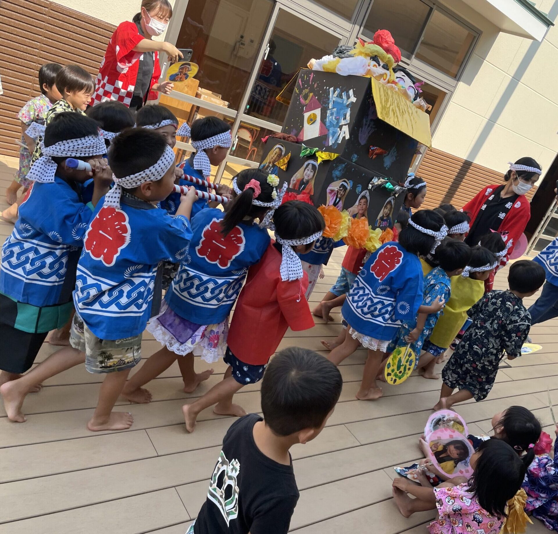 2日目は、れんげ組(年長)さんが、おみこしを担いでクラスを回ったり、盆踊り、屋台ごっこをしました。