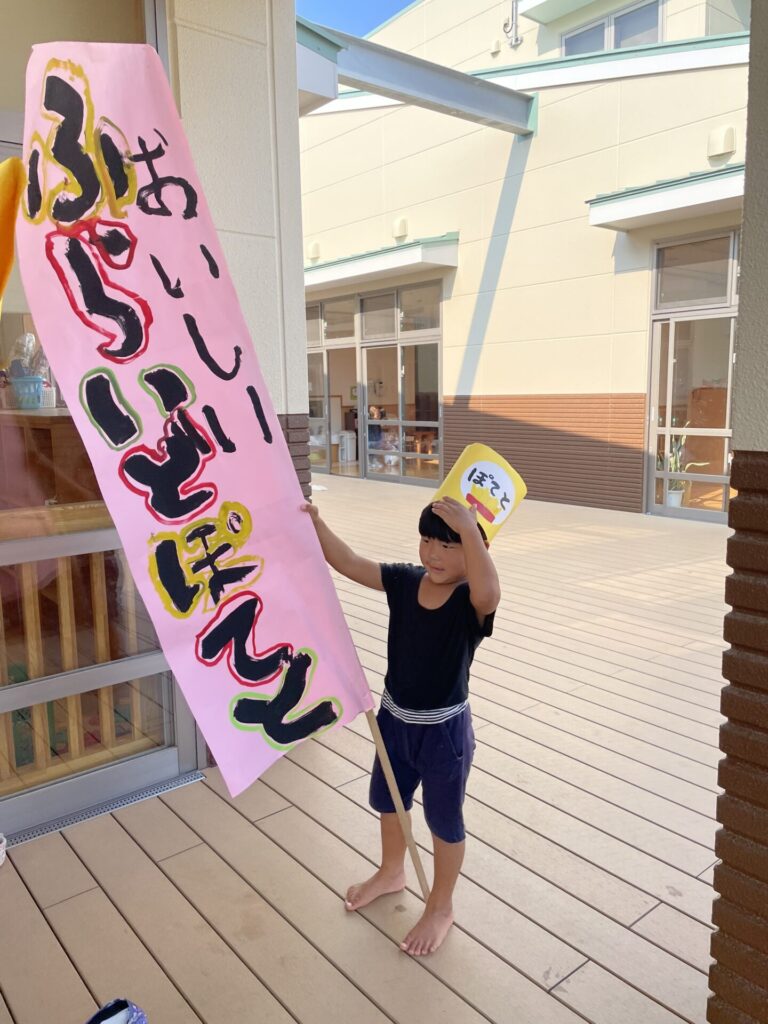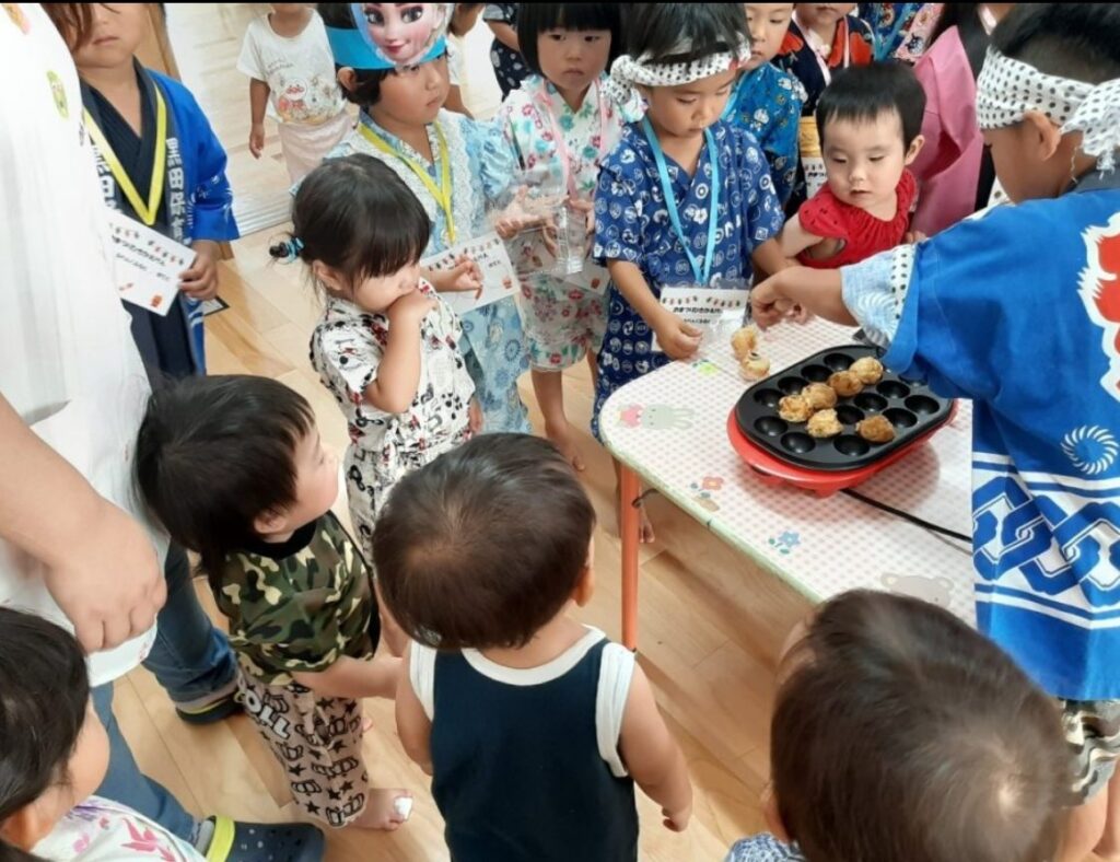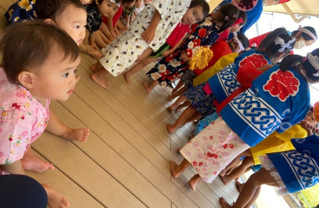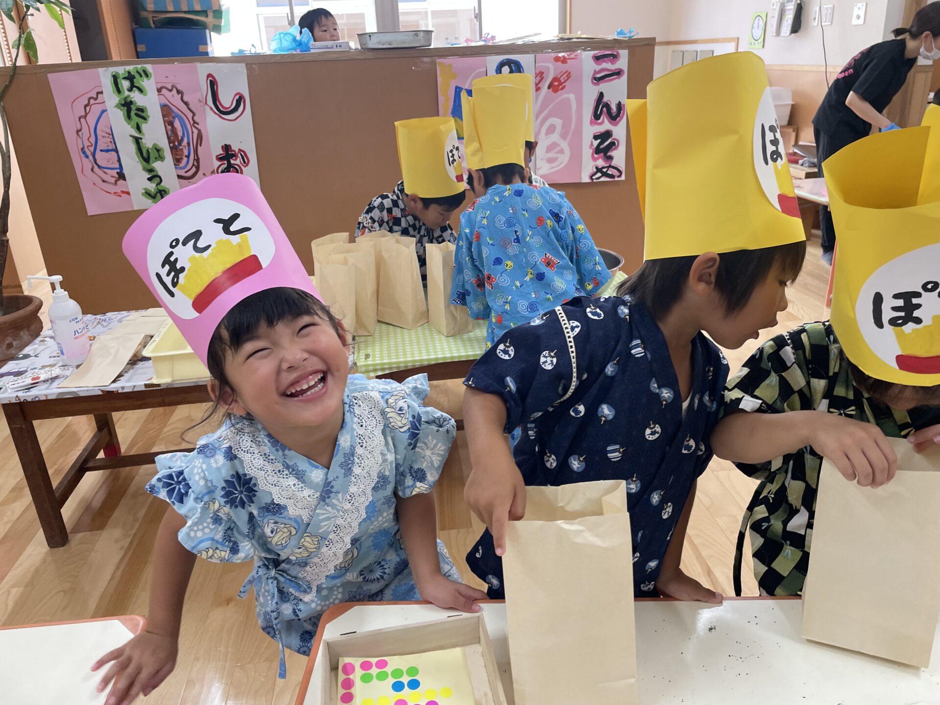 2日目は、れんげ組(年長)さんが、おみこしを担いでクラスを回ったり、盆踊り、屋台ごっこをしました。