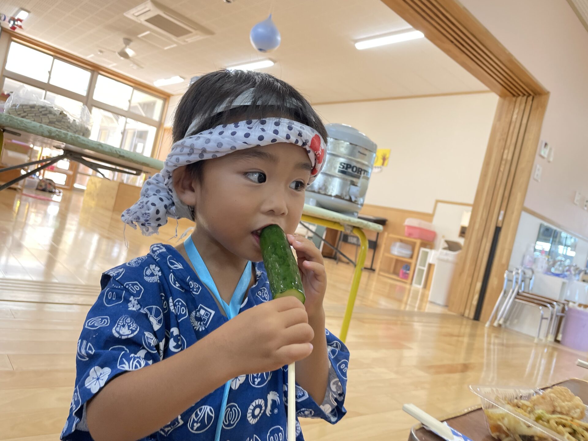 屋台で買ったご飯と、さらに、調理室ワゴンの屋台から冷やしきゅうりと焼きそばを貰い、豪華なお祭り給食となりました。
