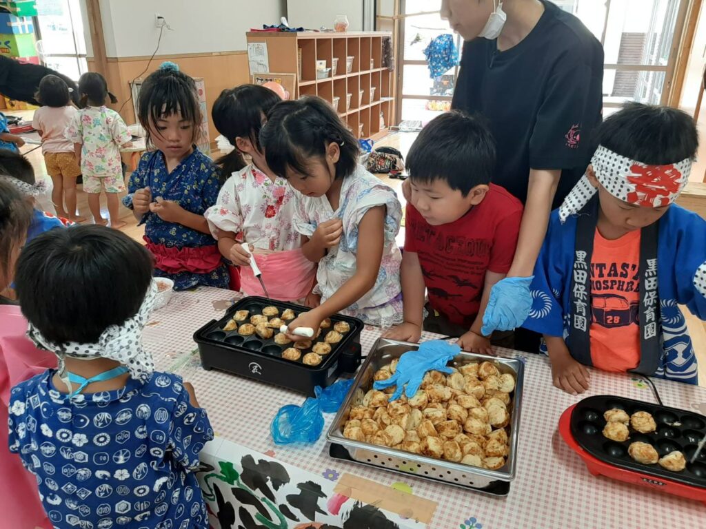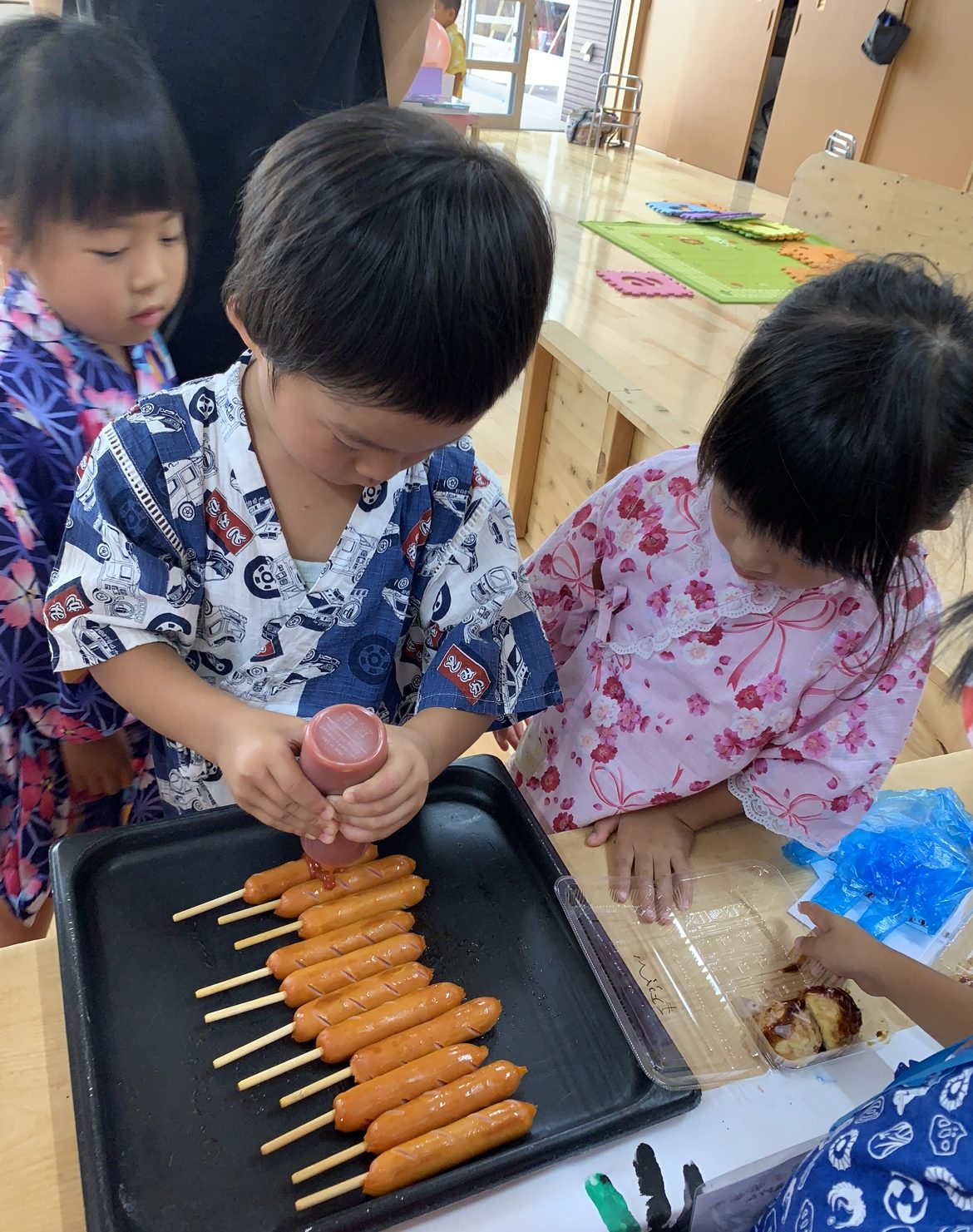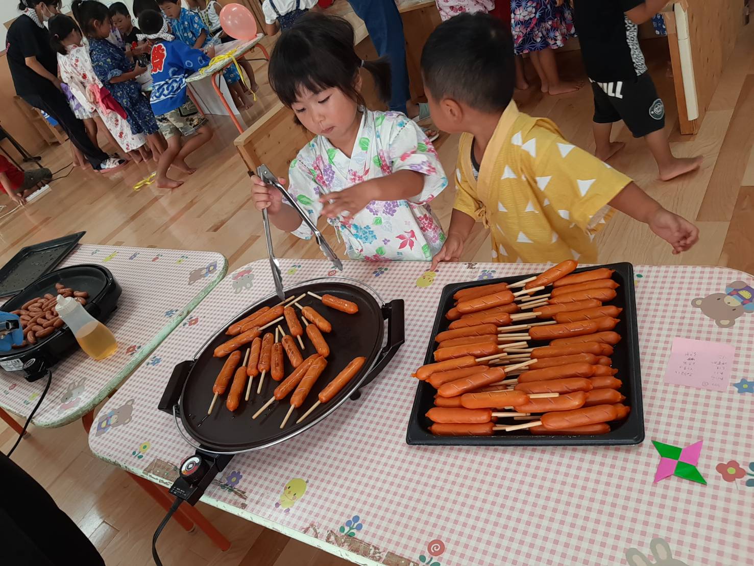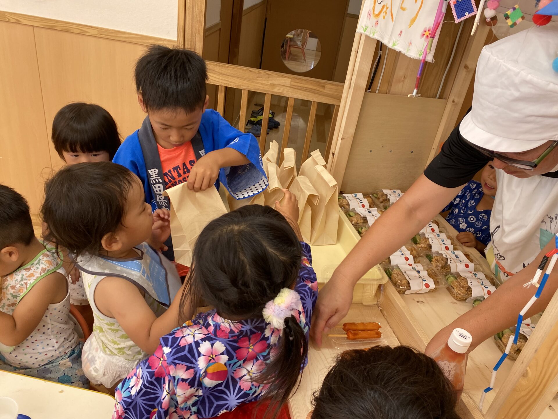 年長さんのたこ焼き・年中さんのポテト・年少さんのフランクフルト。3つの屋台が並び、