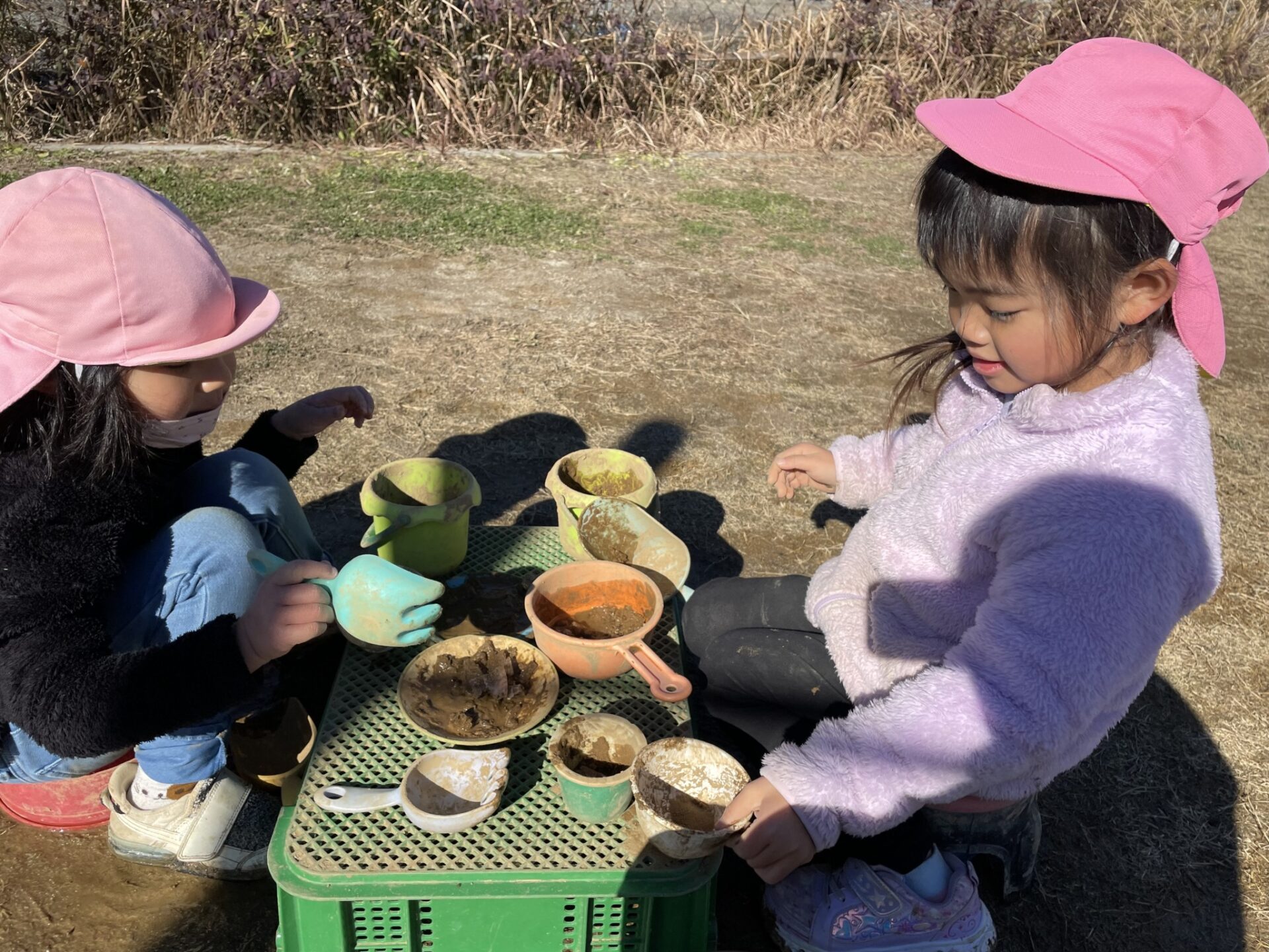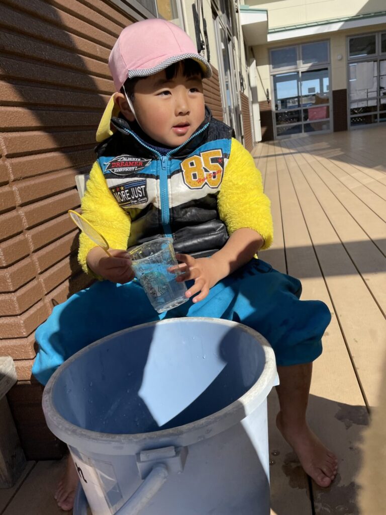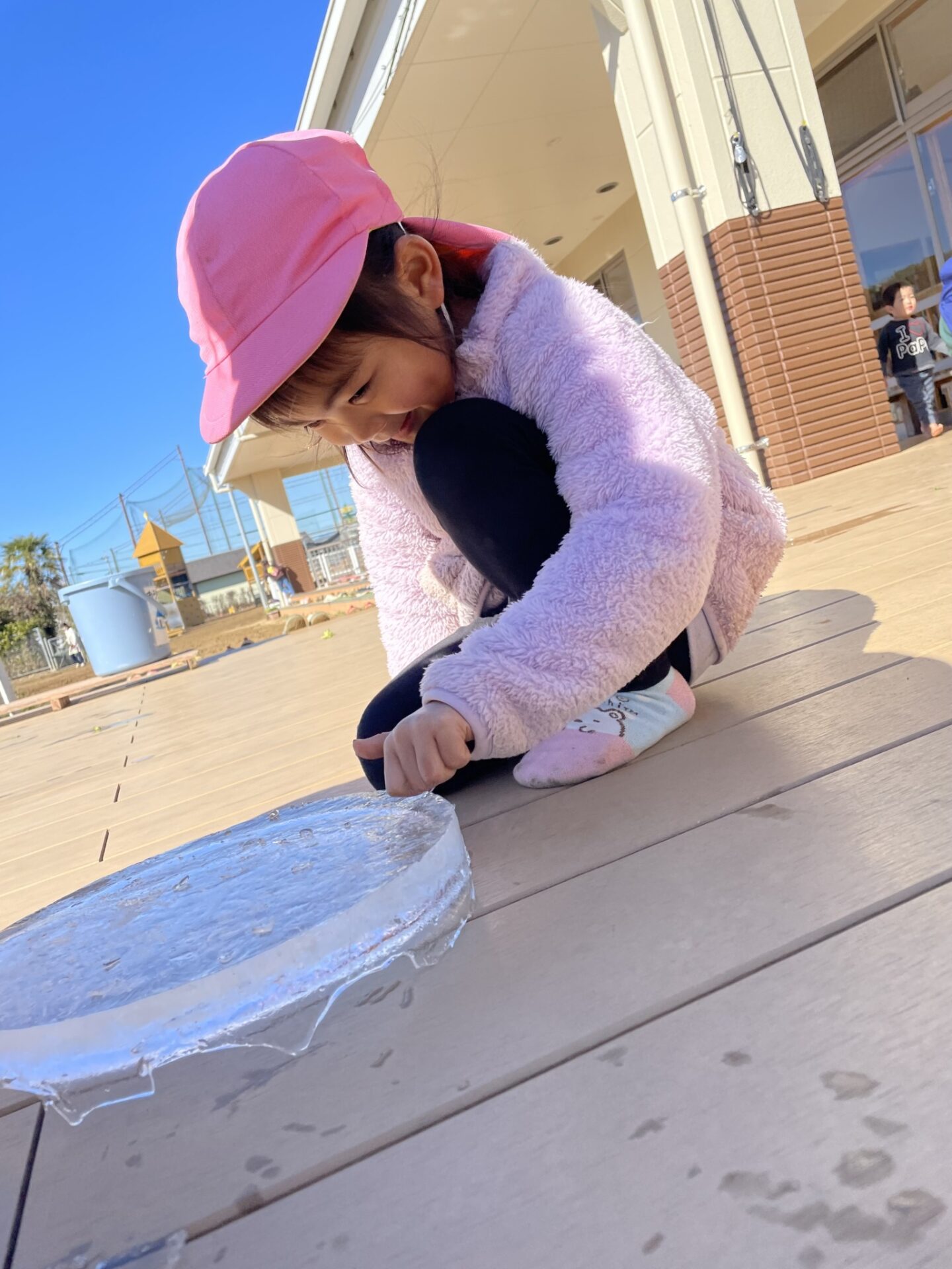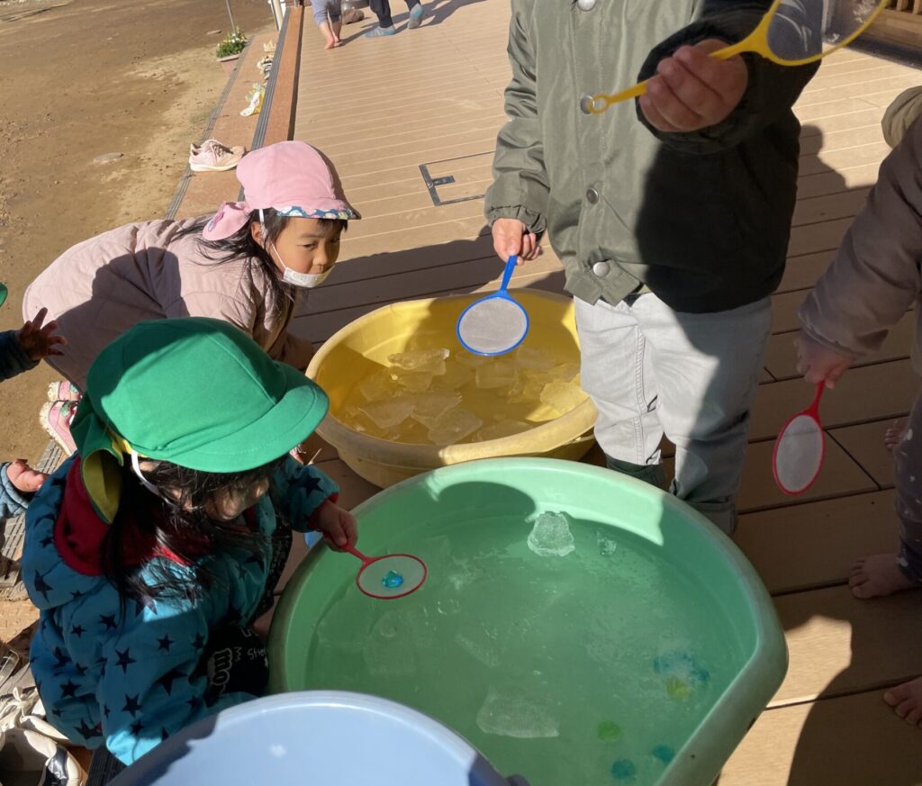 『せんせいみて見て~こっちにも氷ある!』と冷たい氷を手に取っては、『手が冷たい!もう持てない~!』と自然の中で、今日も元気いっぱい遊んでいます。