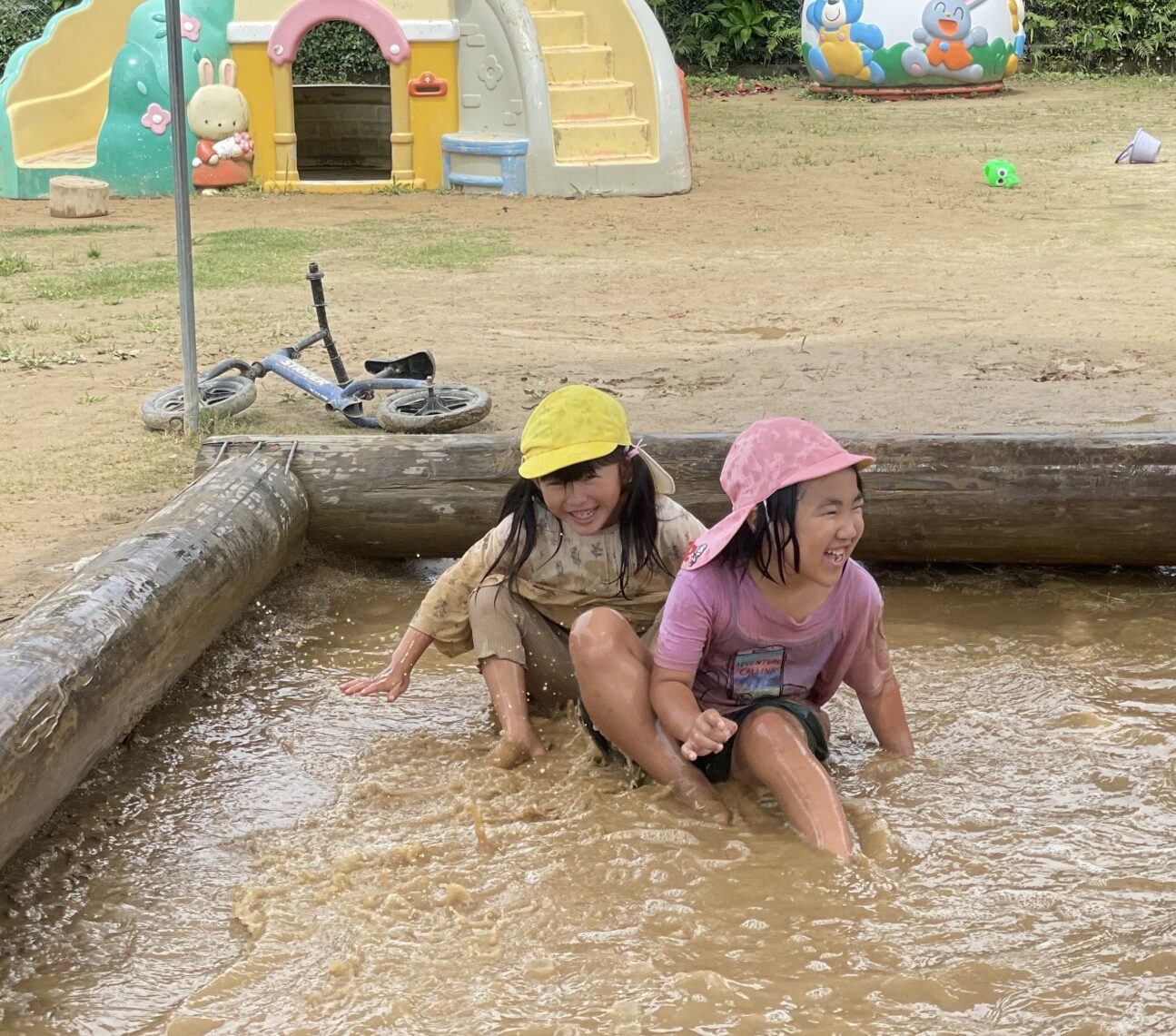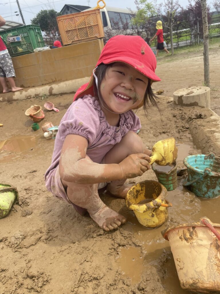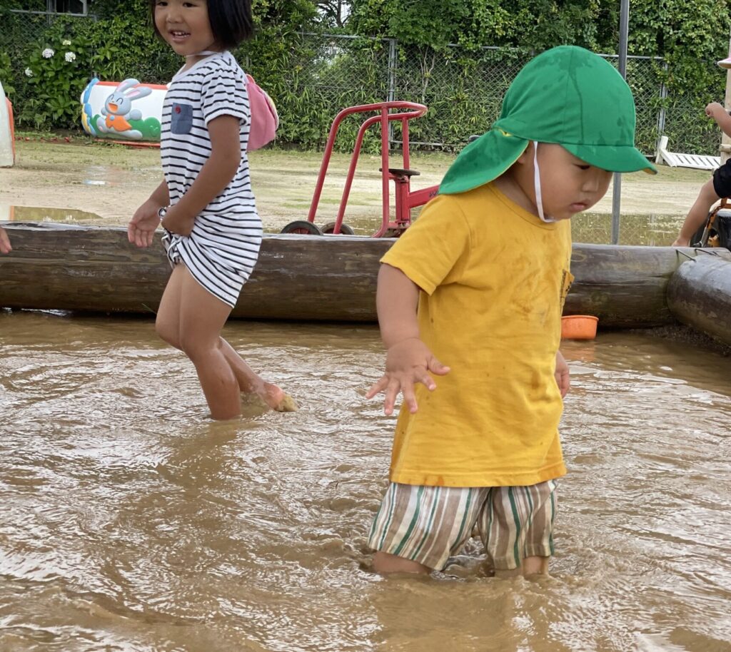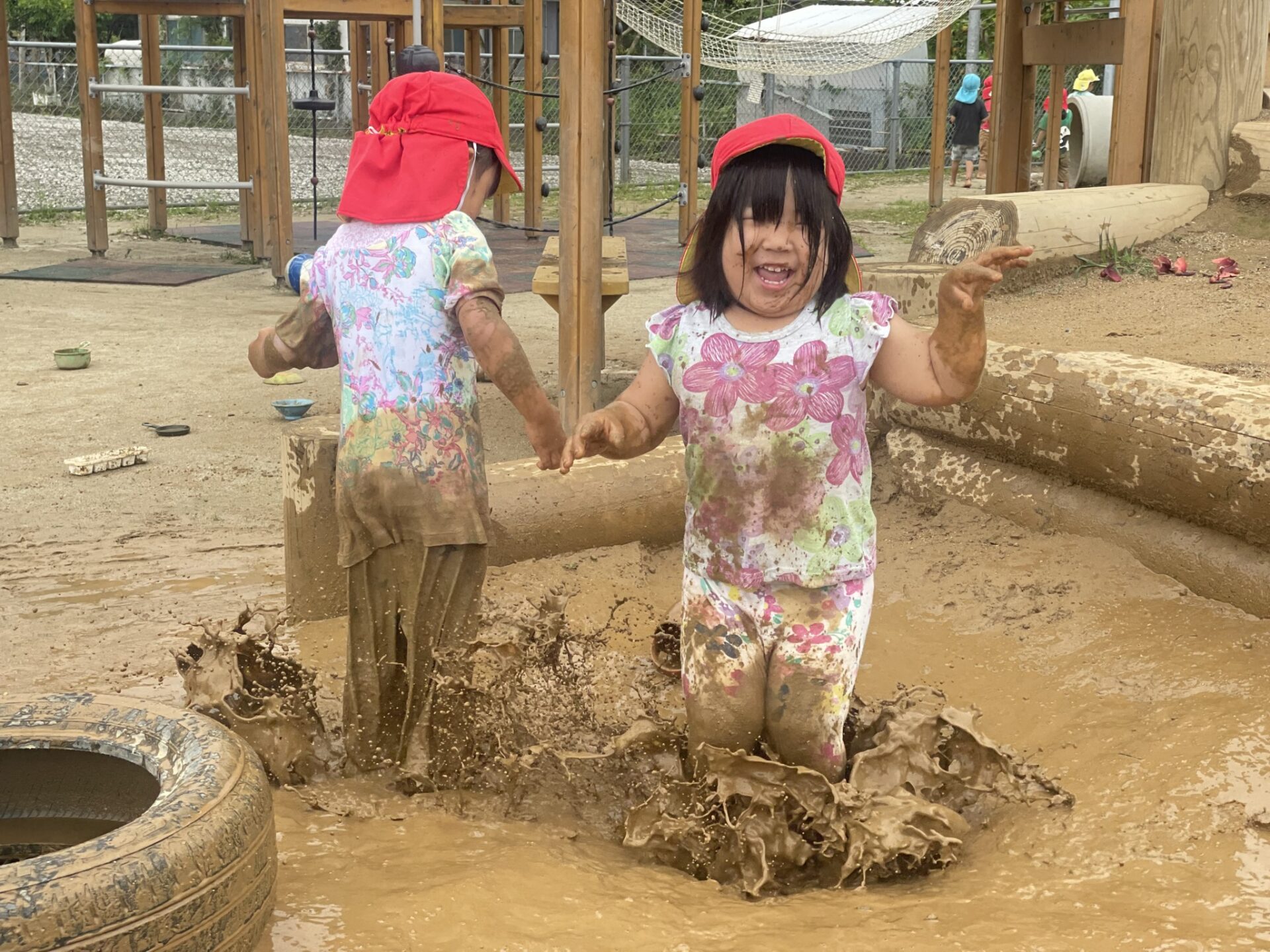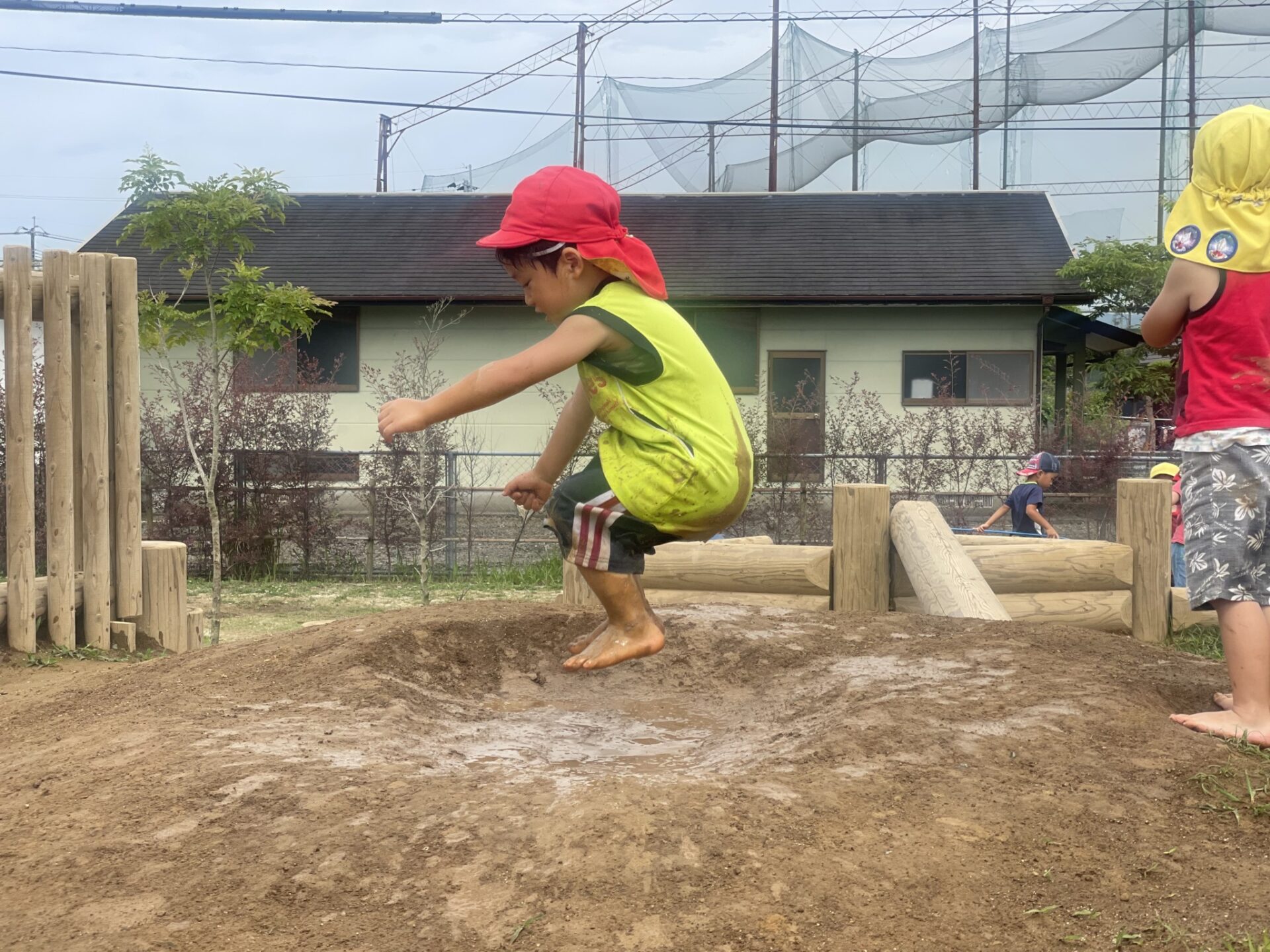 雨が続いていますが、雨の日の合間で園庭に出ると、以上児さんも未満児さんもぬかるみに入って泥の感触を楽しんでいたり、お水遊びをして涼んでいたり、思いっきり泥遊びを楽しんでいる子ども達の様子が見られます。