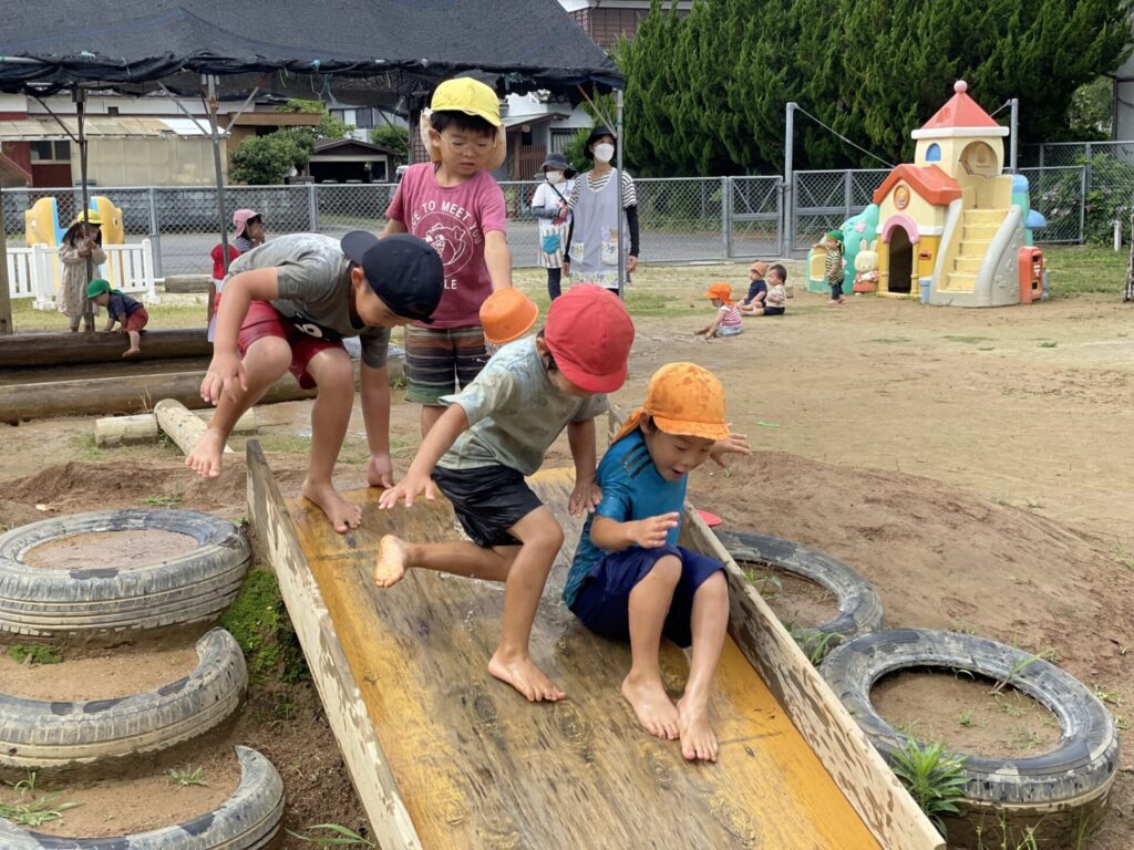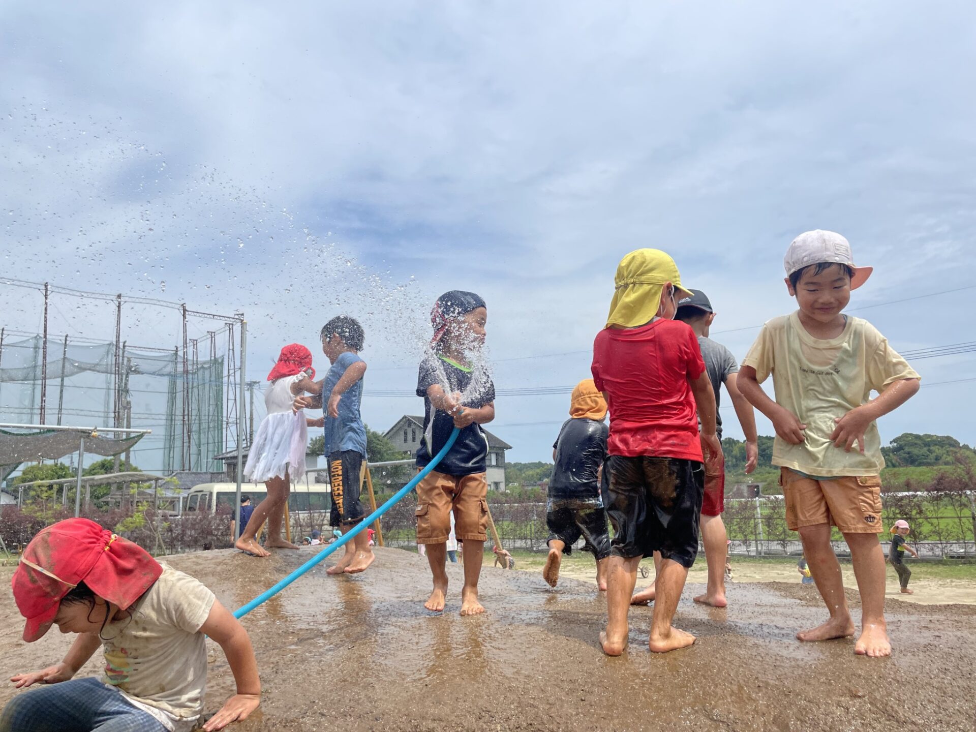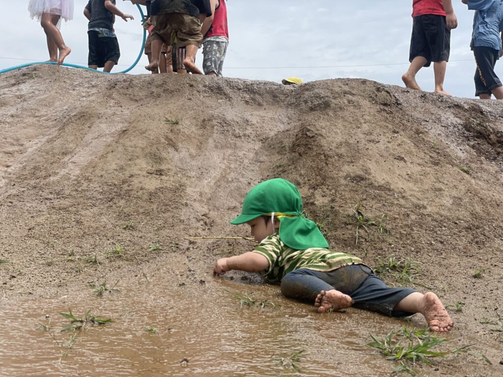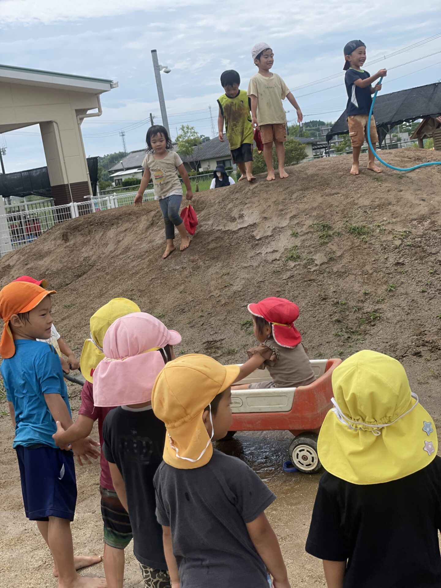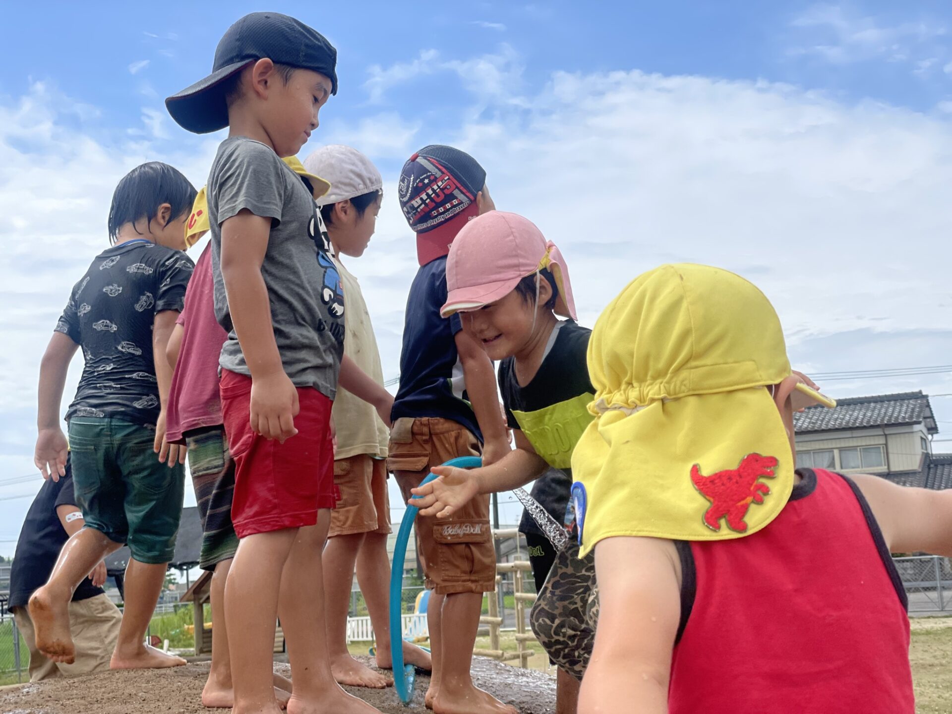 雨が続いていますが、雨の日の合間で園庭に出ると、以上児さんも未満児さんもぬかるみに入って泥の感触を楽しんでいたり、お水遊びをして涼んでいたり、思いっきり泥遊びを楽しんでいる子ども達の様子が見られます。