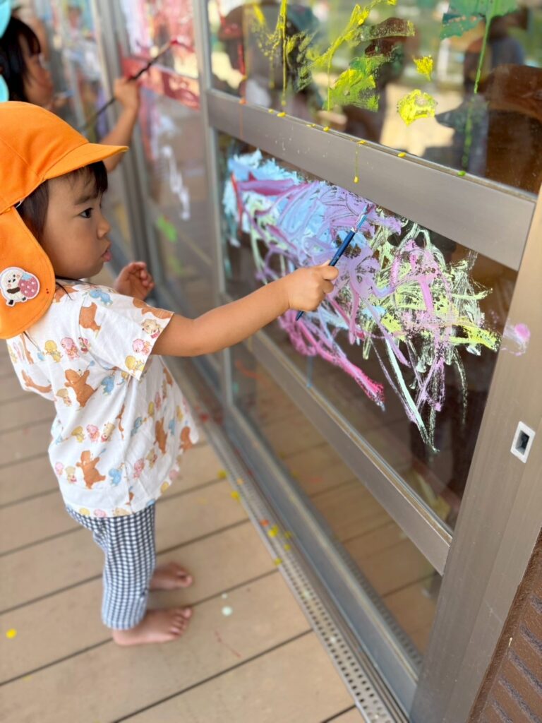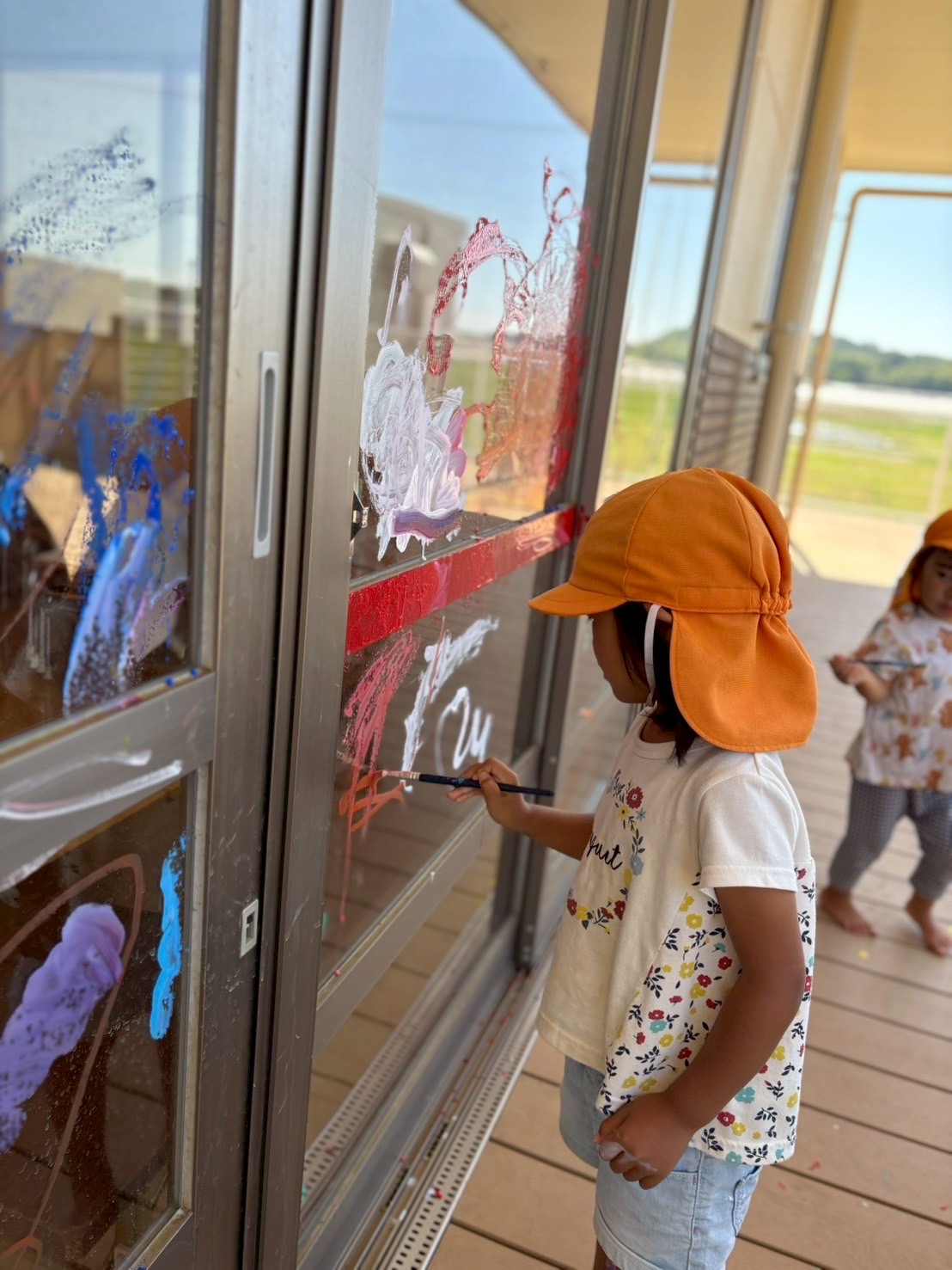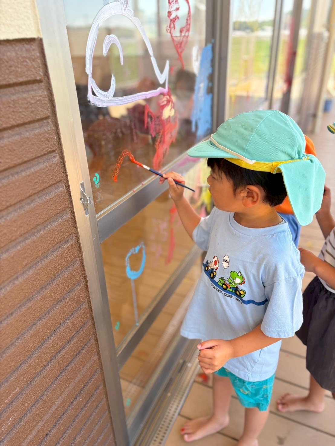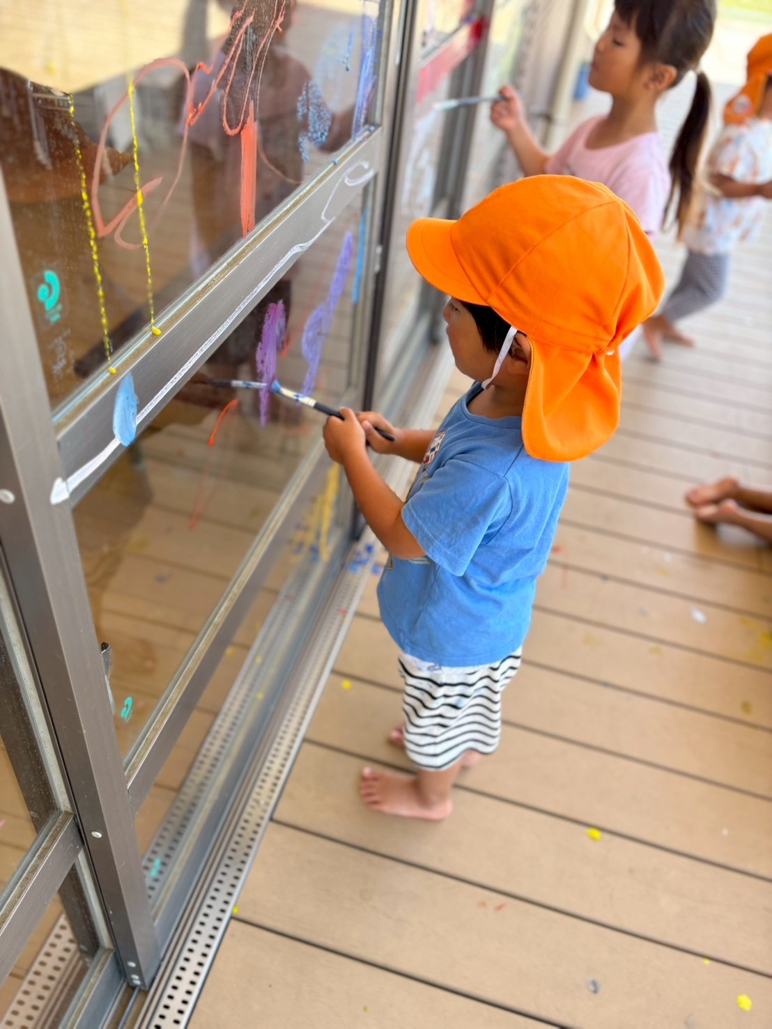 普段は叱られてしまいそうな窓へのお絵描き。はじめは、「ほんとにいいの?」というように、小さく描いたり、そーっと描いている様子でしたが、だんだん楽しくなってきた子どもたち! 大きな絵を描いたり、お友だちとおしゃべりしながら描いたりととても楽しそうにお絵描きをしていました☺