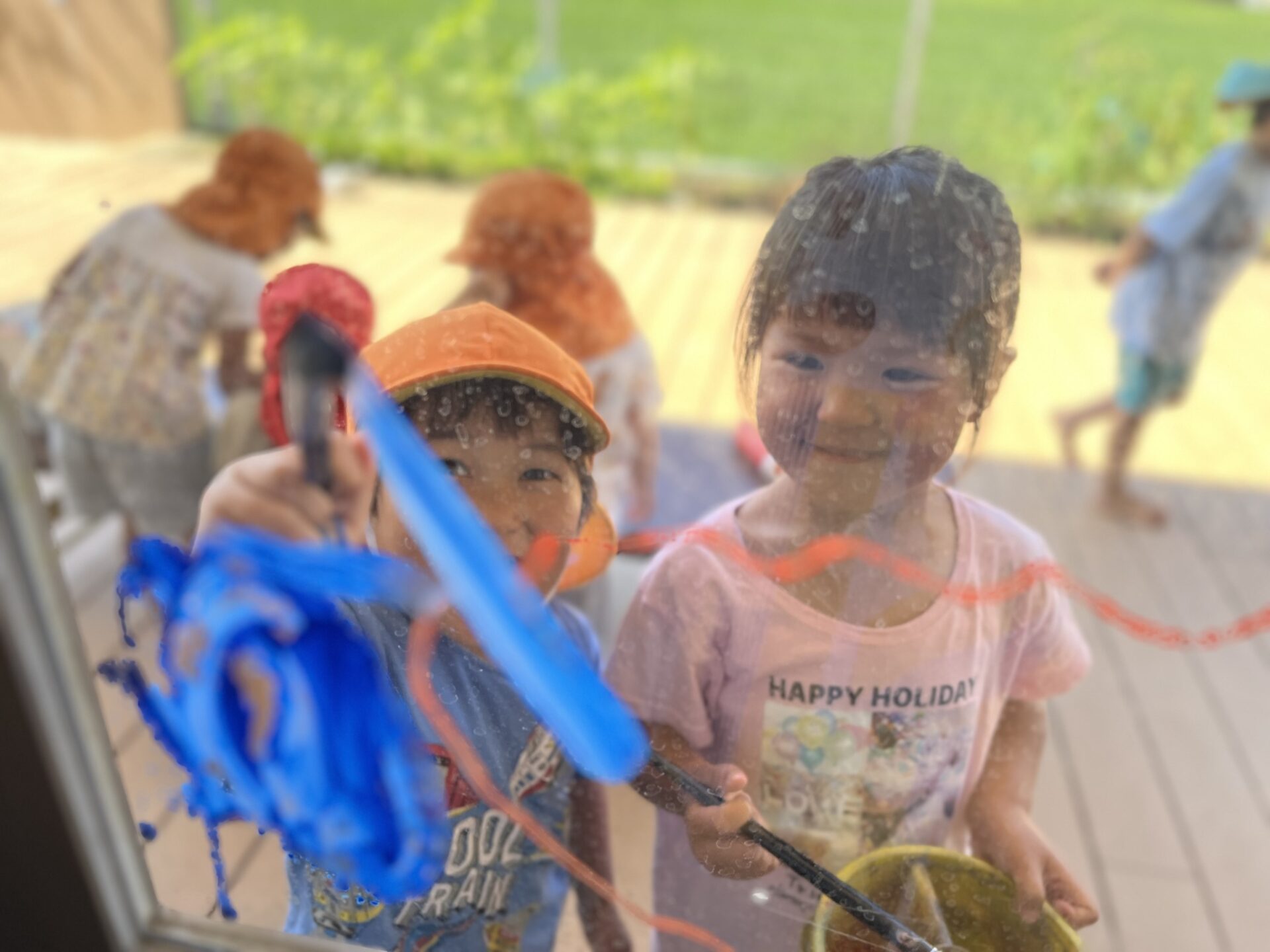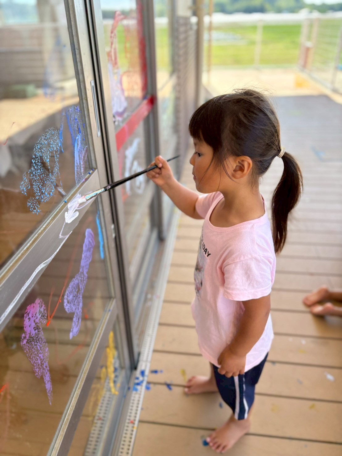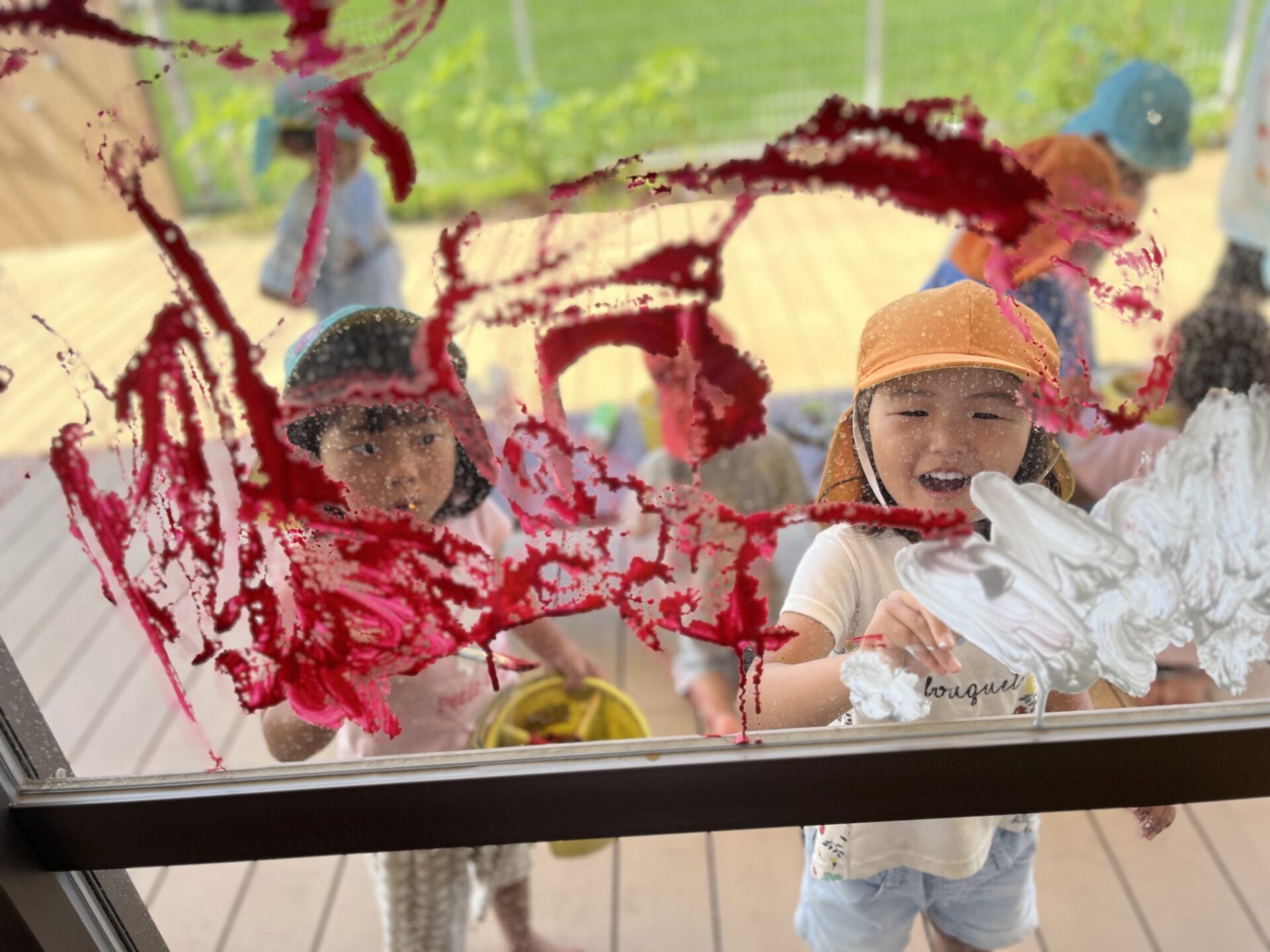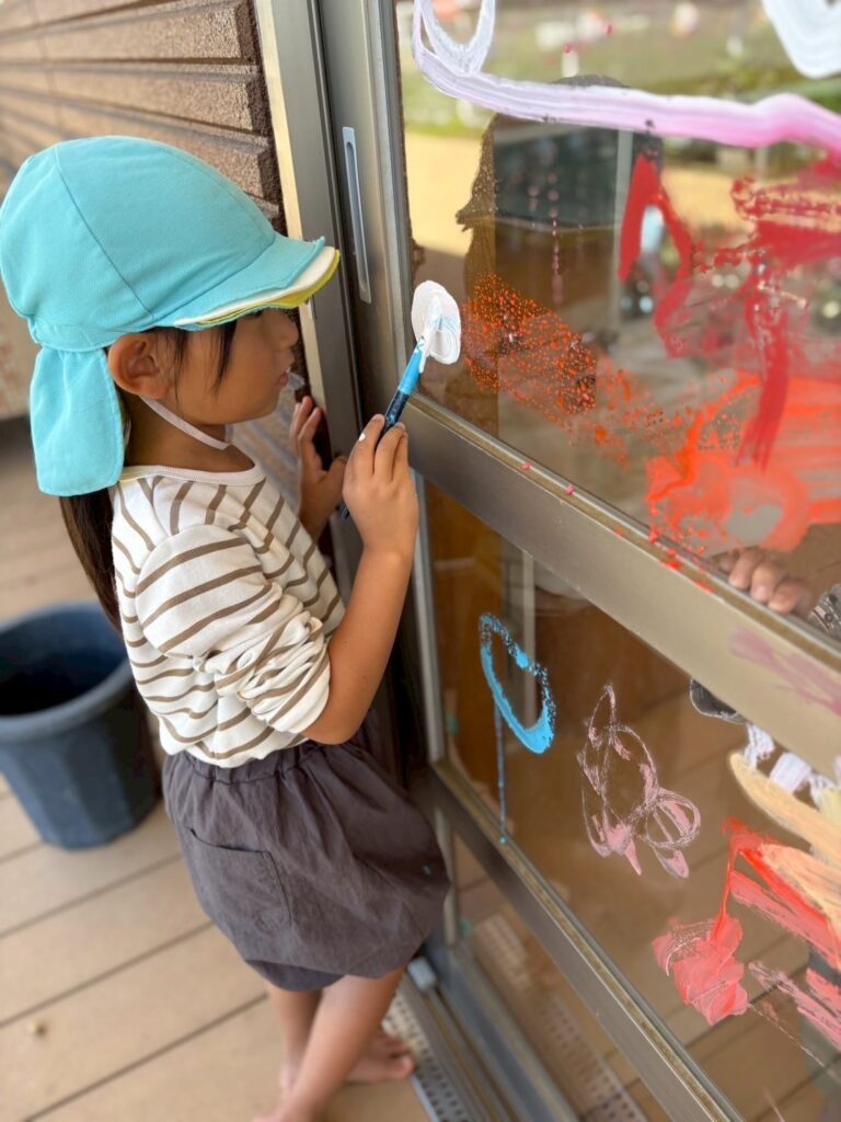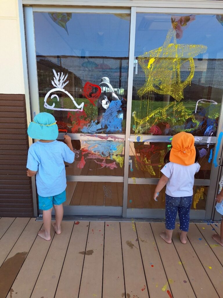 普段は叱られてしまいそうな窓へのお絵描き。はじめは、「ほんとにいいの?」というように、小さく描いたり、そーっと描いている様子でしたが、だんだん楽しくなってきた子どもたち! 大きな絵を描いたり、お友だちとおしゃべりしながら描いたりととても楽しそうにお絵描きをしていました☺