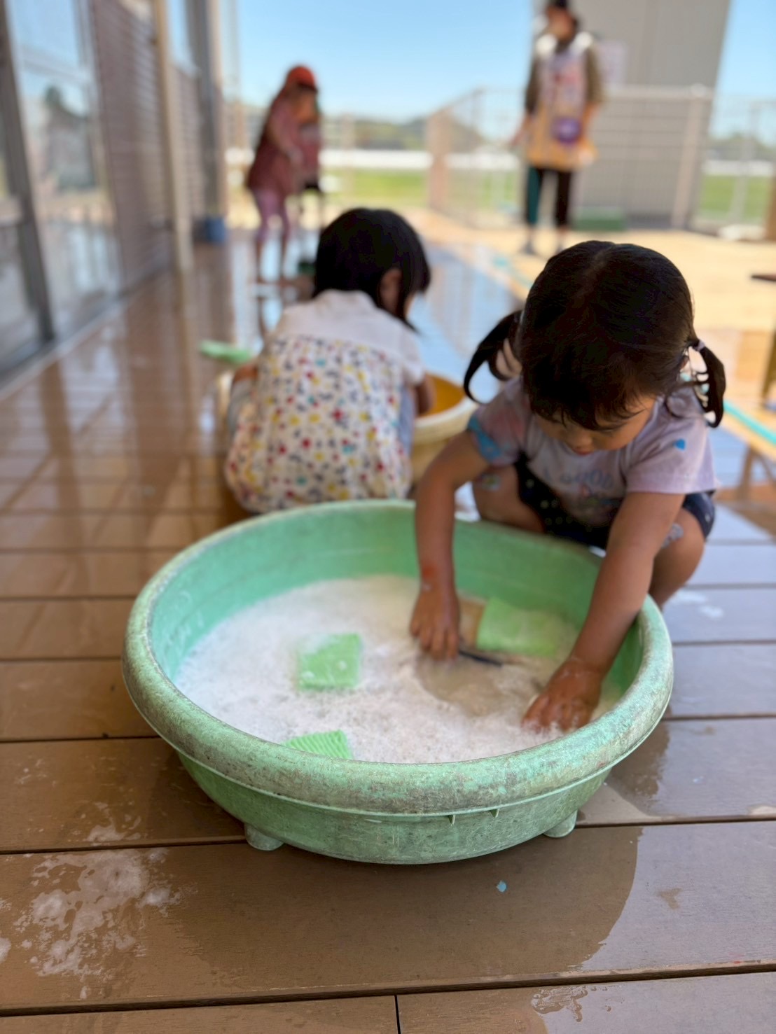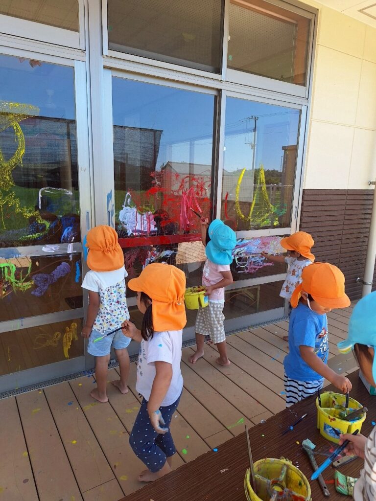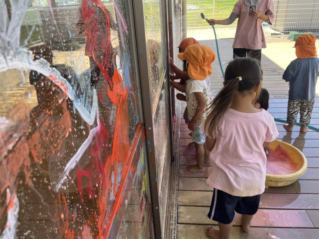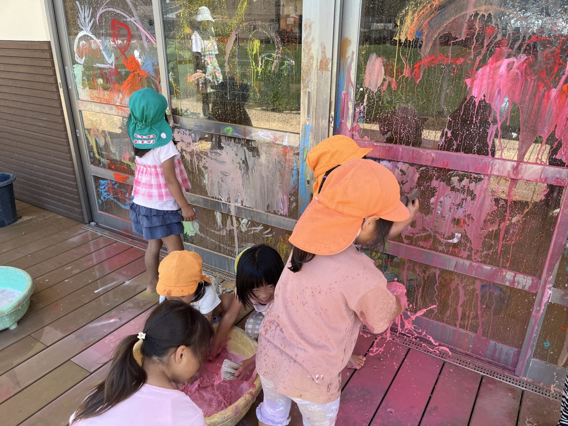 たくさんお絵描きしたあとは、きれいにお掃除!!スポンジやフルーツキャップを使って、窓をゴシゴシと磨いていきます。お掃除中には、水がかかって「つめたい!」「きもちいい!」「ひなだぼっこしてくる!!」とお掃除も楽しみながらしていましたよ!!だんだんときれいになっていく窓✨床に付いた絵の具も最後まできれいに磨いてくれました!