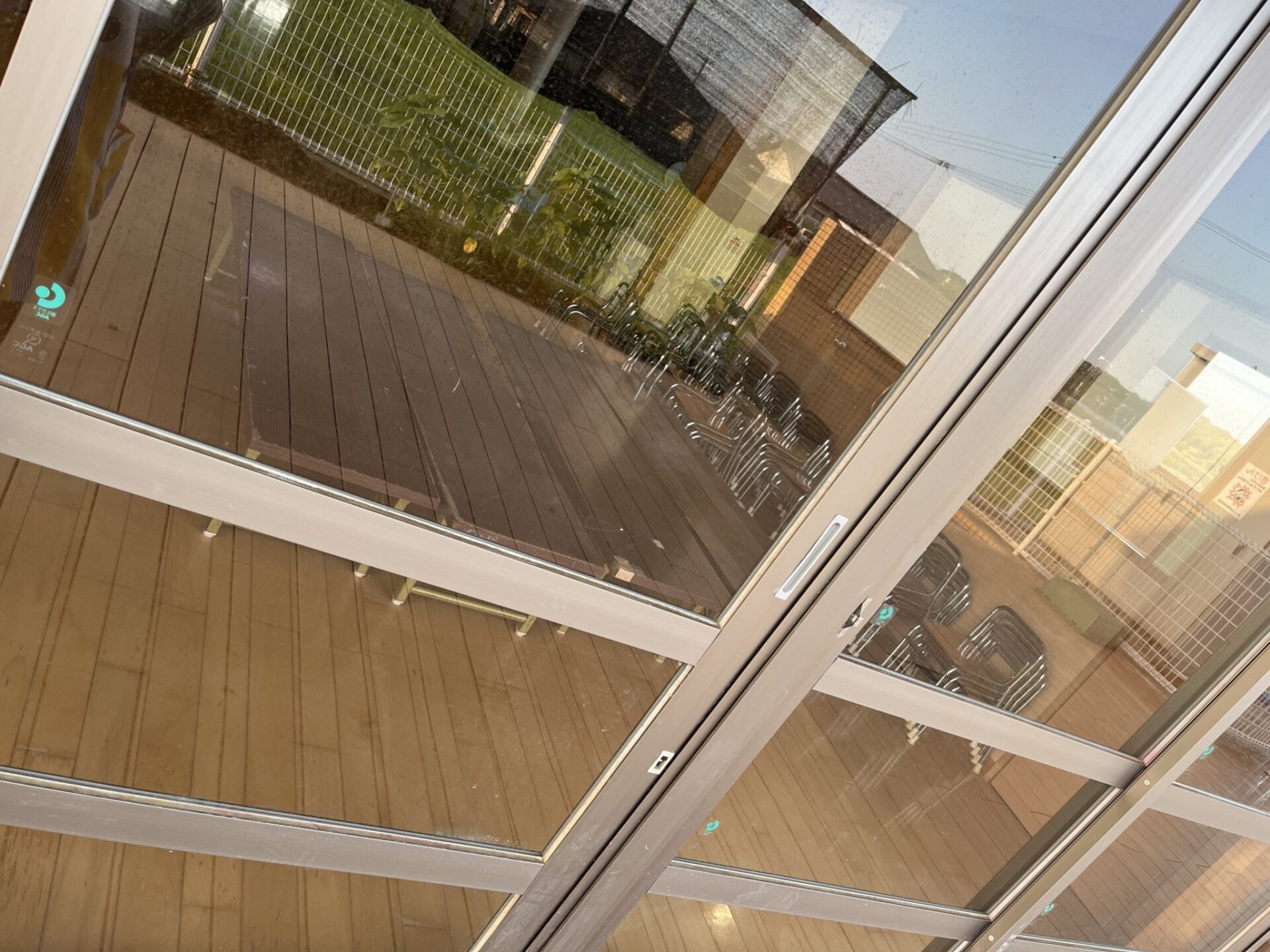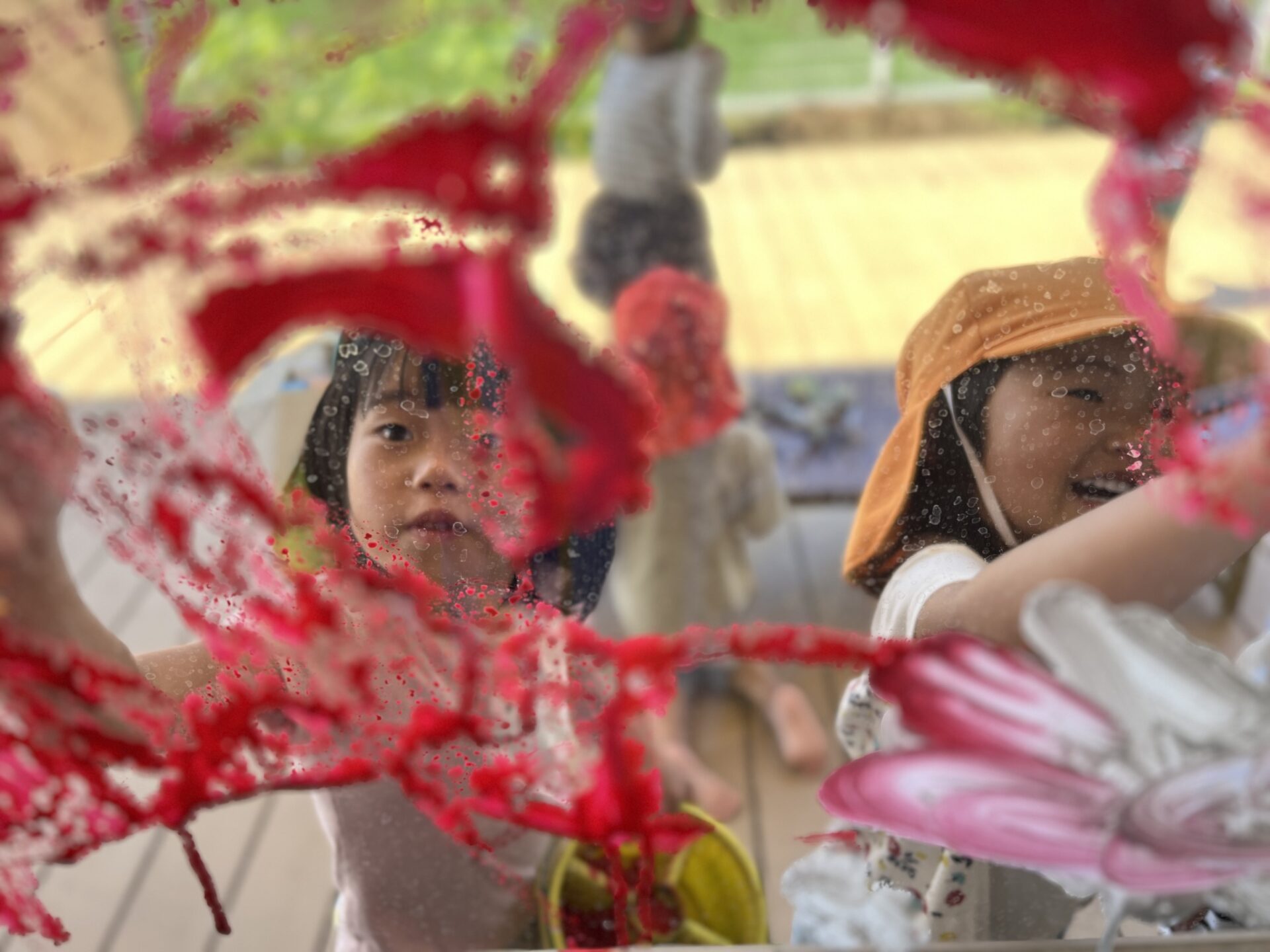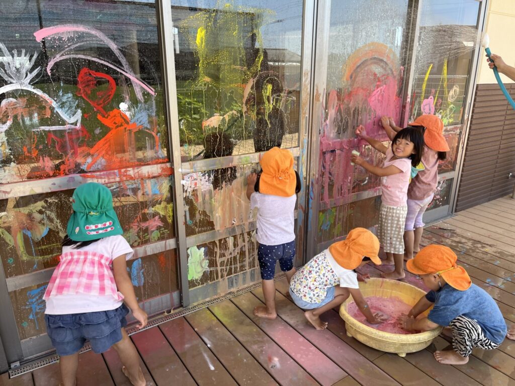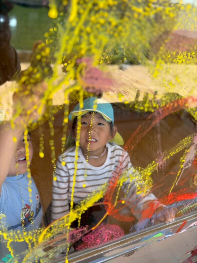 たくさんお絵描きしたあとは、きれいにお掃除!!スポンジやフルーツキャップを使って、窓をゴシゴシと磨いていきます。お掃除中には、水がかかって「つめたい!」「きもちいい!」「ひなだぼっこしてくる!!」とお掃除も楽しみながらしていましたよ!!だんだんときれいになっていく窓✨床に付いた絵の具も最後まできれいに磨いてくれました!