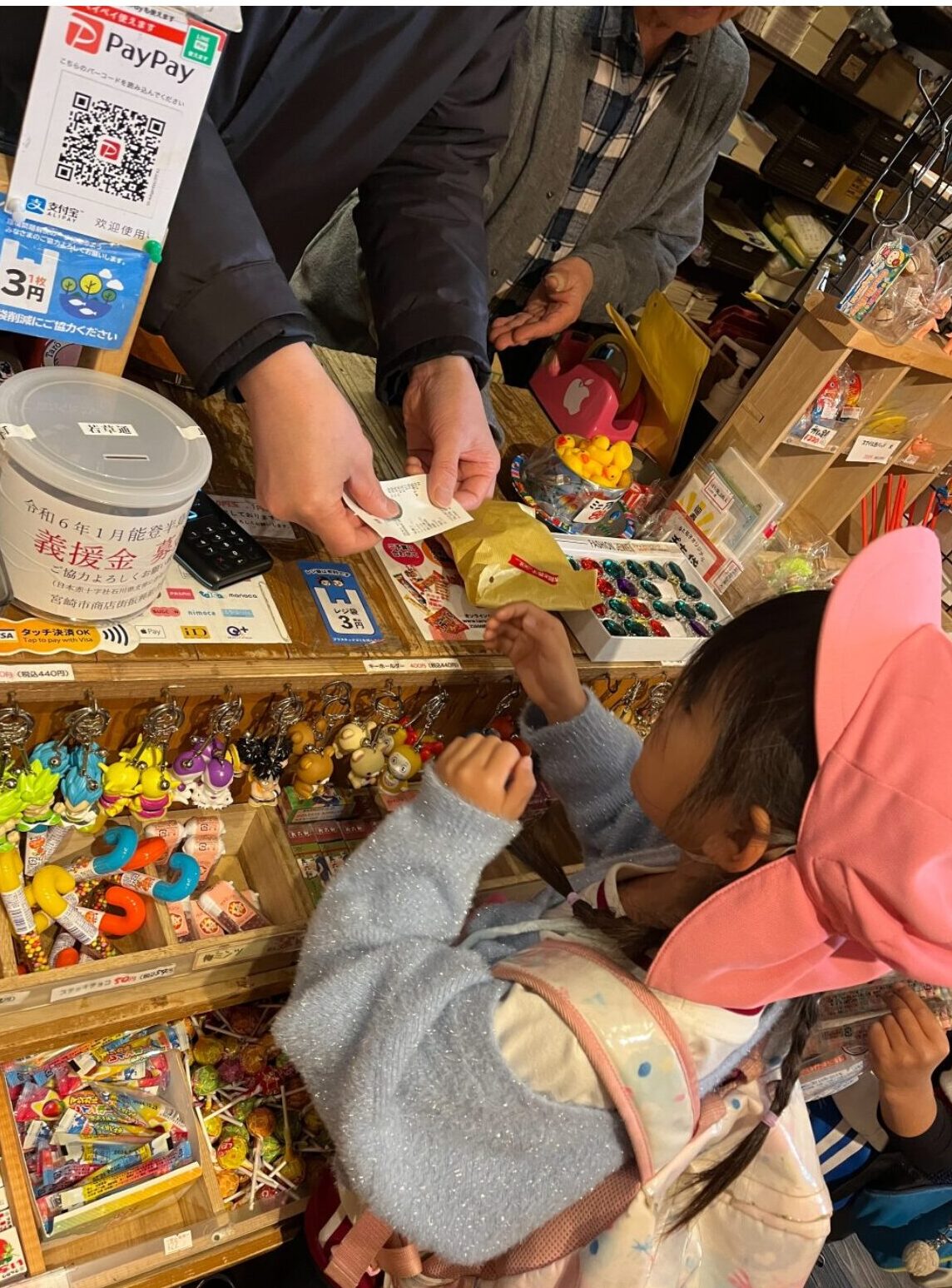 ぐるっぴーを降りて、若草通りにある駄菓子屋さんへ向かいます。自分たちで作った財布には今日のおやつとお昼ごはん代が入っています。