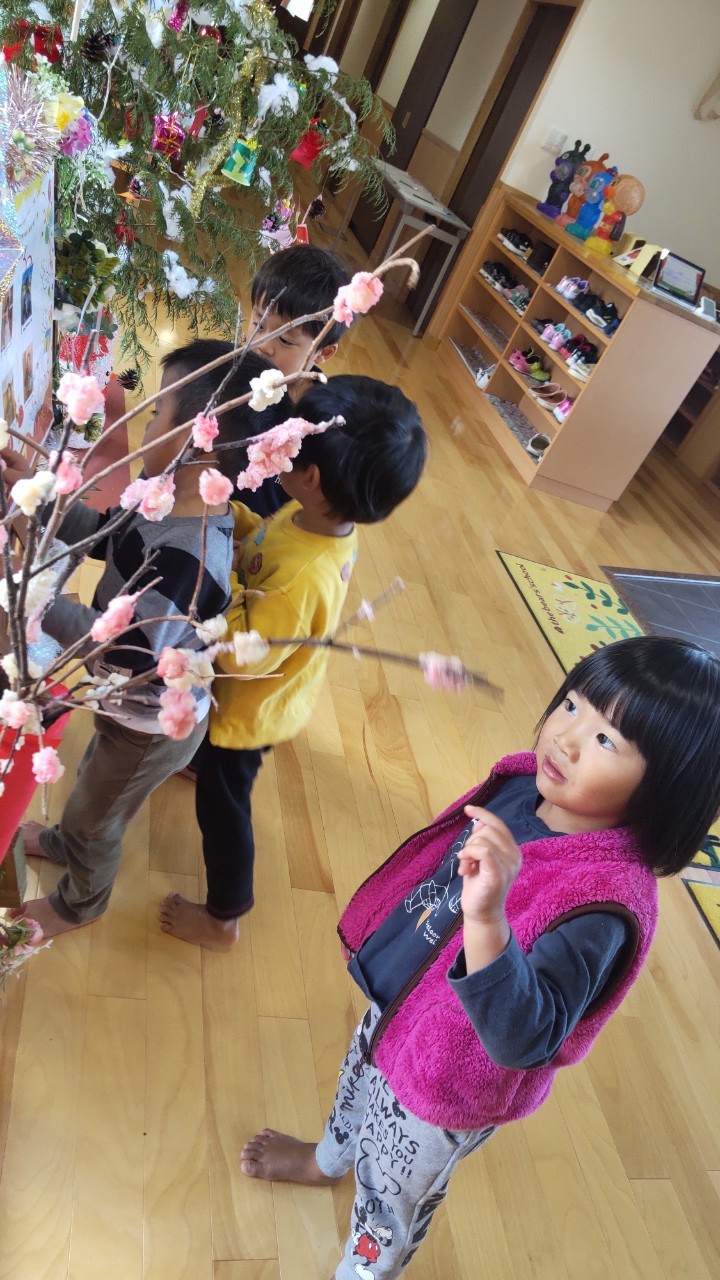 未満児さんはついたお餅を分けてもらい、みんなで色を付けてみたり、丸めて木の枝にくっけて花もちにして見たりと、お餅の感触を楽しんでいます。