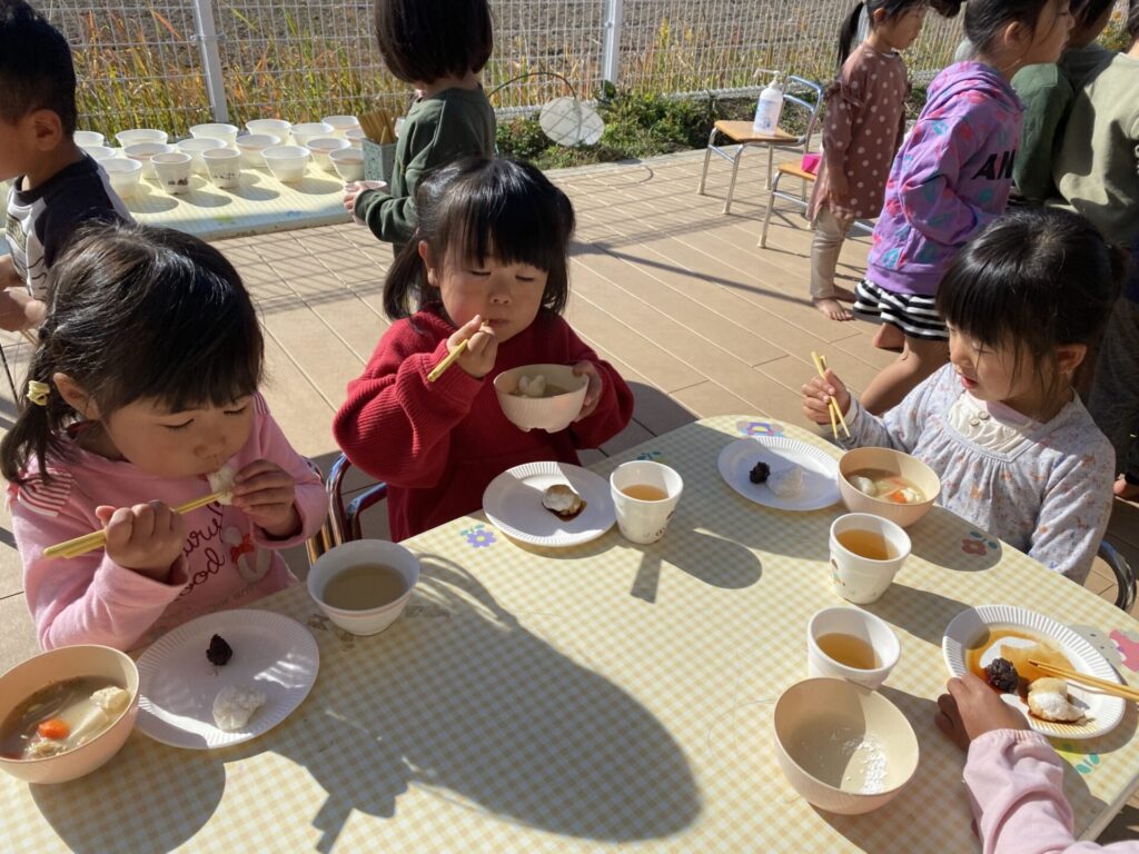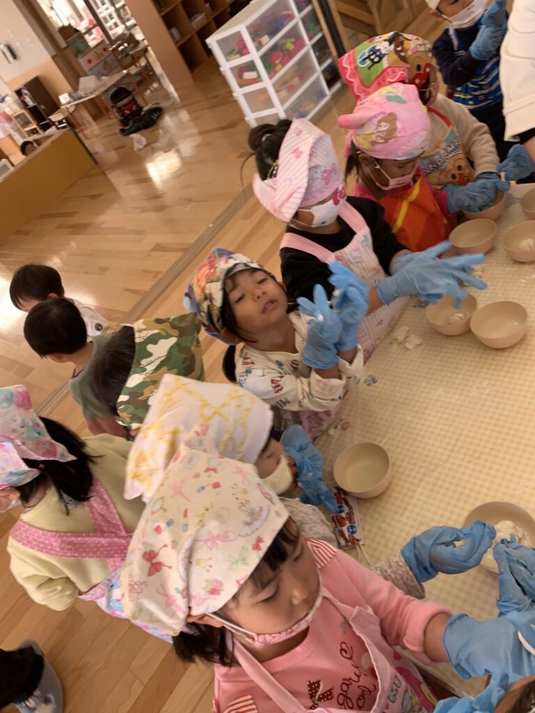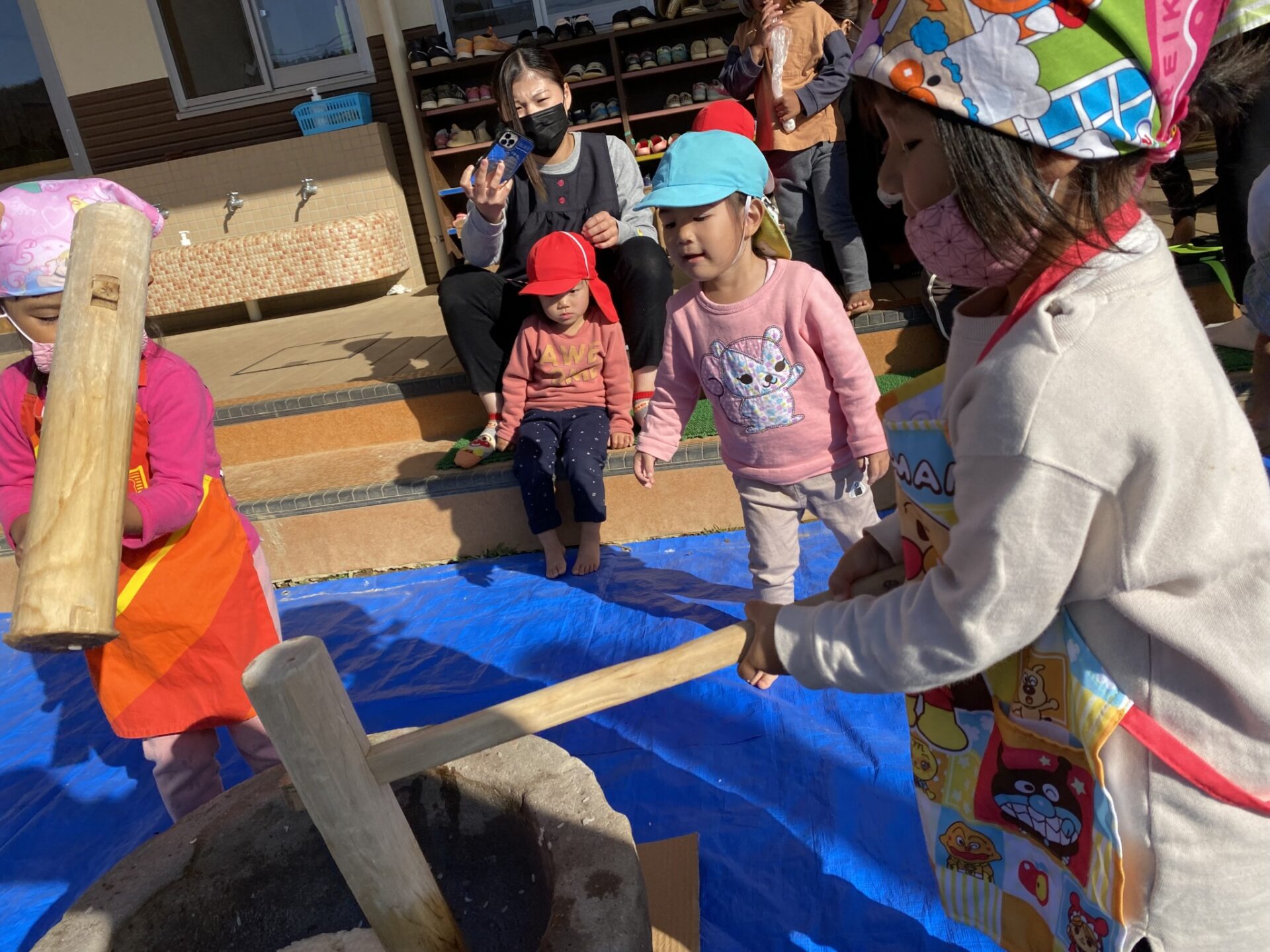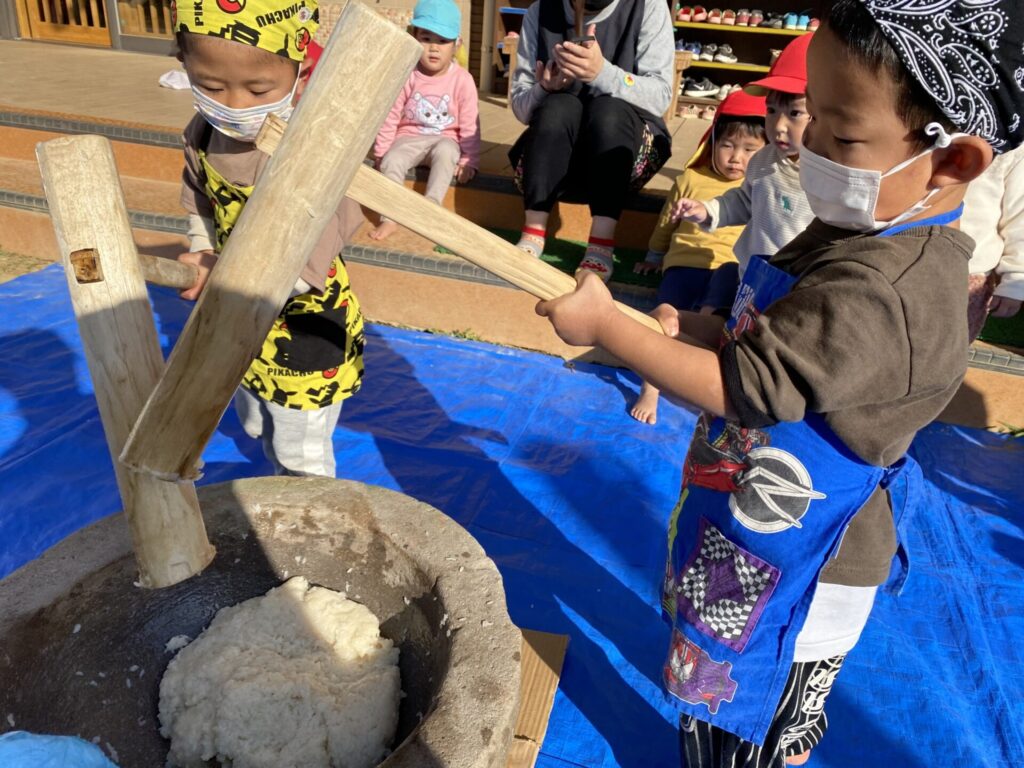 味見をした後はいよいよ、待ちに待った餅つきです。二人一組になって協力してぺったん、ぺったんと元気についています。つき終わったら、野菜を切る班、お餅を丸める班、味付け班に分かれて、おもちとお雑煮を以上児さんみんなで作りました。おもちの味はきなこ、しょうゆ、あんこの三つです。(一番人気はきなこでした)みんなで協力して作ったおもちとお雑煮はとっても柔らかく美味しかったようです。☺