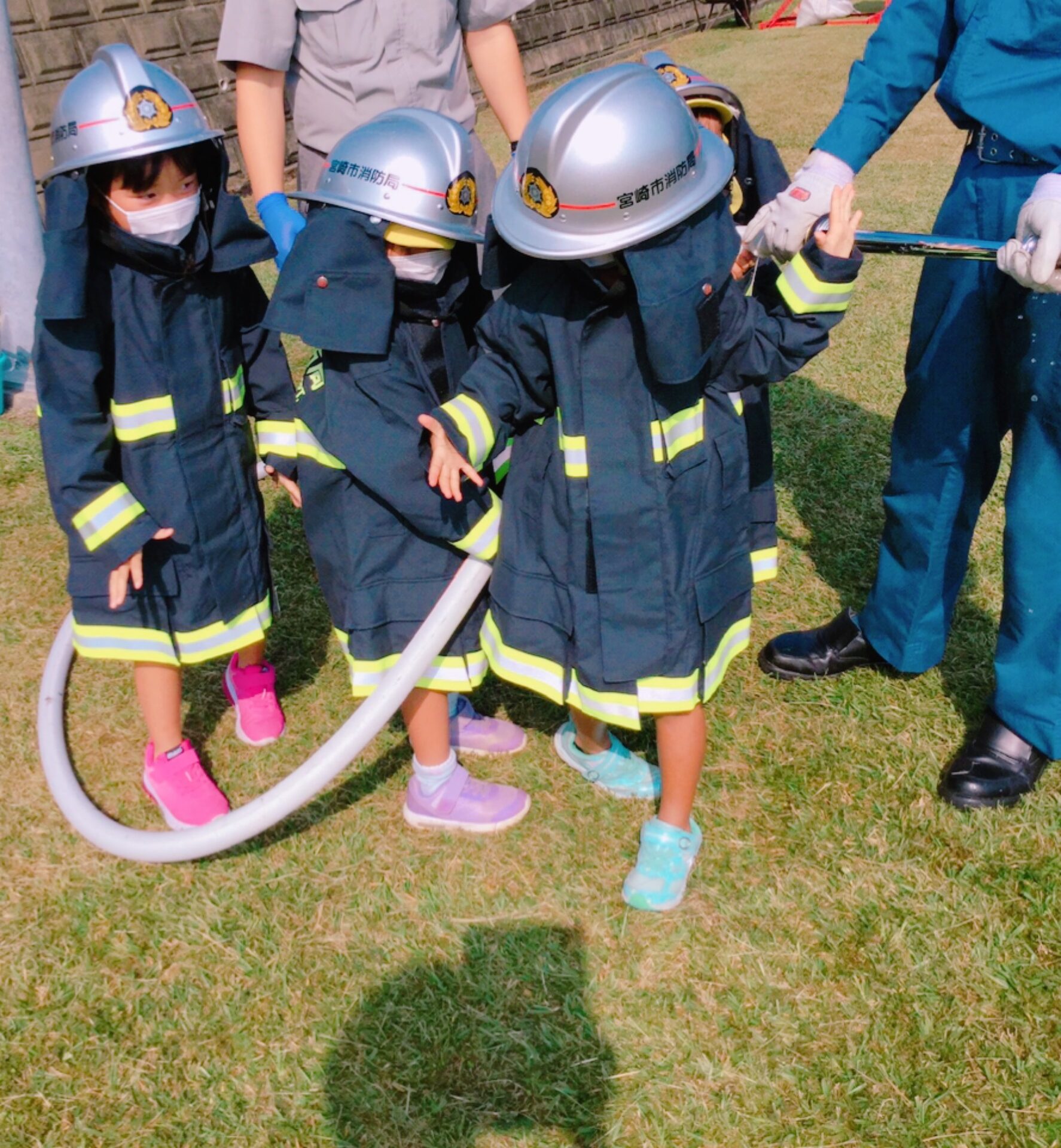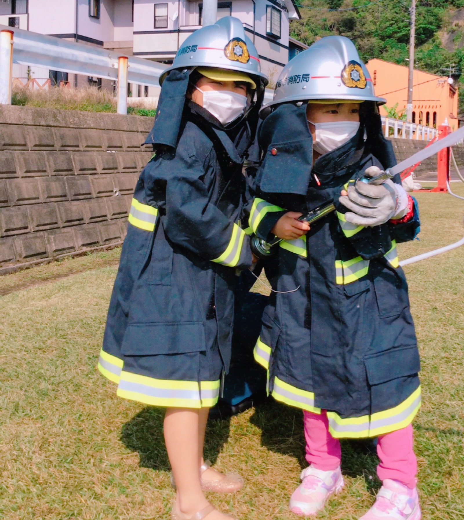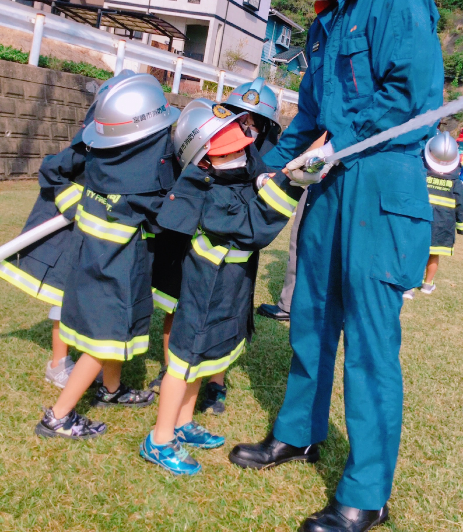 実際に消防士さんの服を着て、放水を体験したりしました。