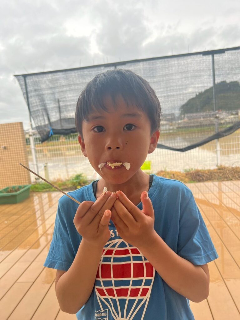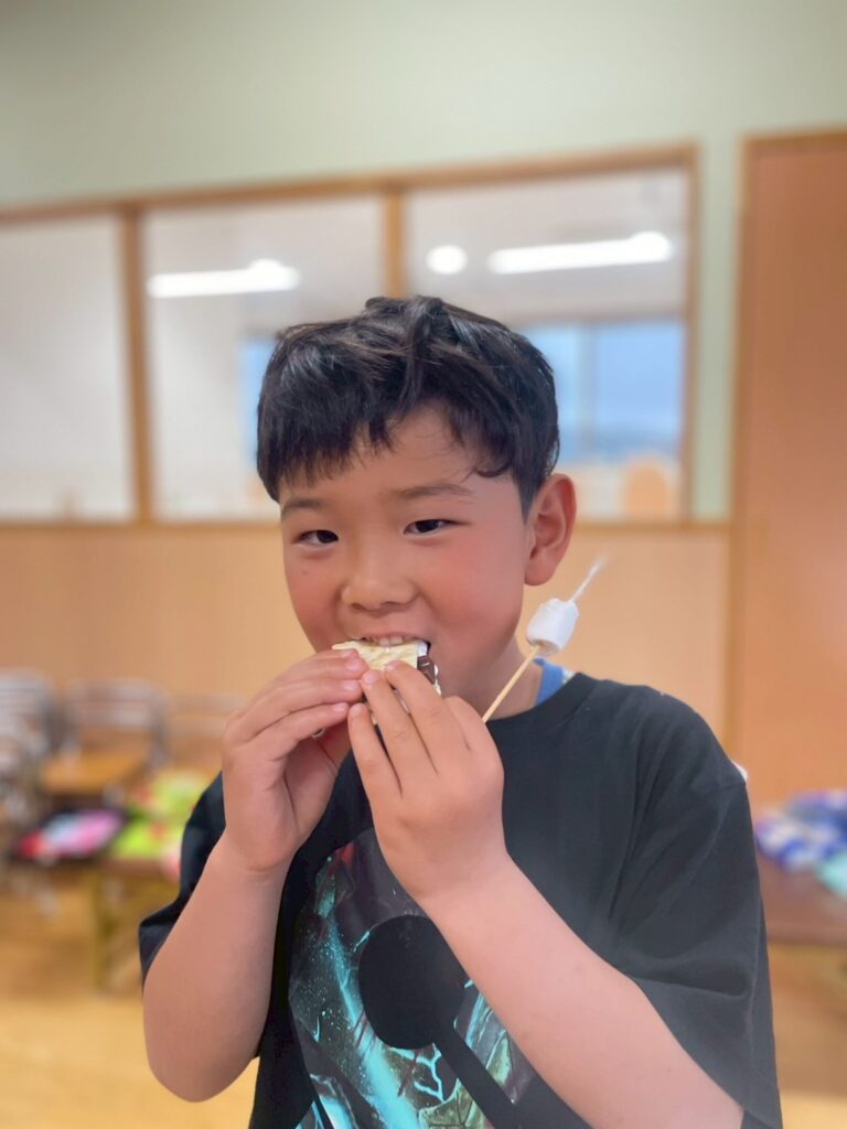 デザートには、年長さんのリクエストのスモアを作りました!マシュマロを焼いて、チョコレートと一緒にクラッカーに挟んで食べると、チョコレートがトロッと溶けてマシュマロがふわふわになって、とても美味しそうに食べていた子どもたちです✨