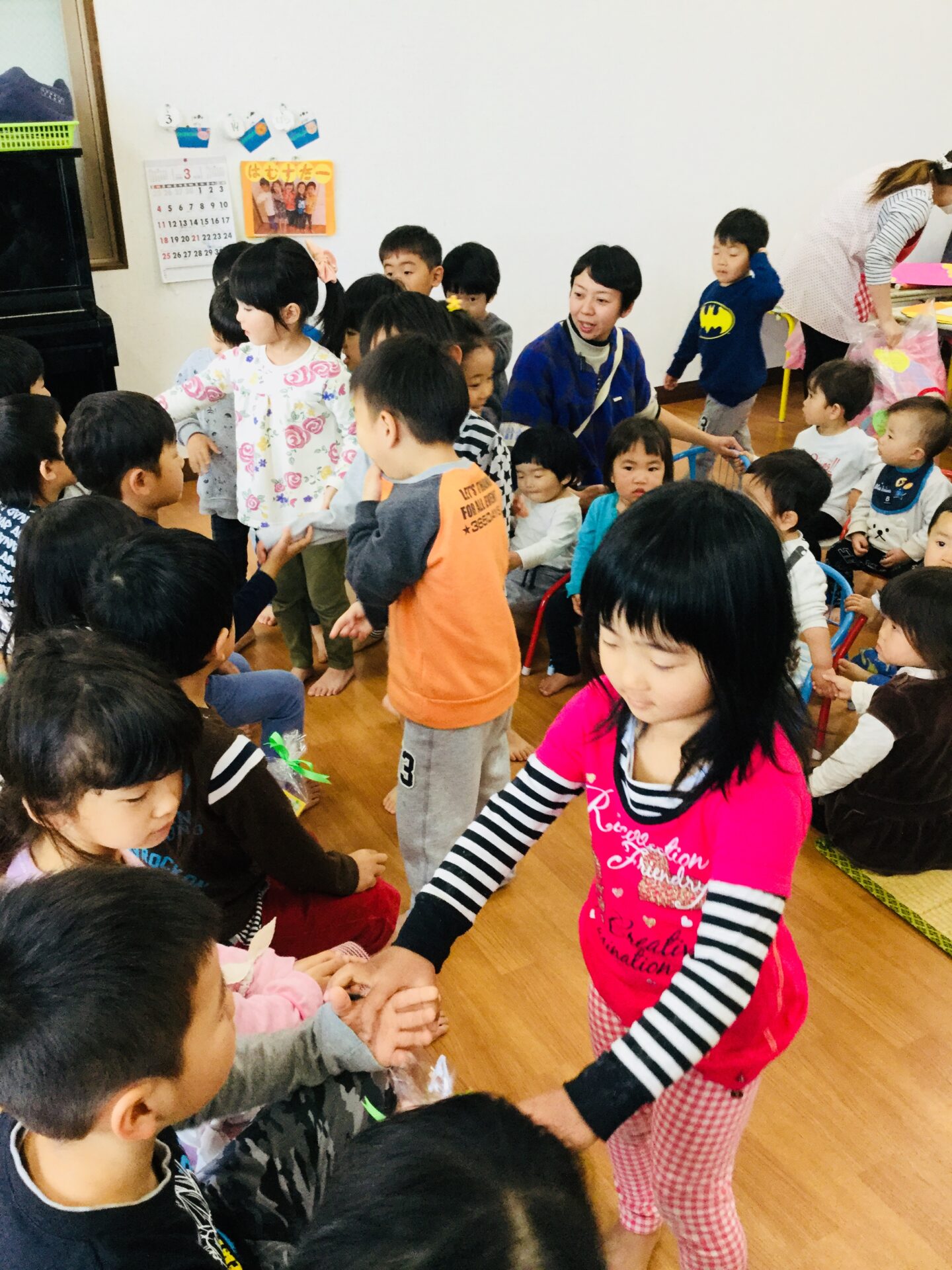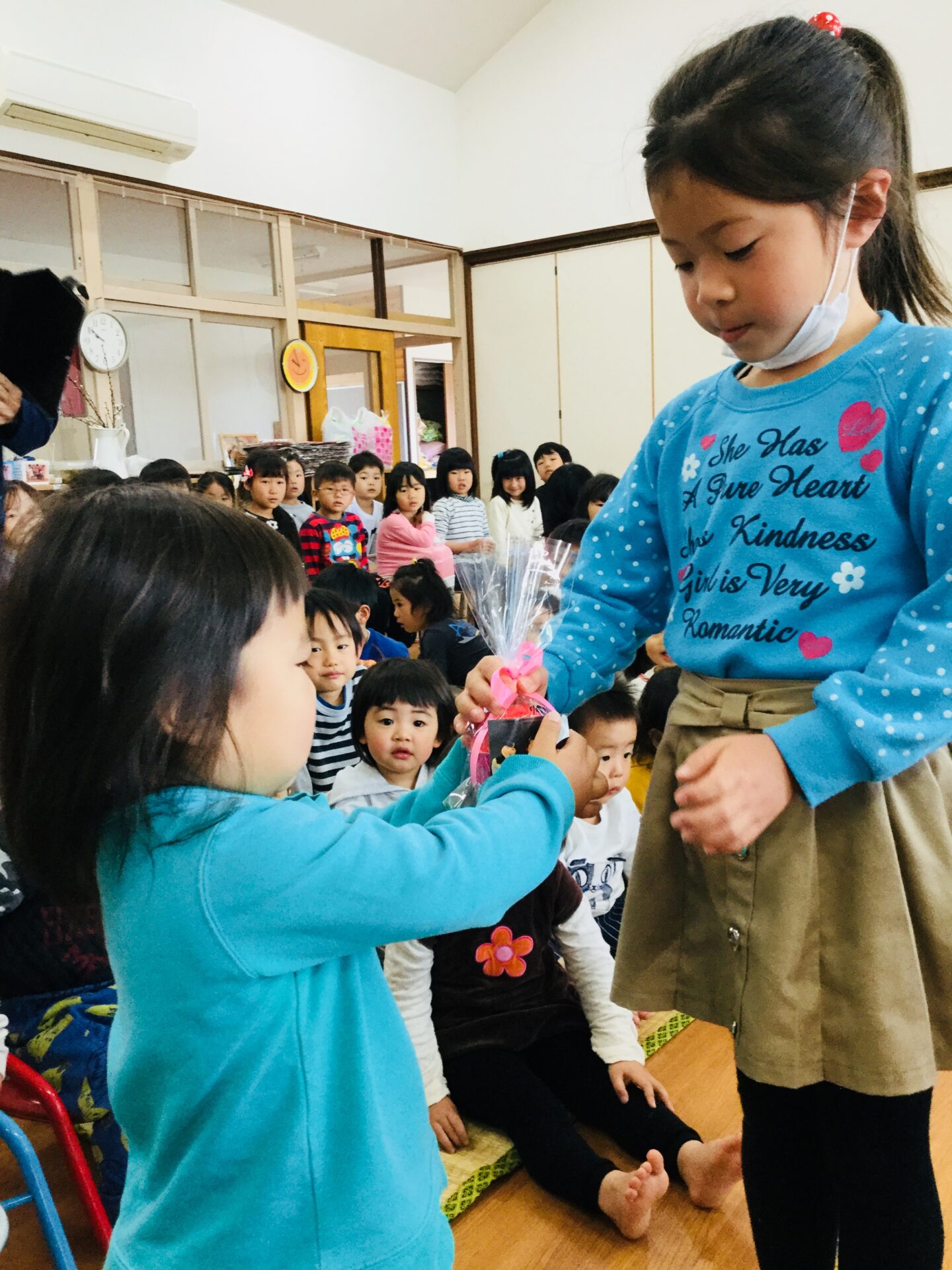 19日はお別れ会でした。いつも一緒に遊んでくれたり、優しく接してくれたれんげぐみさんに感謝の気持ちを込めてプレゼントを渡しました。