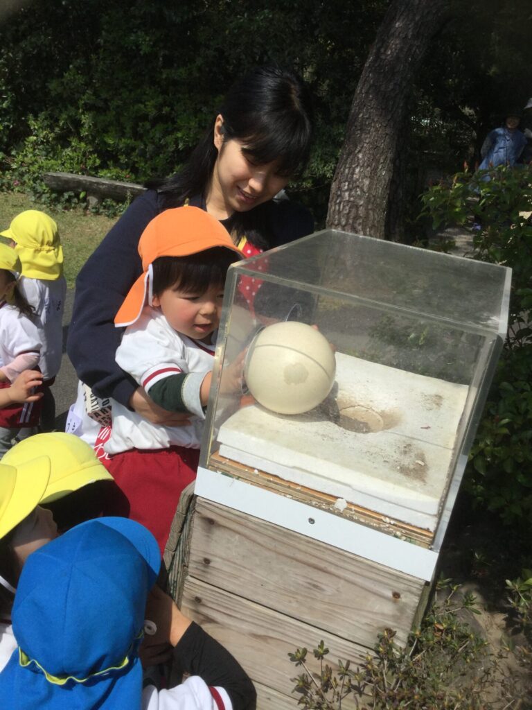 たくさんの動物に大興奮の子ども達。ダチョウの卵の大きさにびっくりしながら触ったり、