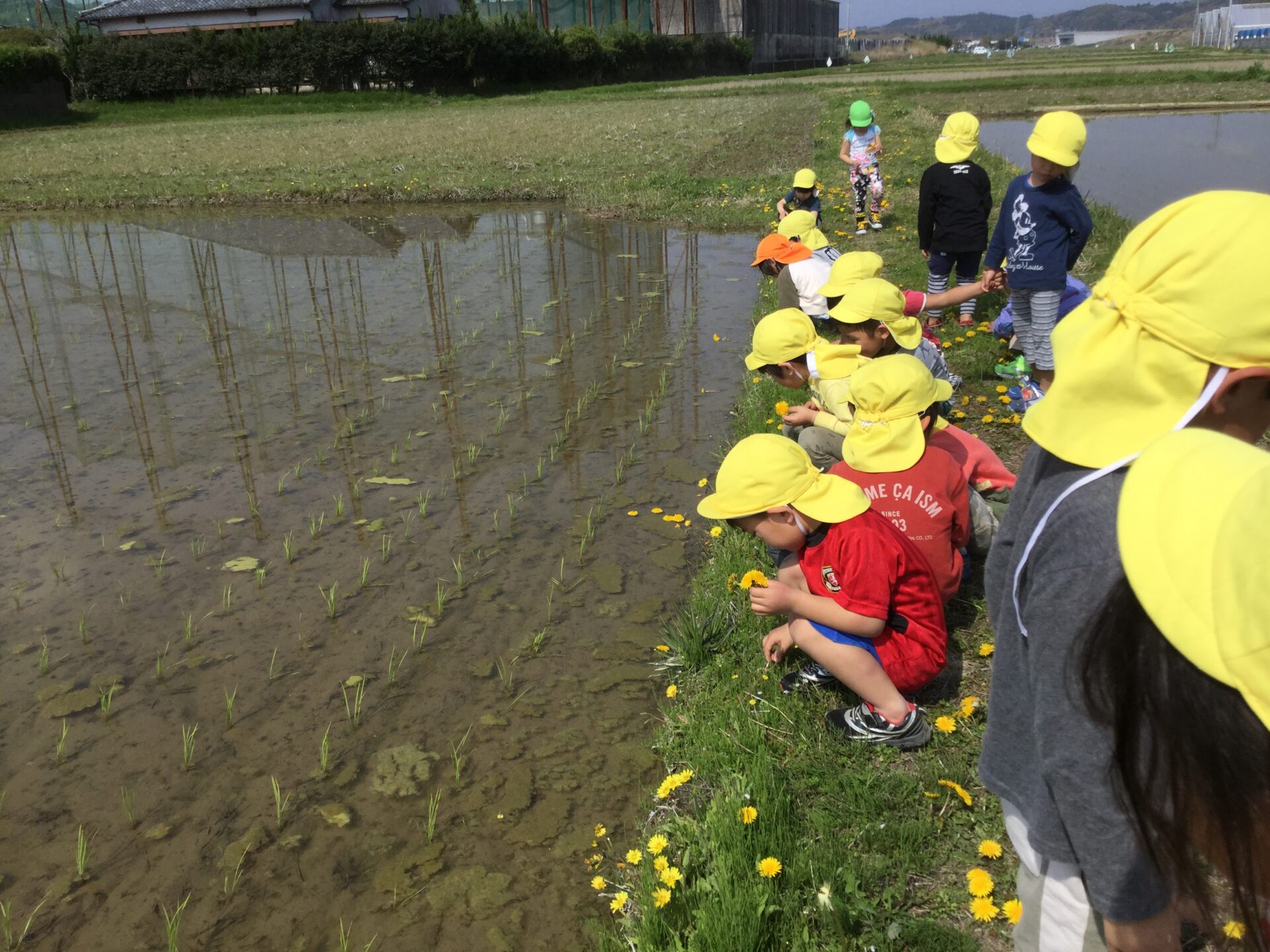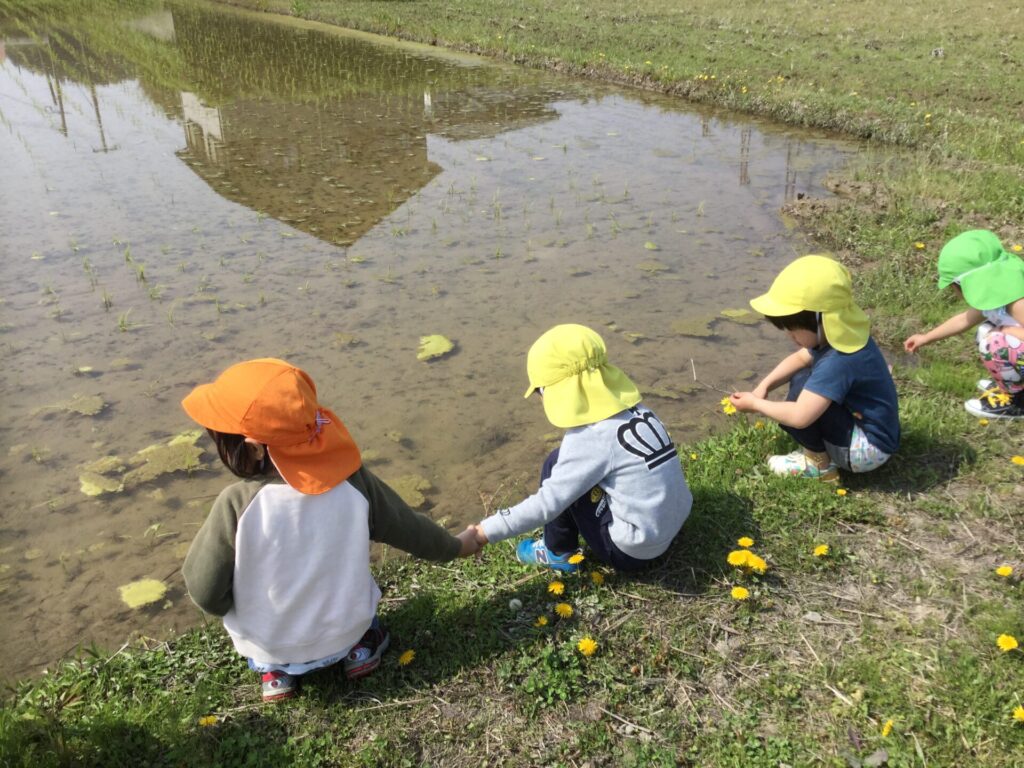 近くの田んぼ道を歩いていると、おたまじゃくしやアメンボも泳いでおり、散歩中に見つけると「先生、いたよ!」