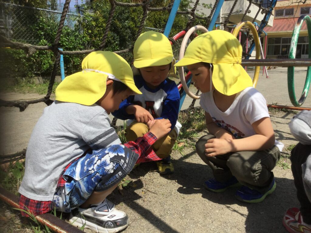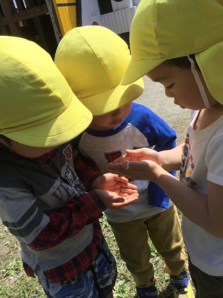 と興奮気味に教えてくれます。また、てんとう虫を見つけてお友だちと観察したりと満喫しています。