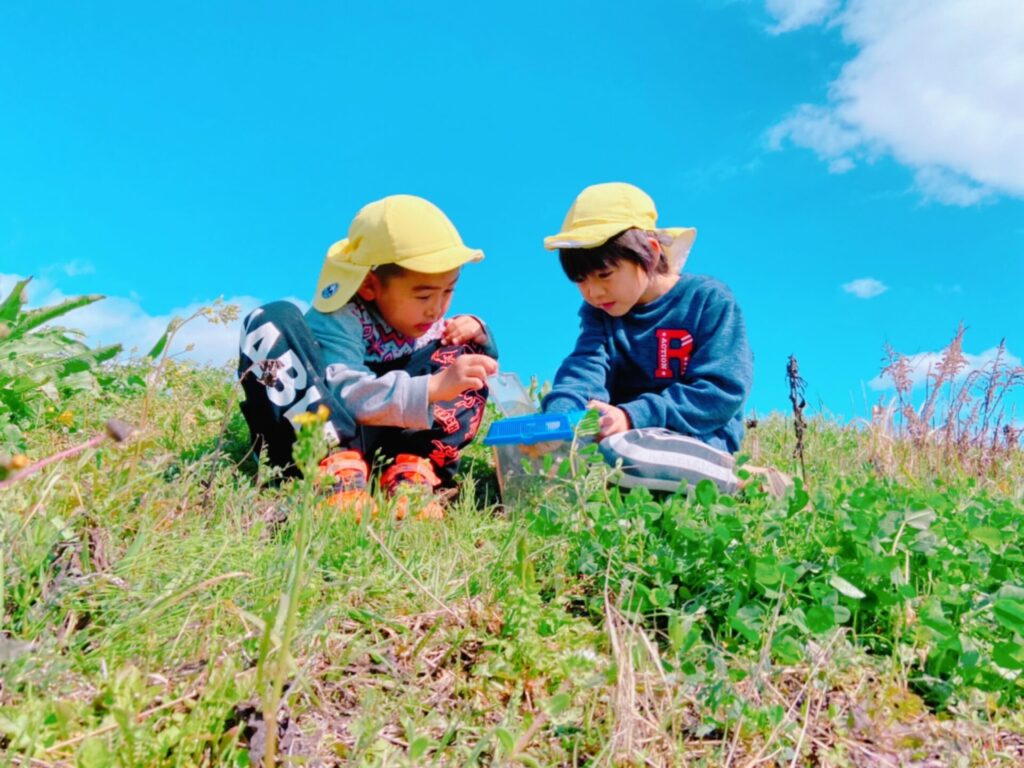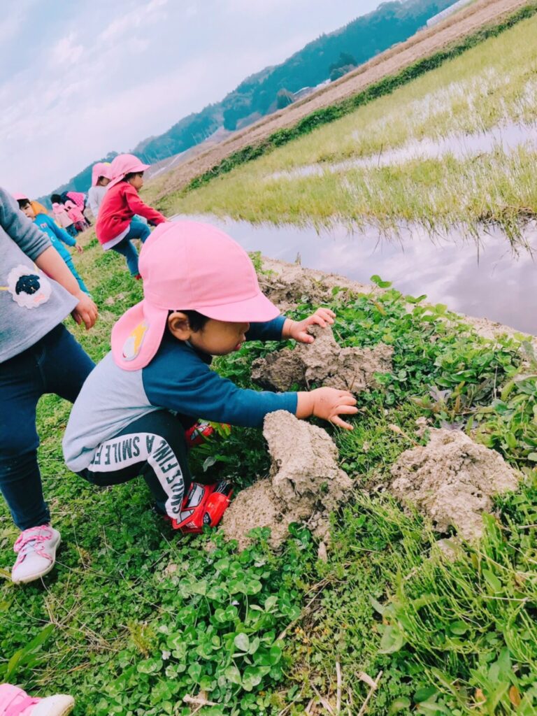 田んぼではおたまじゃくしなどが泳いでる姿を見るようになり、子ども達は興味津々♪