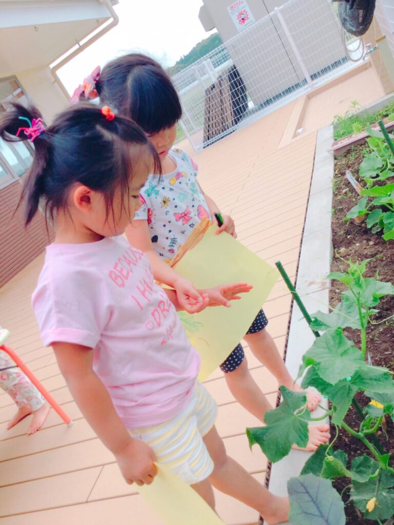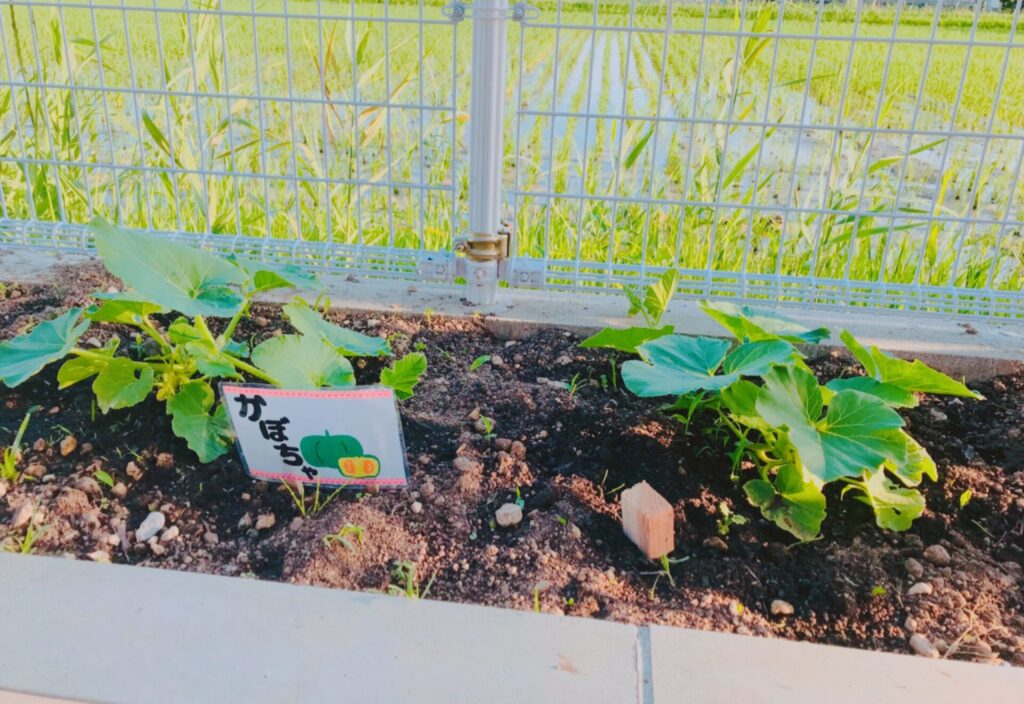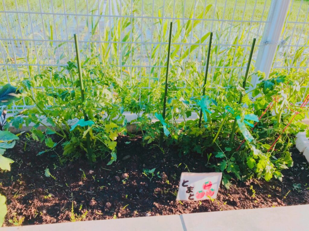 子ども達も野菜の成長を喜んでおり、水やりをしたり草抜きをしたりとお世話をしています。