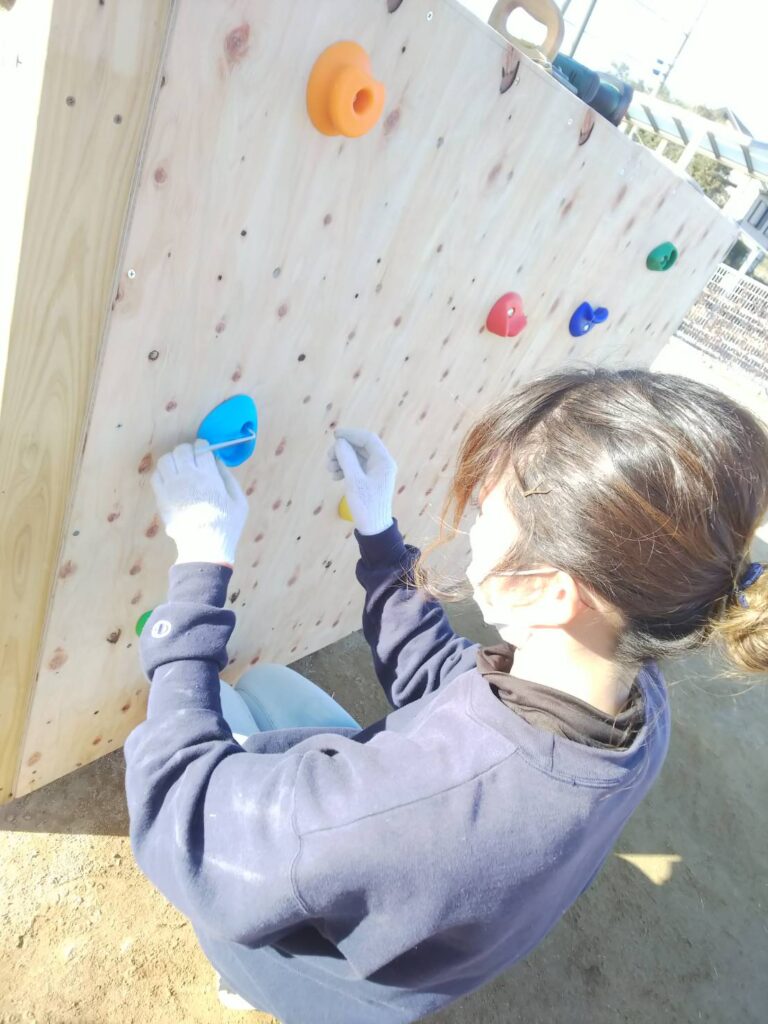子ども達も出来上がったボルダリングを見て、「これなーに?」「すごーい」